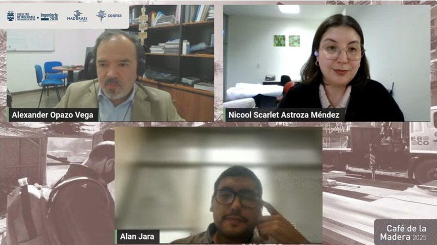 Alexander Opazo, académico del Depto. de Ing. Civil y Ambiental y director del Doctorado en Ingeniería, UBB; Nicool Astrosa y Alan Jara, estudiantes de postgrado UBB – Rueda de preguntas en 4to Café de la Madera de Madera21.