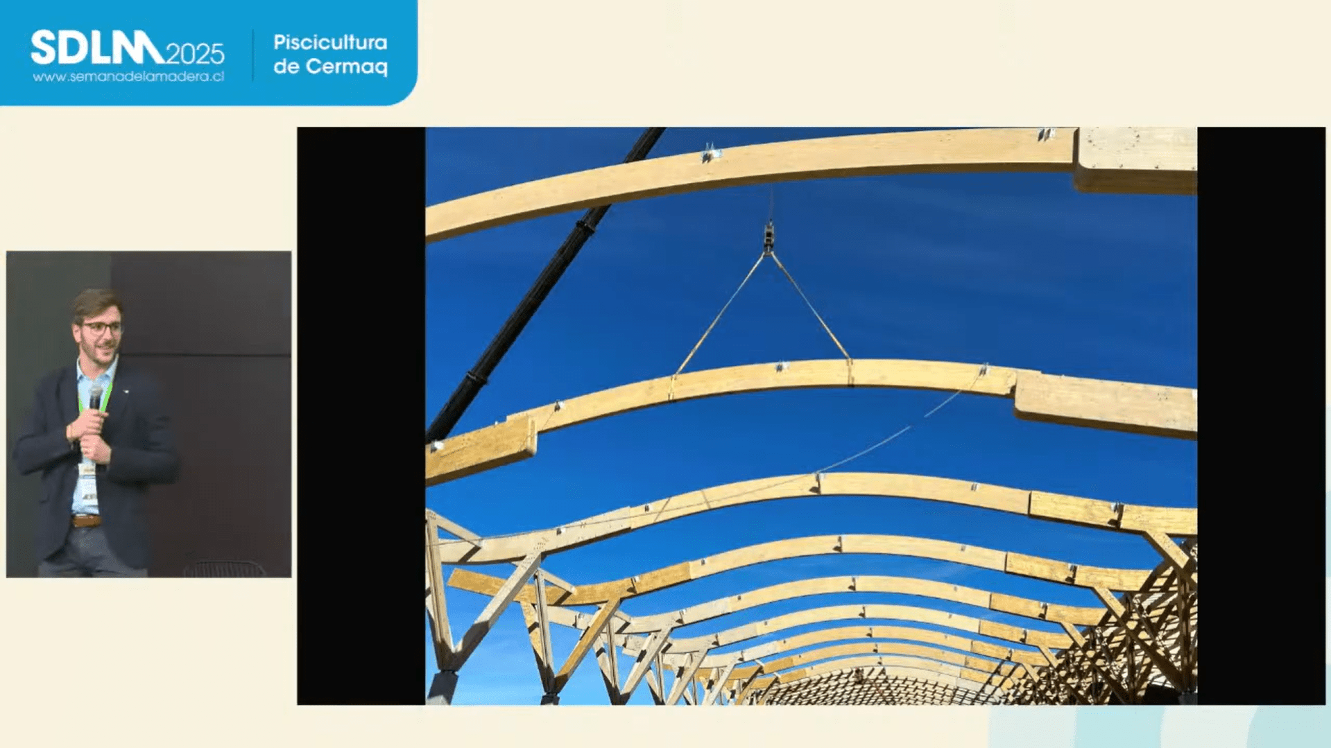Domingo Sáenz explicó que el trabajo con prototipos fue determinante. “Arauco hace un mock-up”, comentó, mostrando imágenes del prototipo que permitió validar las dimensiones, la logística de transporte y las uniones antes de iniciar la fabricación en serie. De ese modelo surgieron los 140 soportes de madera laminada que sostienen los arcos principales del edificio.