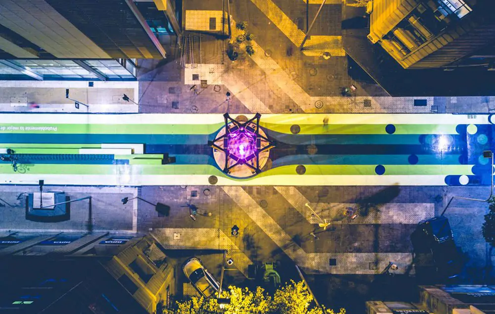La obra muestra su potencia por la noche, cuando activa su sistema dispuesto en el hexágono, figura geométrica que es la base del árbol. Ese mecanismo sustenta el concepto de “paseo sostenible”, reforzado en esta etapa que también incluye la instalación de bicicleteros y jardineras.