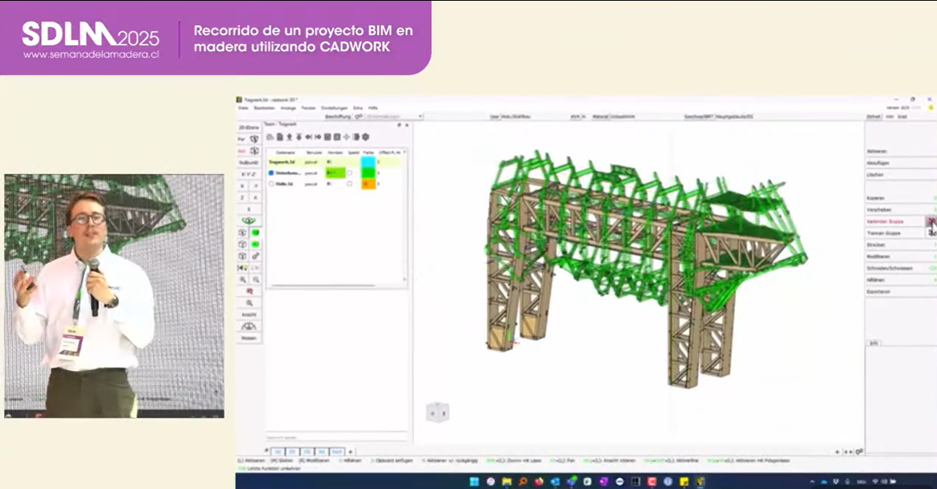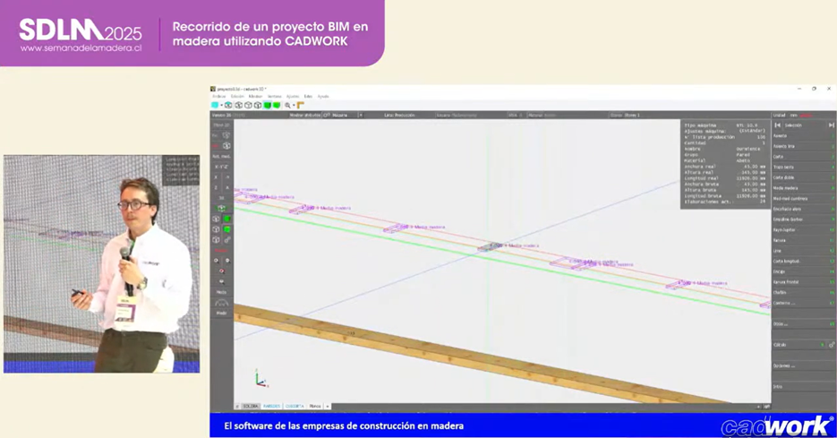 Alexander Wenzel, representante técnico y comercial de Cadwork en Ibérica y Latinoamérica, presentó los fundamentos de este software de diseño que fue inspirado hace 40 años en la precisión de los relojes suizos. La filosofía central es que «modelamos lo que vamos a construir», garantizando que una correcta modelación resulte en una ejecución correcta en los mecanizados y montaje de las estructuras. Cada pieza de madera maneja información BIM detallada (nombre, dimensiones, número de producción).