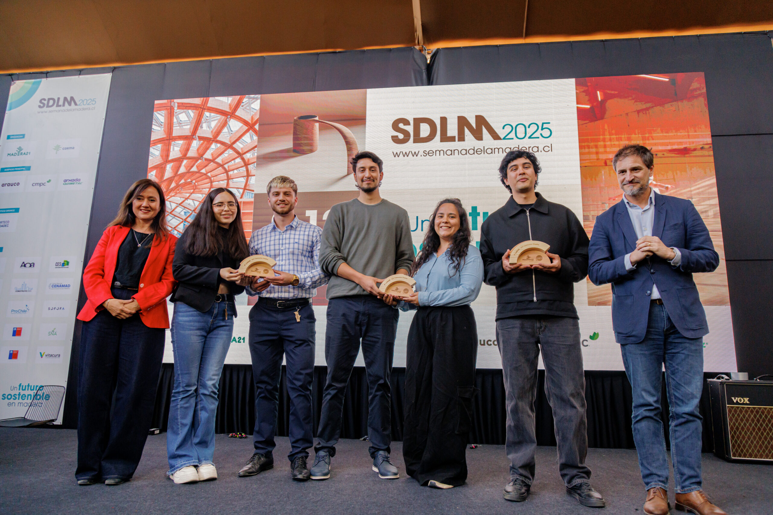 Ganadores XIV Concurso de Diseño; Sebastián Amaral, director Concurso Diseño 2025; Carolina Hurtado, Gerenta de Madera21 de CORMA