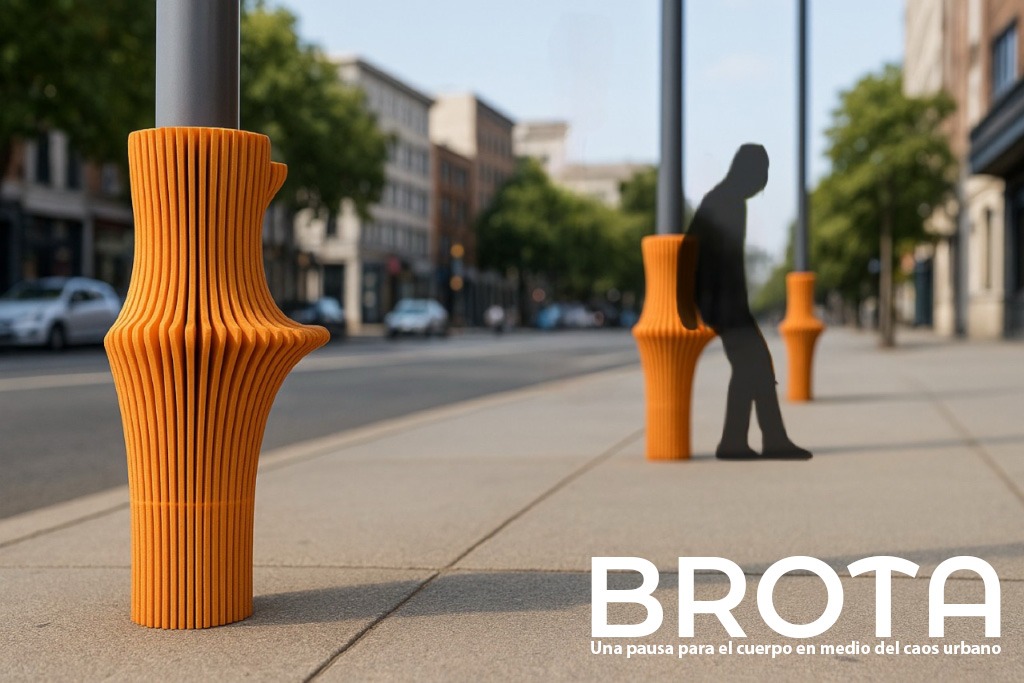 El tercer lugar recayó en Marcela Aguilera y Carlos Acosta, de la Universidad Mayor, guiados por la profesora Ariane Álvarez. Su proyecto, BROTA, convierte los postes de alumbrado público en un soporte urbano activo, capaz de ofrecer descanso breve a quienes transitan por la ciudad. Su forma envolvente abraza el poste sin ocupar superficie adicional, generando un punto de apoyo accesible para personas que experimentan fatiga, mareos o simplemente necesitan detenerse unos minutos.