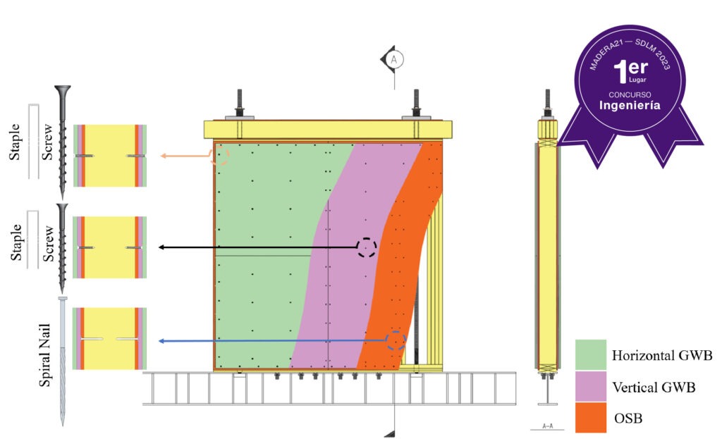Testing of Strong Multi-layered Wood Frame Shear Walls with Non-structural Layers de Diego Nicolás Valdivieso Cascante, como profesor guía Diego López-García González y Pablo Guindos Bretones. Universidad de Chile.