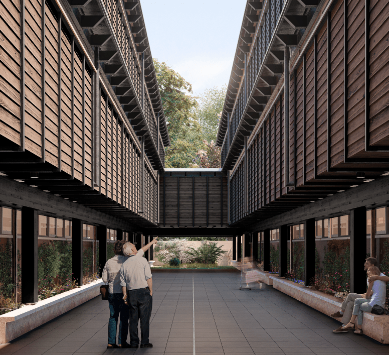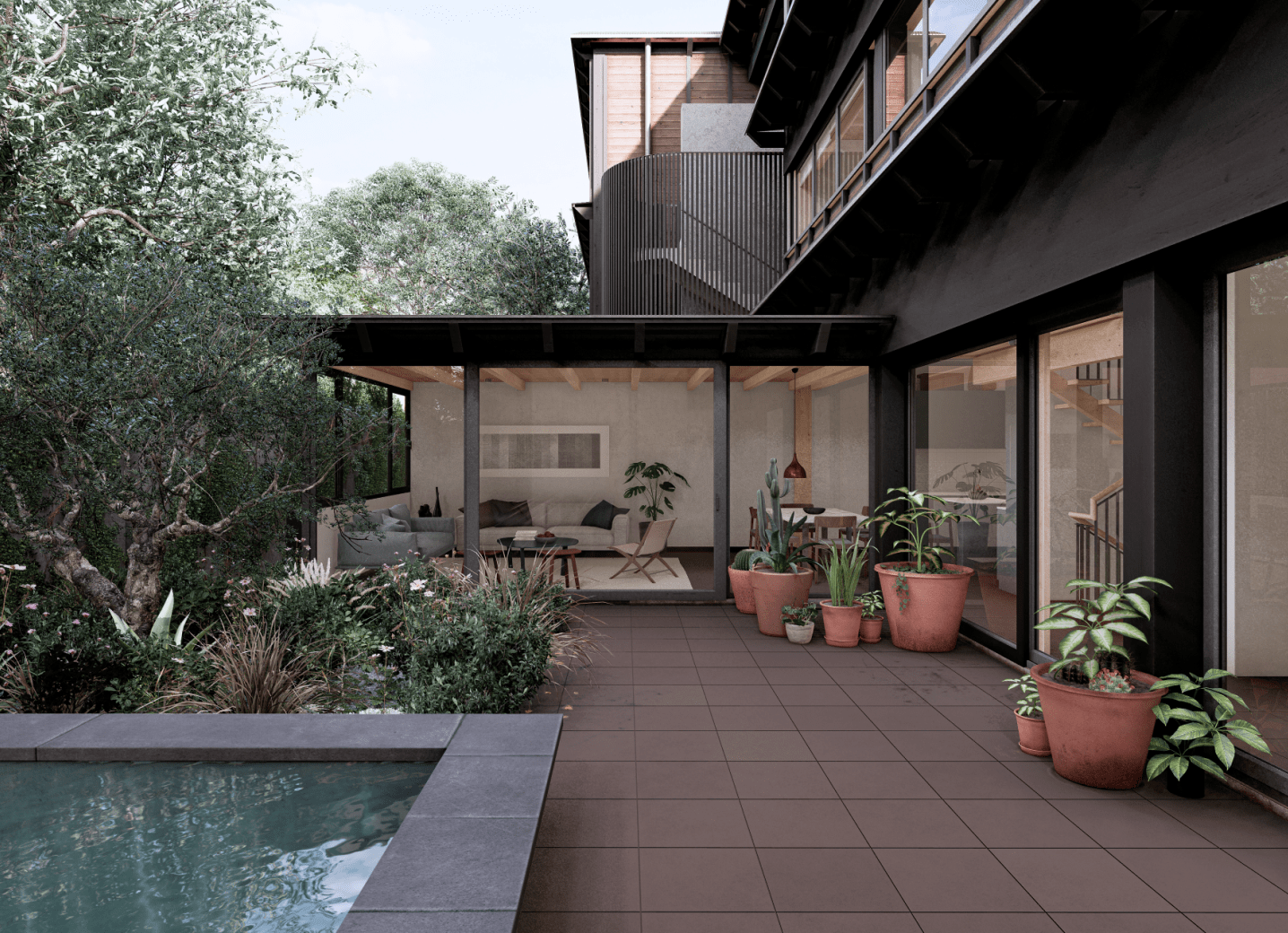 La obra propone tres modos de habitar: unidades que se relacionan con el suelo, otras que orbitan en torno al patio y un tercer nivel que se abre al cielo, con terrazas y azoteas. Esa diversidad programática convive bajo una forma arquitectónica sobria, donde la complejidad interior se expresa sin ostentación hacia el exterior.