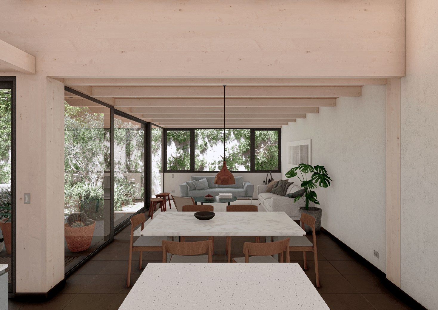 Resolver esa contradicción requirió un trabajo minucioso de diseño y ensayo. El equipo debió encontrar la manera de mantener la continuidad estructural, pero al mismo tiempo interrumpirla para las barreras de humedad, vapor y sonido. Esa búsqueda implicó meses de desarrollo y pruebas, con un alto nivel de iteración en las juntas y un cuidado extremo en los encuentros entre elementos.