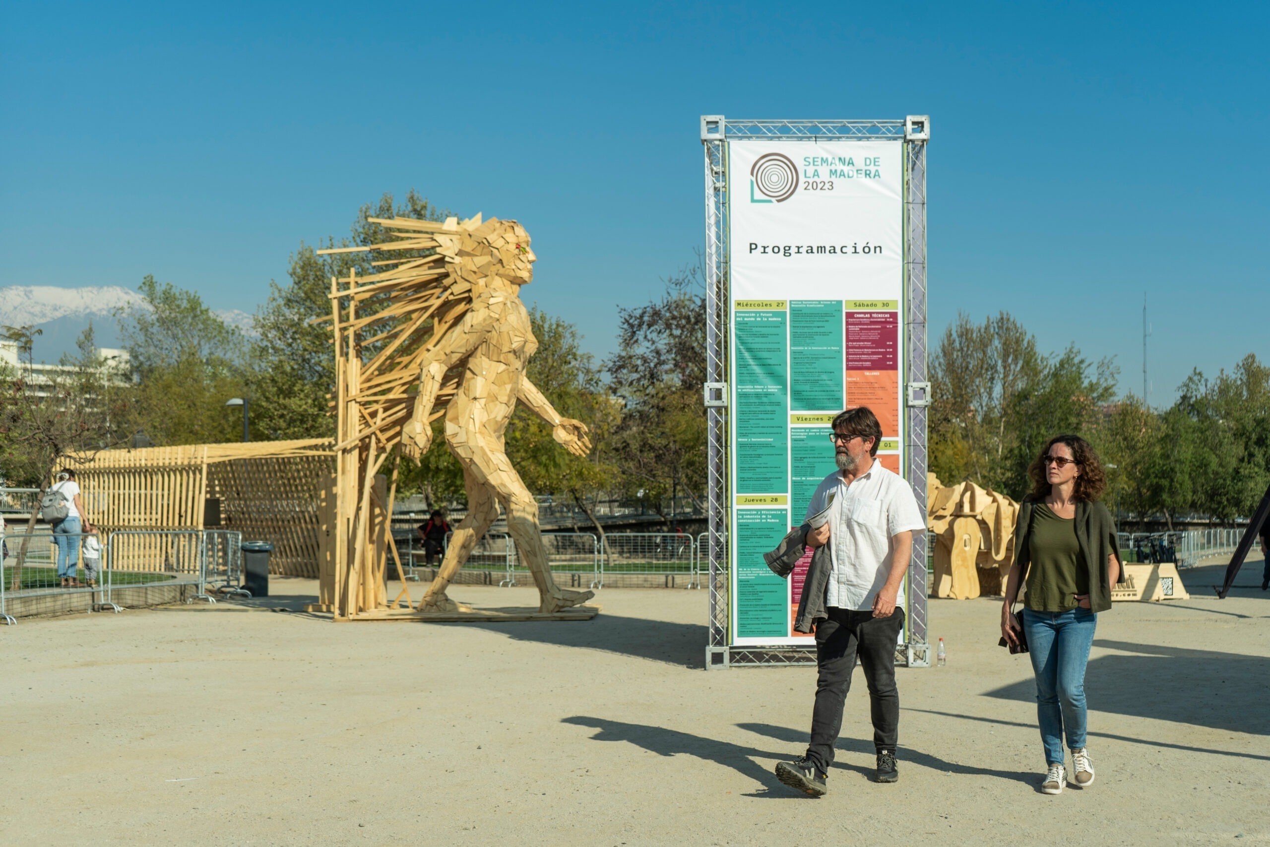 La presencia de David Cofré en la Semana de la Madera ha sido constante y evolutiva. En 2023 presentó “El sueño de la madera”, una escultura de gran formato que emula una figura humana caminante. La obra invitaba a mirar la madera desde una perspectiva artística y emocional, planteando el acto de avanzar como una metáfora del vínculo entre las personas y el material.