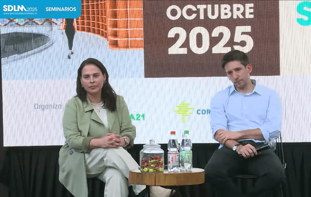 Roberta Lama, Directora del Comité de Desarrollo Productivo Regional Corfo Biobío y Frane Zilic, Gerente del Programa Estratégico Regional de Corfo MMC Sostenible en Madera» – Biobío Madera en Seminario Semana de la Madera 2025.
