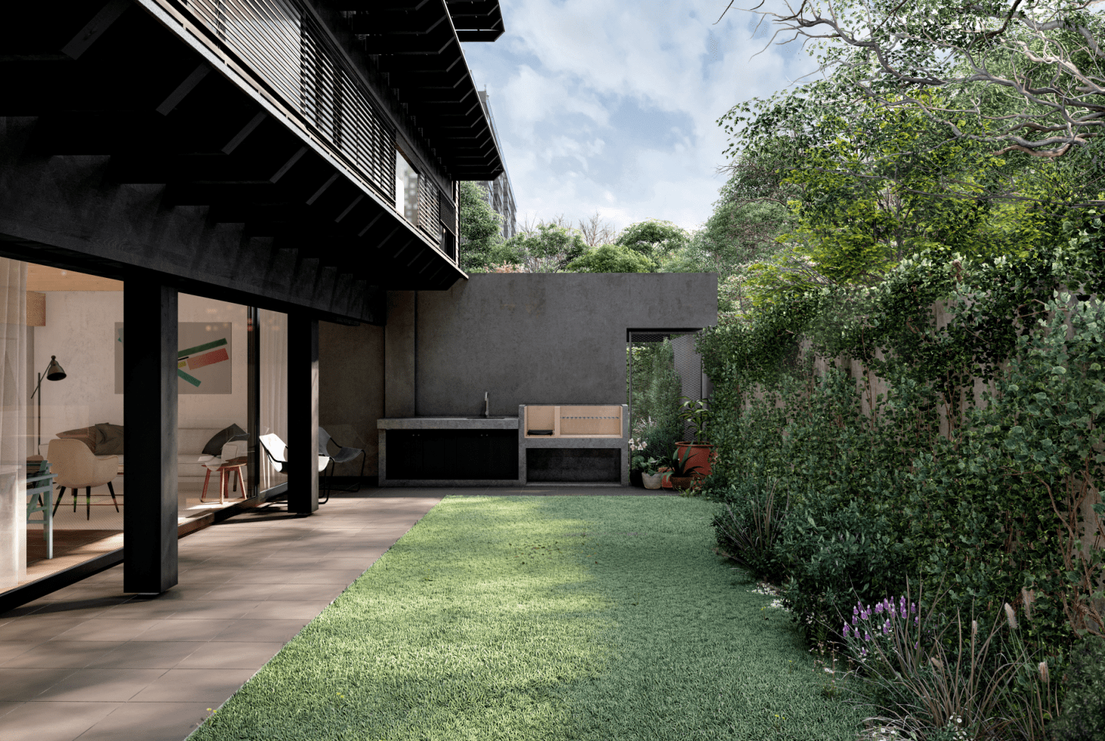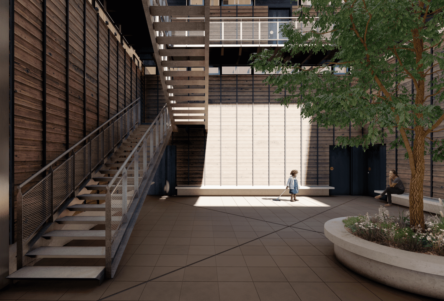 El inmueble se configura como un conjunto de baja altura organizado en torno a un patio central, que articula la vida interior del edificio y permite generar relaciones de proximidad entre las viviendas. En este esquema, el proyecto reúne catorce unidades distribuidas en tres niveles más azotea, donde conviven departamentos dúplex con patios privados y unidades en el nivel superior que incorporan terrazas en cubierta. Esta disposición busca recuperar una escala doméstica dentro de un barrio consolidado, combinando densificación con calidad espacial, iluminación natural y ventilación cruzada.