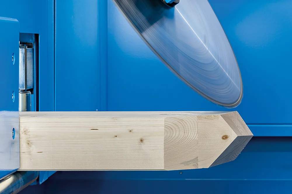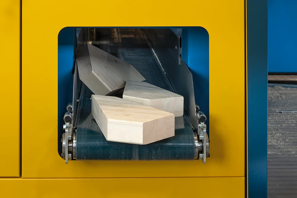 La SPEED-Cut es capaz de transformar secciones de madera de 20 x 40 mm hasta 240 x 480 mm en piezas de cualquier longitud. Además, es posible apilar unas piezas sobre otras, sin necesidad de reajustes, para que sean trasportadas y mecanizadas con la misma precisión. Las astillas y los restos de madera caen sobre una cinta transportadora de eliminación de residuos para mantener una zona de trabajo limpia y eficiente.