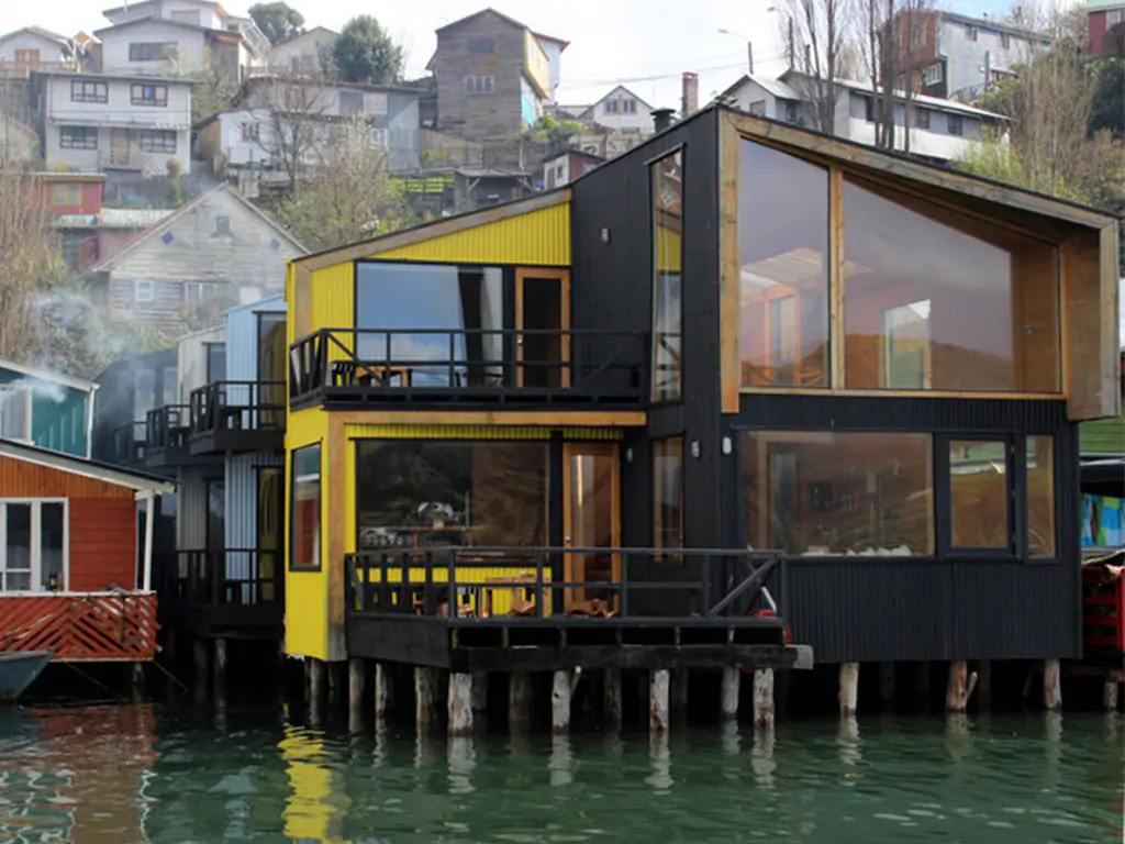 En simbiosis con el estero de Castro, Chiloé, se encuentra el hotel boutique Palafito del Mar, proyecto realizado por Ortúzar Gebauer Arquitectos, erguido sobre en pilotes de madera de luma de cerca de cinco metros, enterrados un metro y que sobrepasan 20 cm el nivel de la marea más alta, cuenta con diagonales de pino y maderas recicladas del antiguo palafito.