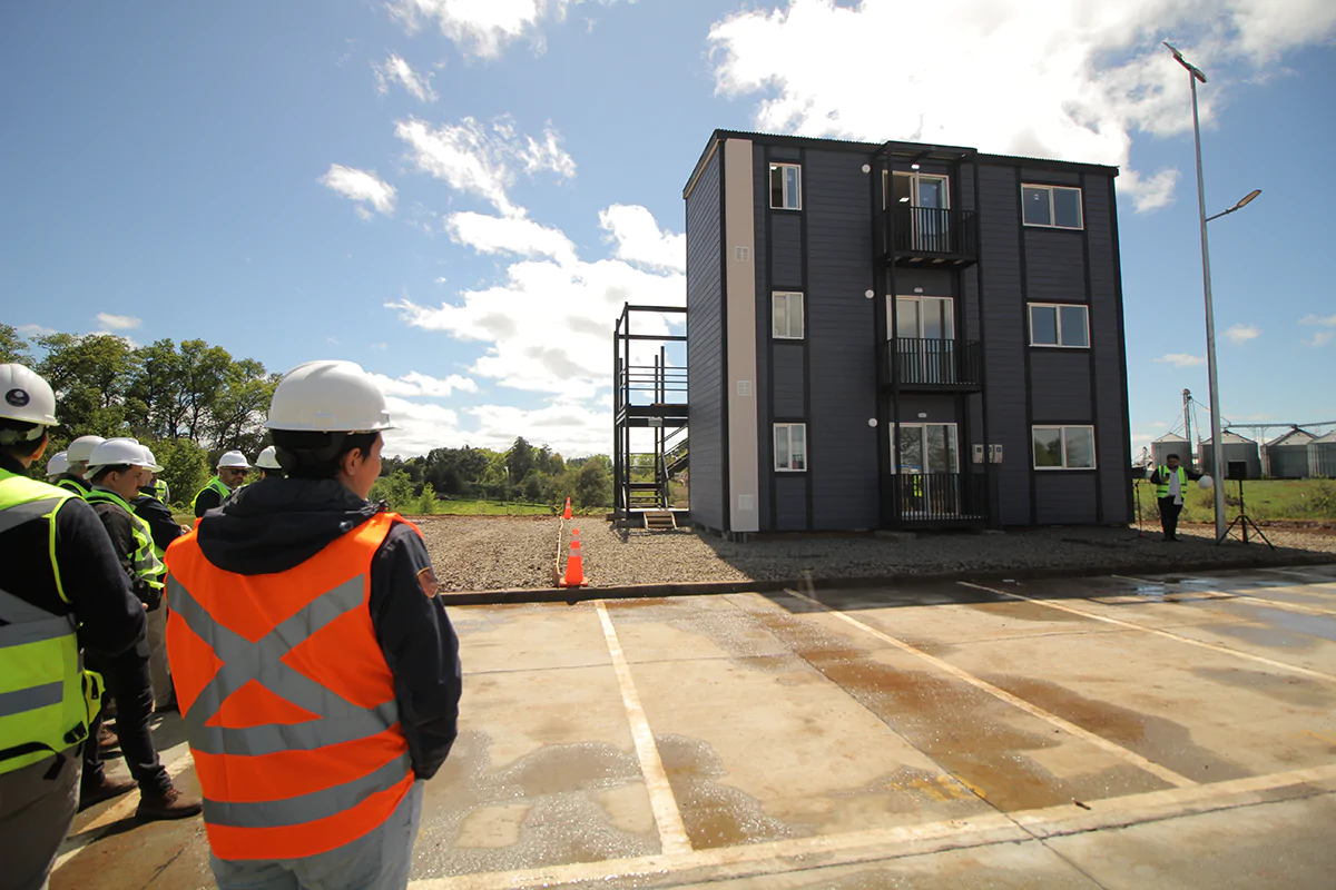 El edificio, de tres pisos y configurado como un pequeño condominio, fue producido completamente en planta en solo seis semanas, alcanzando 180 m² construidos (60 m² por departamento). Posteriormente, sus módulos fueron montados en terreno en apenas ocho horas, demostrando la eficiencia de la construcción industrializada. Este proceso permitió reducir en más de un 60% los tiempos de obra y generar solo 30 m³ de residuos en total durante la producción, equivalentes a 5 m³ por semana, una cifra muy inferior al promedio de una obra tradicional, reflejando el potencial de la prefabricación para disminuir el impacto ambiental de la construcción.
