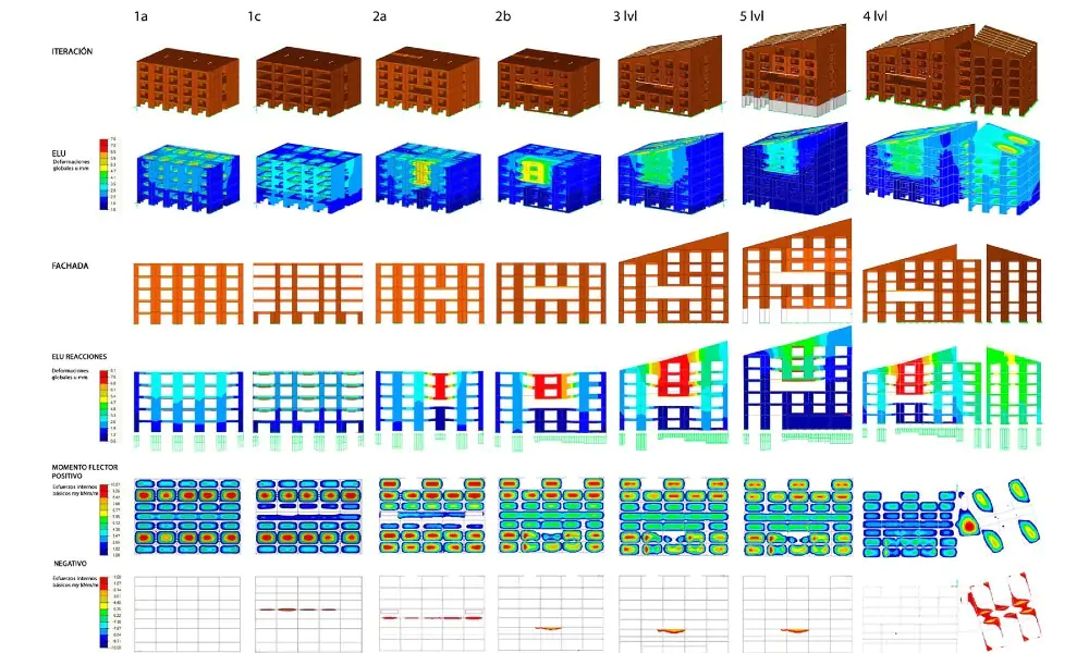Junto con lo anterior, la investigación arrojó que se establecieron criterios para la incorporación de espacios flexibles mediante dobles alturas, así como plantas libres en edificios de mediana altura. Y que en ninguna iteración el CLT dejó de tener compromiso estructural. Si bien el material fue apoyado mediante vigas y el podio de H.A. para los testeos, la sección y composición de los paneles terminaron siendo determinantes en el cumplimiento de las deformaciones.