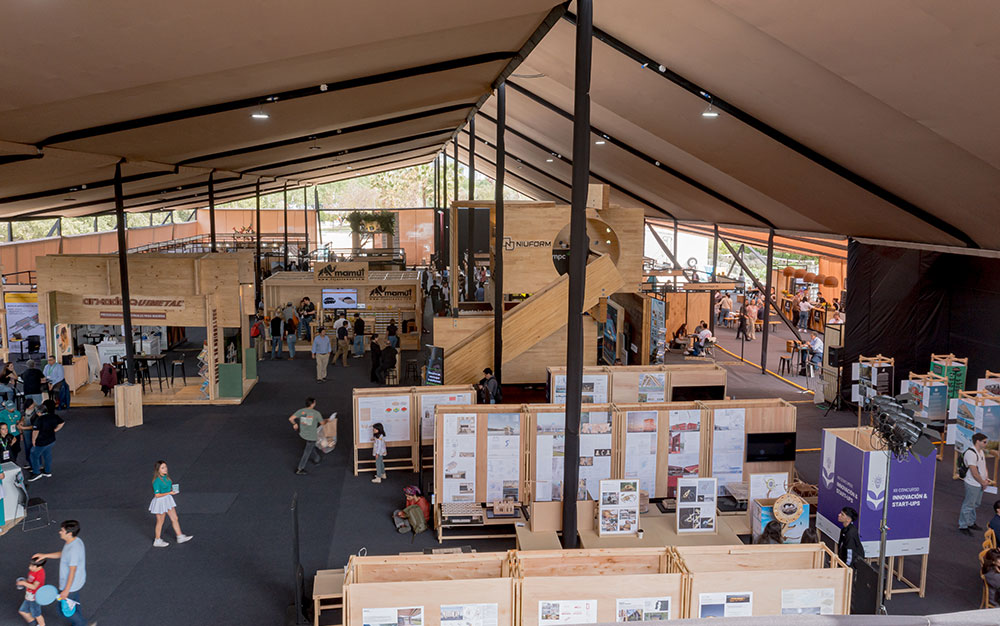 La feria también contó con experiencias únicas, como la construcción en vivo de una Capilla País con sistema prefabricado liderado por FURO; la propuesta regenerativa de AYMA Arquitectura; el modelo de vivienda industrializada de Tu Casa Fácil; y el pabellón OGZero, una estructura desmontable que tras la feria será trasladada a Chiloé para convertirse en residencia artística. Los stands de los auspiciadores Arauco, CMPC y Arxada Quimetal.