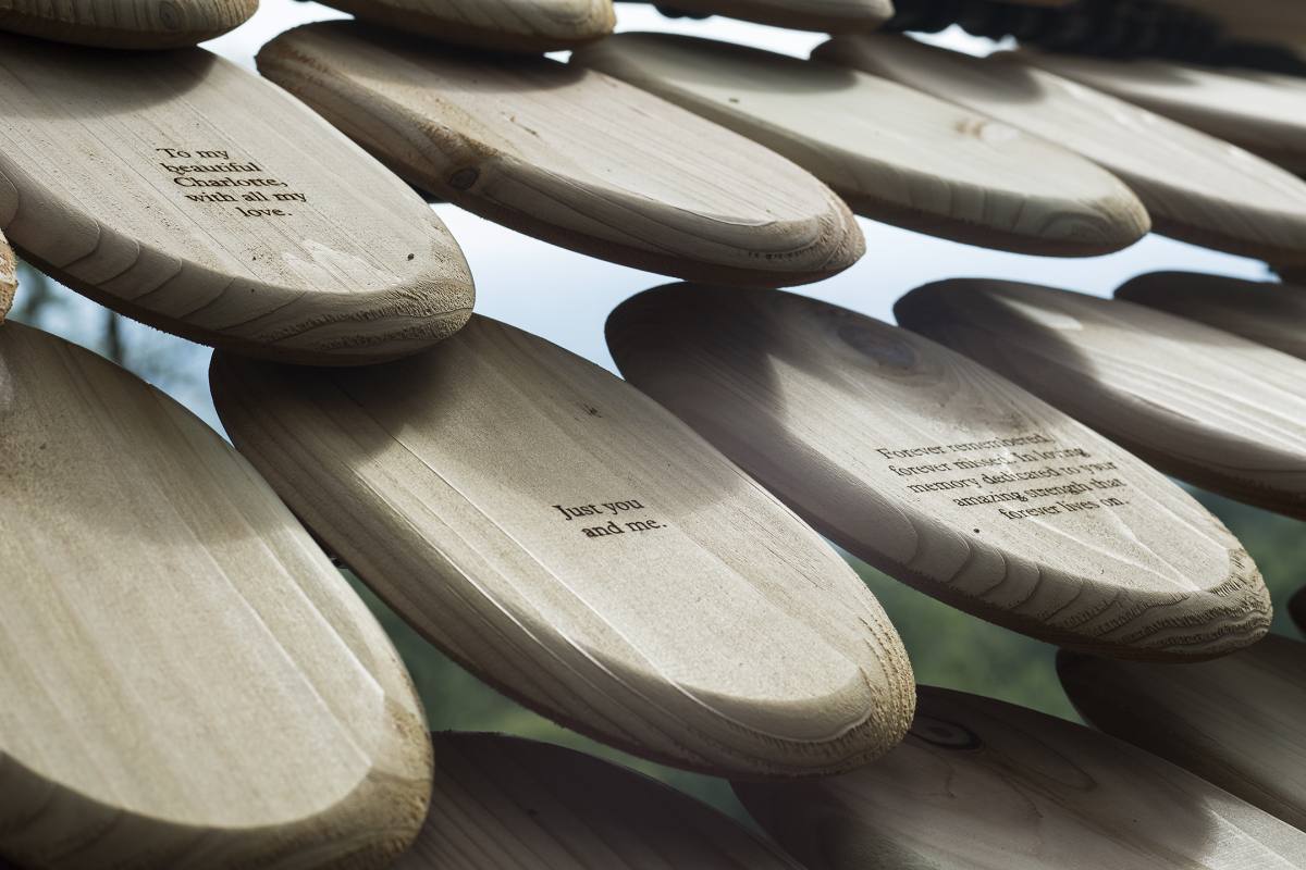 Construido con un armazón de acero y revestido por cientos de tejas de cedro colocadas de forma artesanal, el pabellón destaca por su forma elíptica y su superficie texturizada. Con el paso del tiempo, la madera adquiere un tono gris plateado, mimetizándose con el bosque que lo rodea. Pero lo que vuelve a estas tejas particularmente especiales – además de su presencia material en el paisaje – son las historias que llevan inscritas: muchas fueron grabadas a mano con mensajes, poemas y dedicatorias aportadas por residentes y estudiantes de la zona.