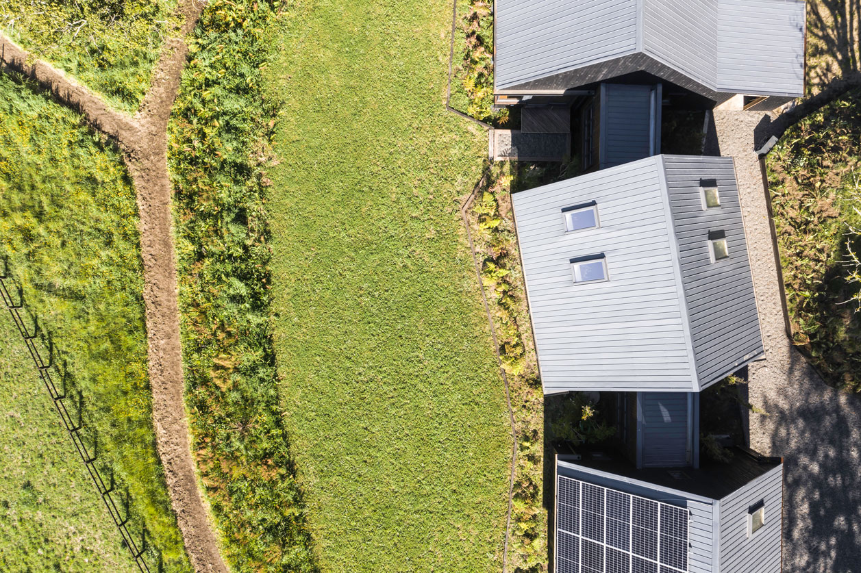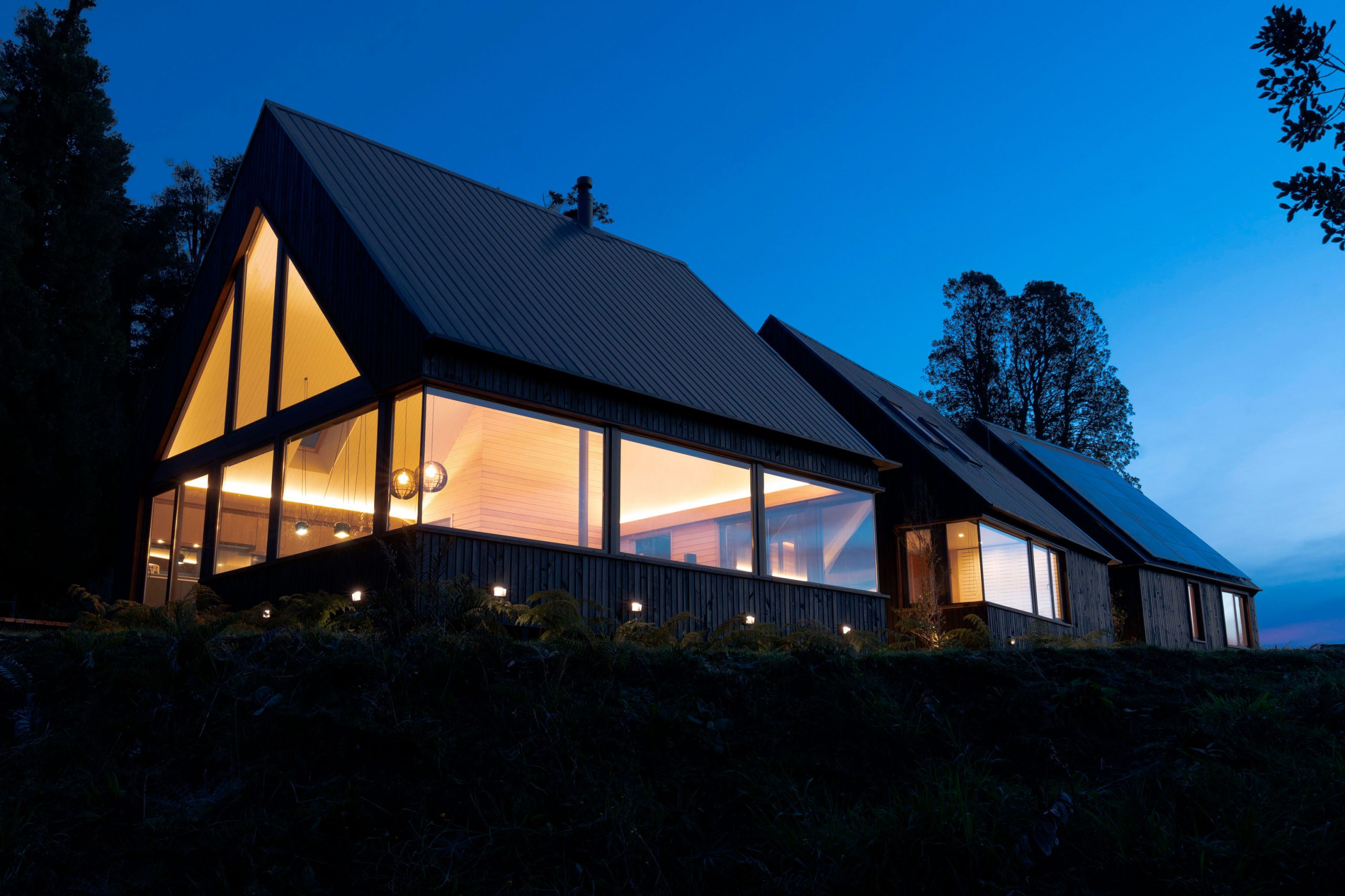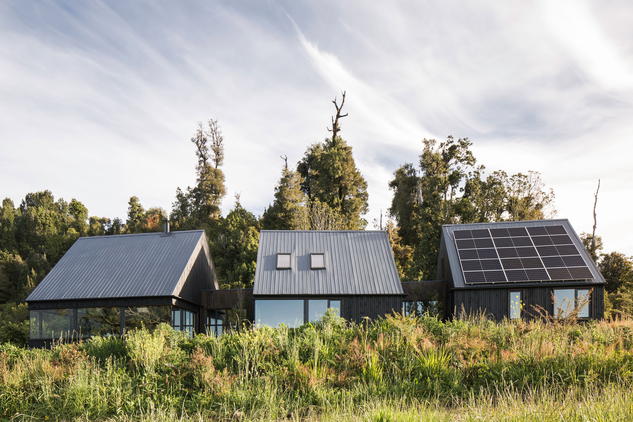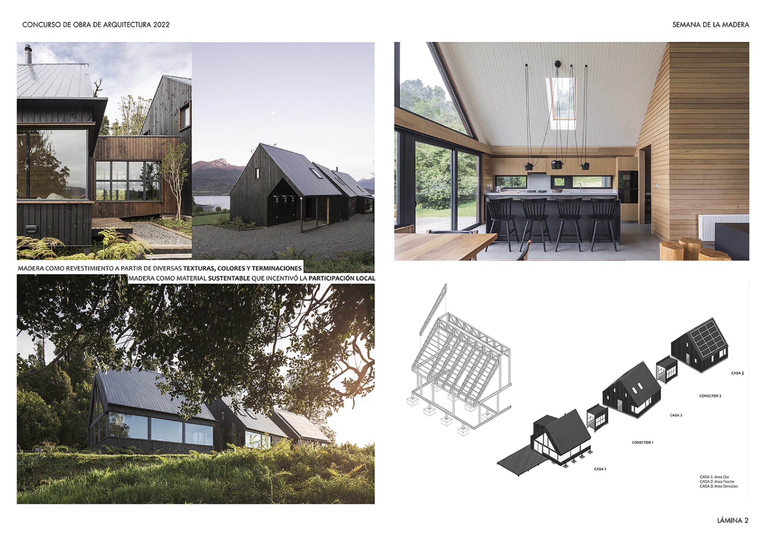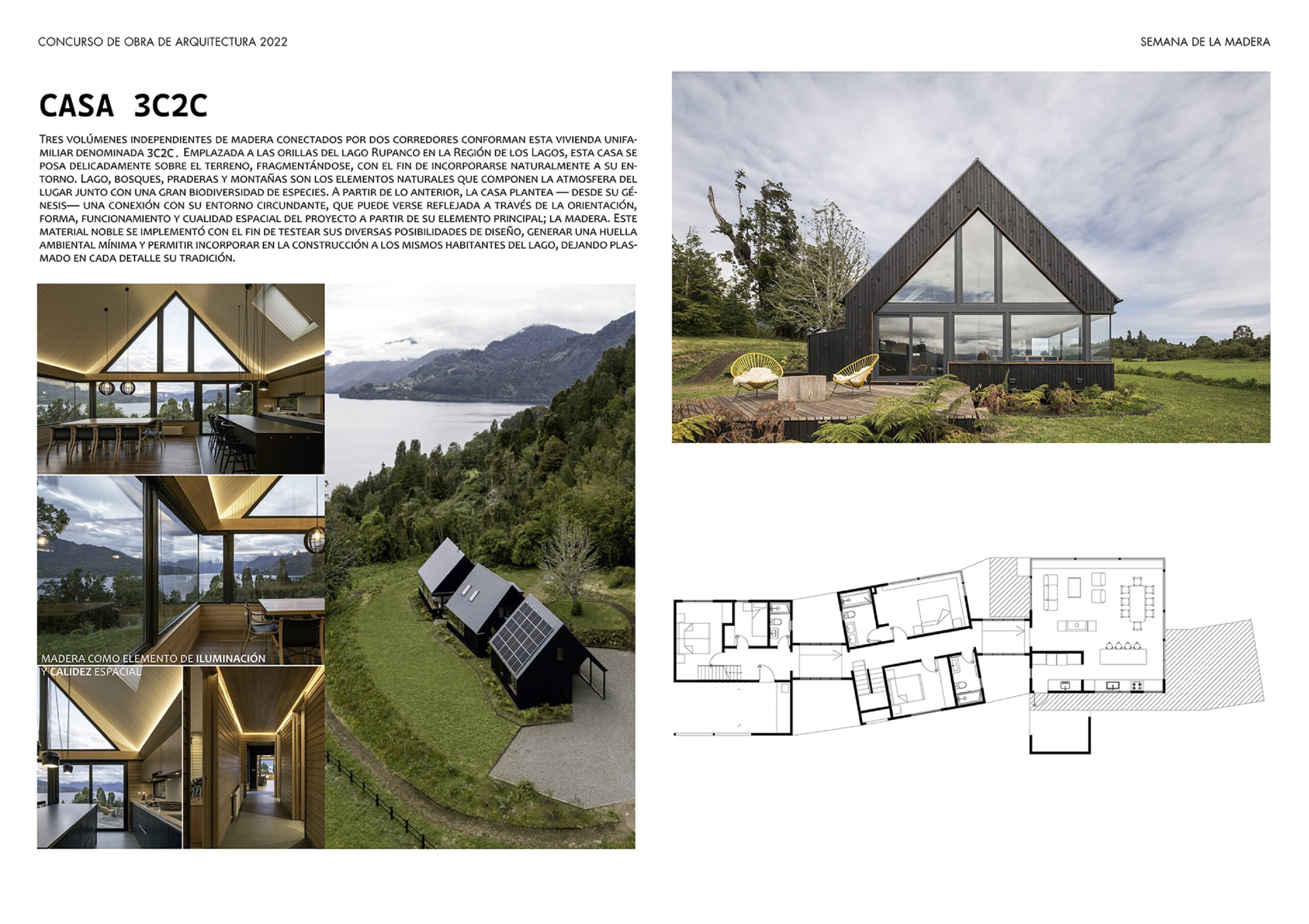 Tres volúmenes independientes de madera — conectados por dos corredores— conforman esta vivienda unifamiliar denominada 3C2C. Emplazada en Rupanco en la Región de los Lagos, esta casa se posa delicadamente sobre el terreno, fragmentándose, con el fin de incorporarse naturalmente a su entorno. Lago, bosques, praderas y montañas son los elementos naturales que componen la atmosfera del lugar junto con una gran biodiversidad de especies. A partir de lo anterior, la casa plantea — desde su génesis— una conexión con su entorno circundante, que puede verse reflejada a través de la orientación, forma, funcionamiento y cualidad espacial del proyecto a partir de su elemento principal; la madera. Este material noble se implementó con el fin de testear sus diversas posibilidades de diseño, generar una huella ambiental mínima y permitir incorporar en la construcción a los mismos habitantes del lago, dejando plasmado en cada detalle su tradición.