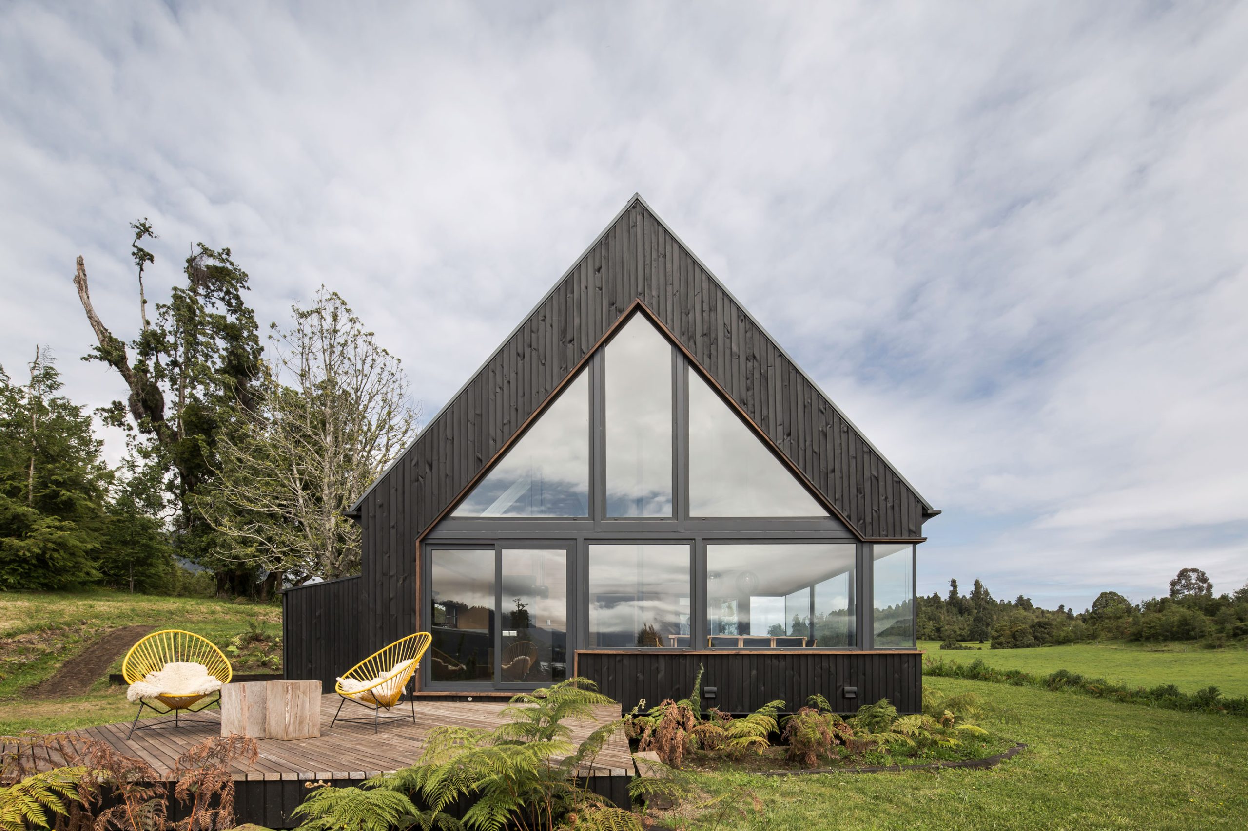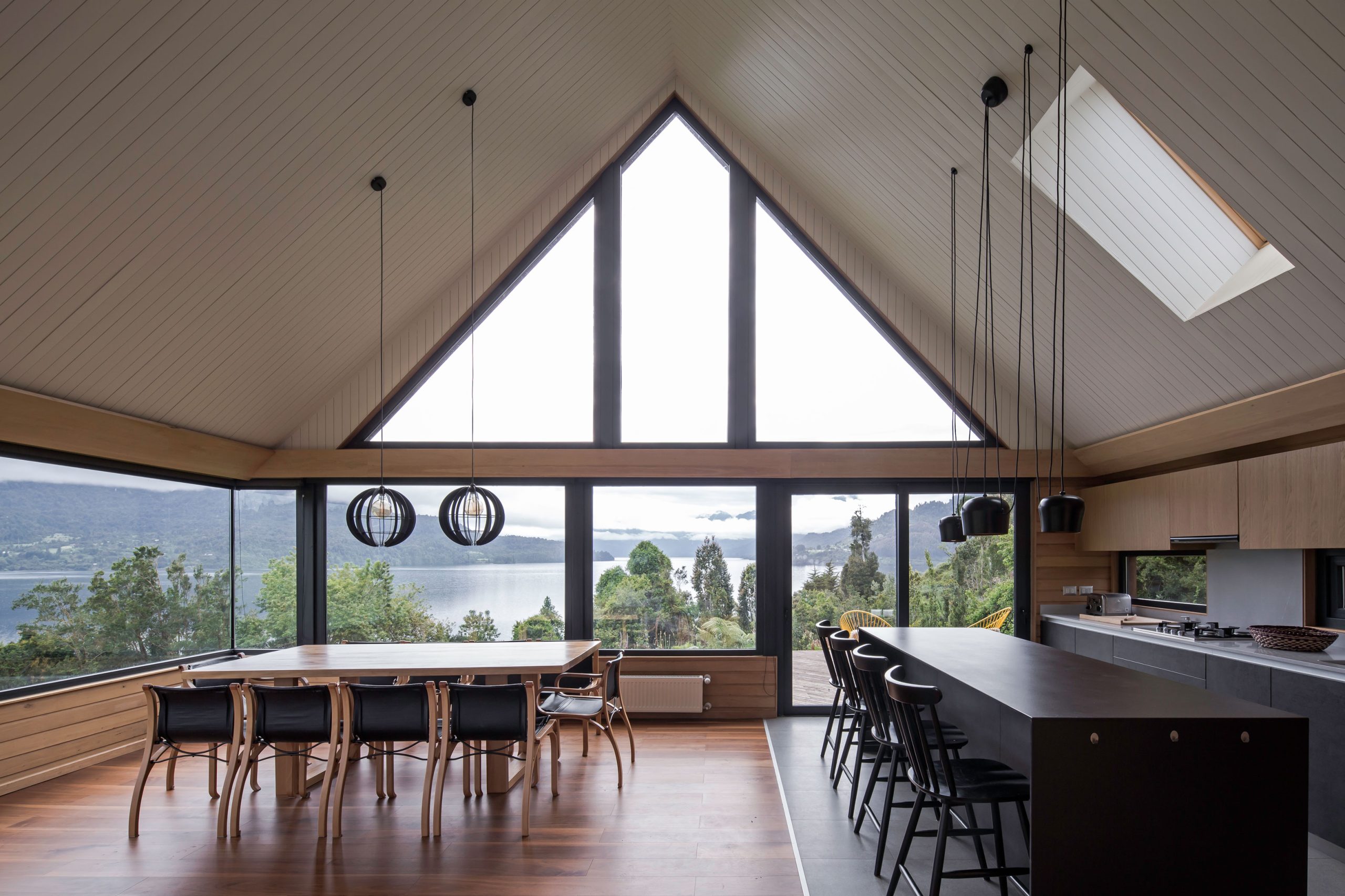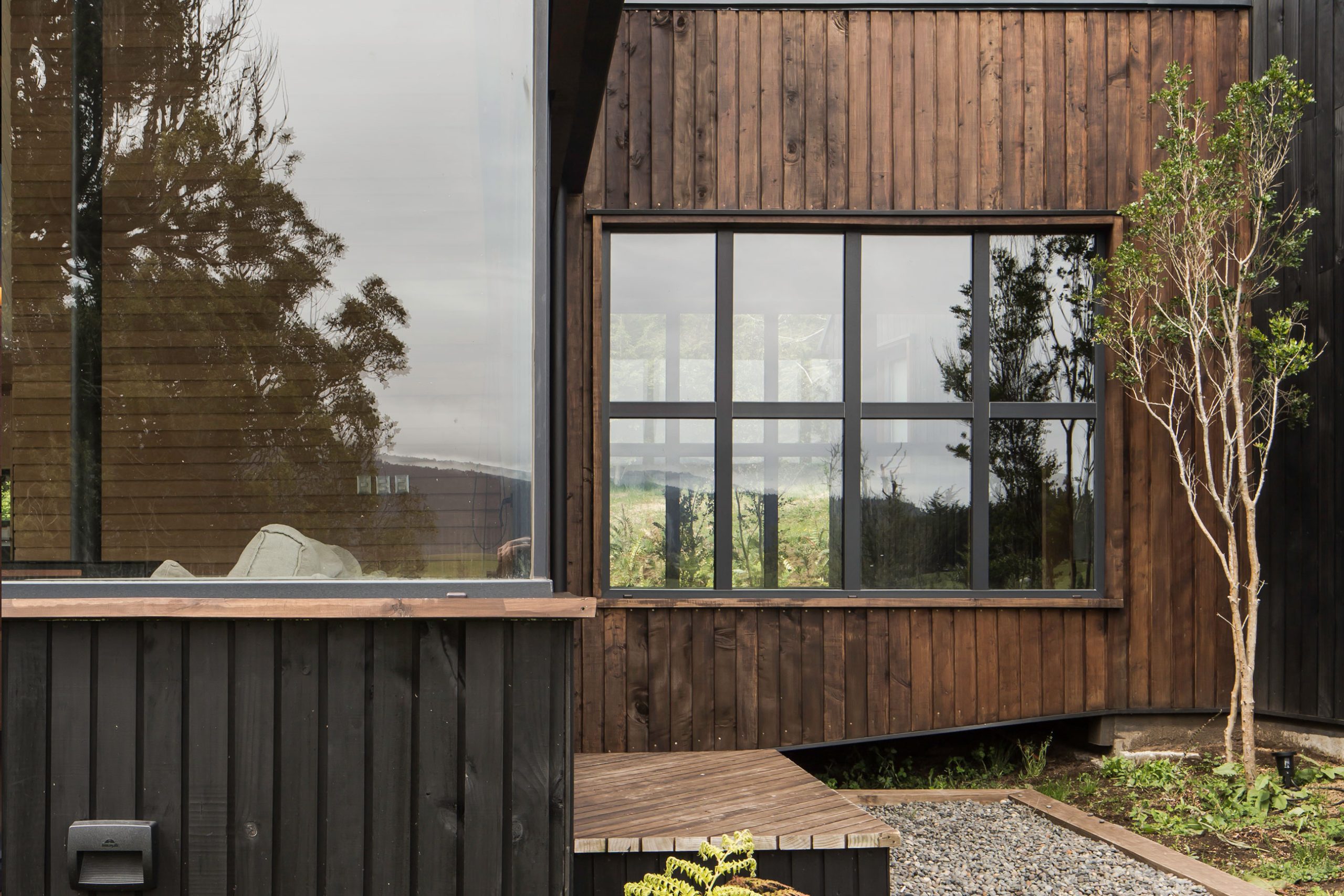 La madera utilizada para la cubierta fue de pino impregnada en envigado y tableros terciados, cubriéndose de zinc para proteger del agua. En muros; madera de pino impregnada en estructura interior y tableros de OSB para encamisar. Losas; envigados de pino impregnado y tableros de terciado bajo pavimentos. Puertas; interiores enchapadas en madera de Mara y estructura de pino, y exteriores de madera maciza de Tepa. Carpinterías interiores; escalera, molduras de ventanas, puertas, cortineros y cenefas en madera maciza de mañío. Revestimientos interiores; tabla shiplap en cielos, muros de entablados de mañío y tableros de madera terciada rasurada, piso de ingeniería red en madera para dormitorios y living. Revestimiento exterior; tabla de pino impregnada. Se trabajó con maderas previamente tratadas y las estructurales se protegieron con pintura Waterproof. Para terminar, la orientación de la casa se planteó a favor del clima, protegiendo del viento, lluvia y sol.