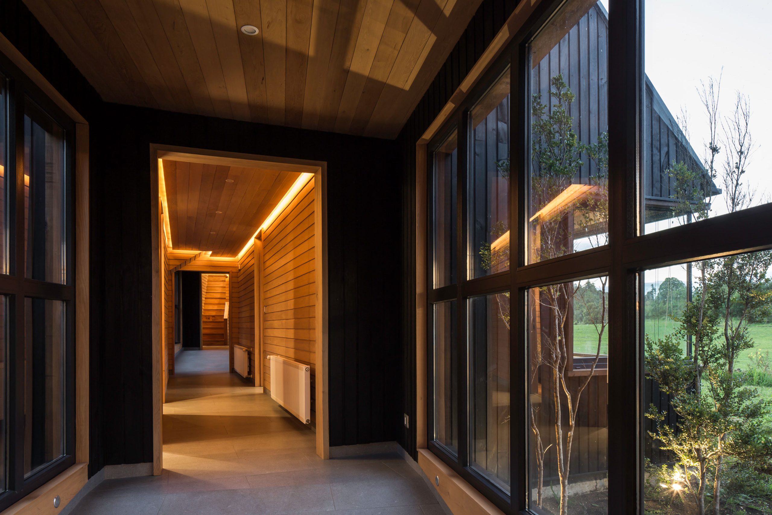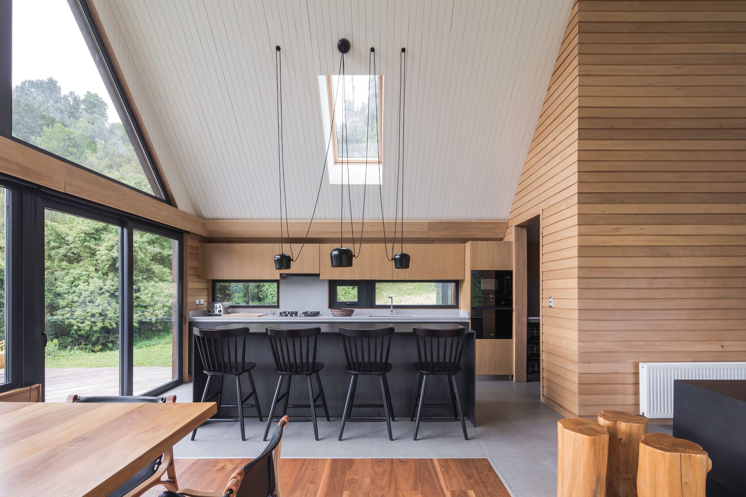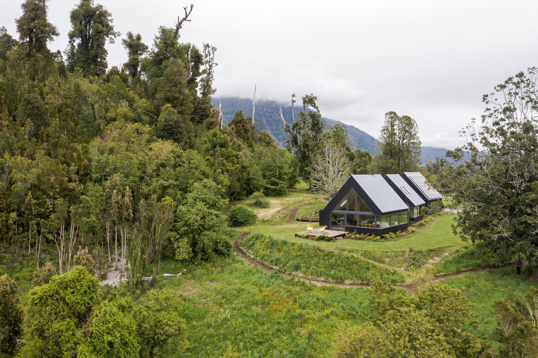 La madera utilizada para la cubierta fue de pino impregnada en envigado y tableros terciados, cubriéndose de zinc para proteger del agua. En muros; madera de pino impregnada en estructura interior y tableros de OSB para encamisar. Losas; envigados de pino impregnado y tableros de terciado bajo pavimentos. Puertas; interiores enchapadas en madera de Mara y estructura de pino, y exteriores de madera maciza de Tepa. Carpinterías interiores; escalera, molduras de ventanas, puertas, cortineros y cenefas en madera maciza de mañío. Revestimientos interiores; tabla shiplap en cielos, muros de entablados de mañío y tableros de madera terciada rasurada, piso de ingeniería red en madera para dormitorios y living. Revestimiento exterior; tabla de pino impregnada. Se trabajó con maderas previamente tratadas y las estructurales se protegieron con pintura Waterproof. Para terminar, la orientación de la casa se planteó a favor del clima, protegiendo del viento, lluvia y sol.