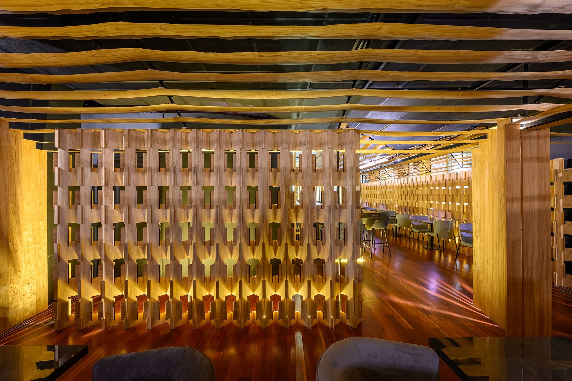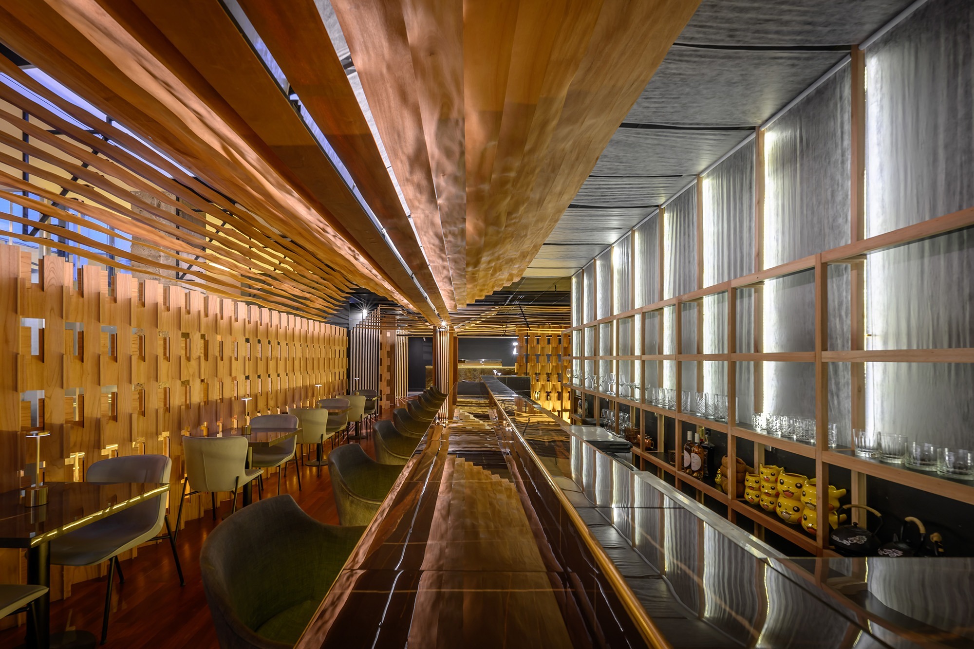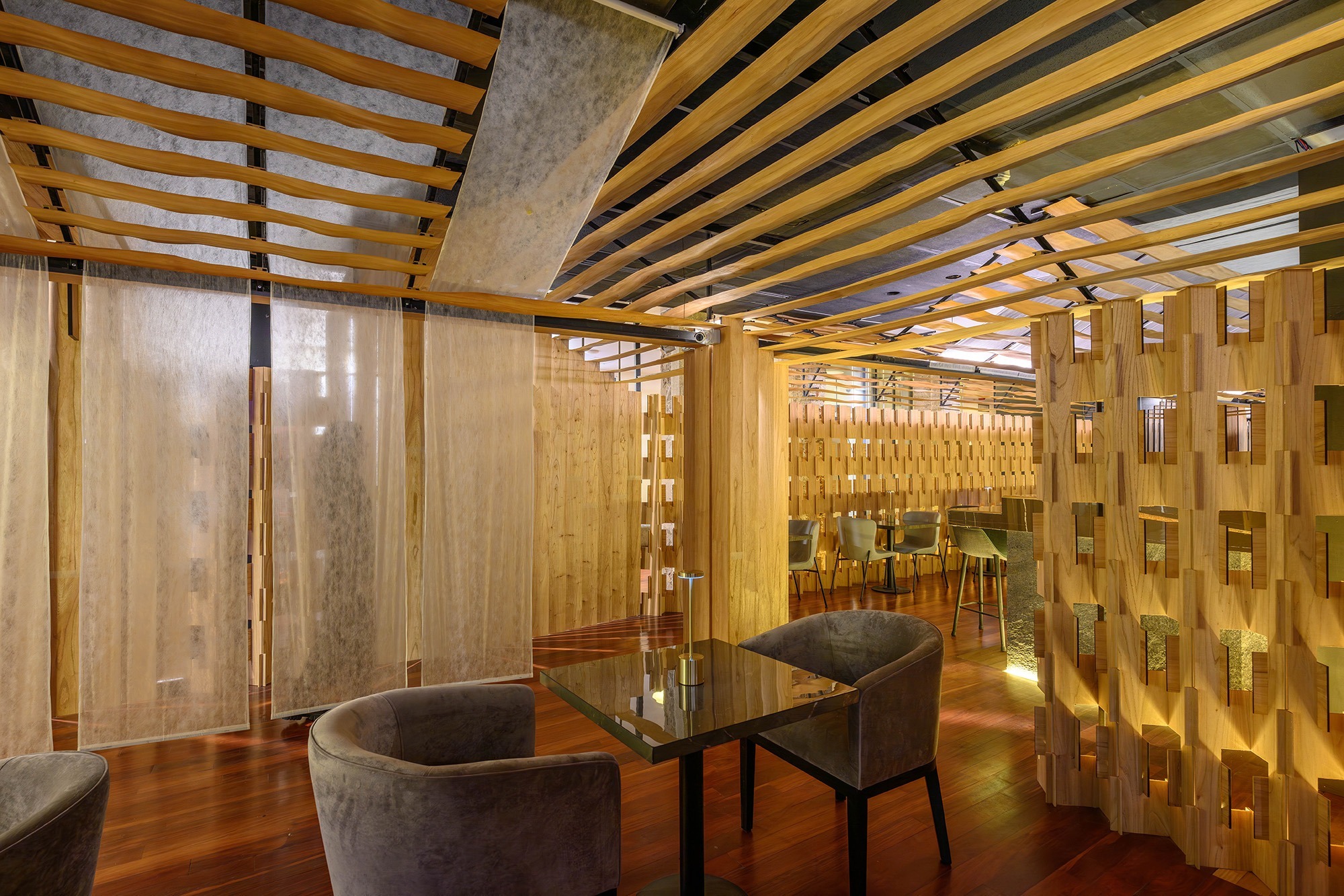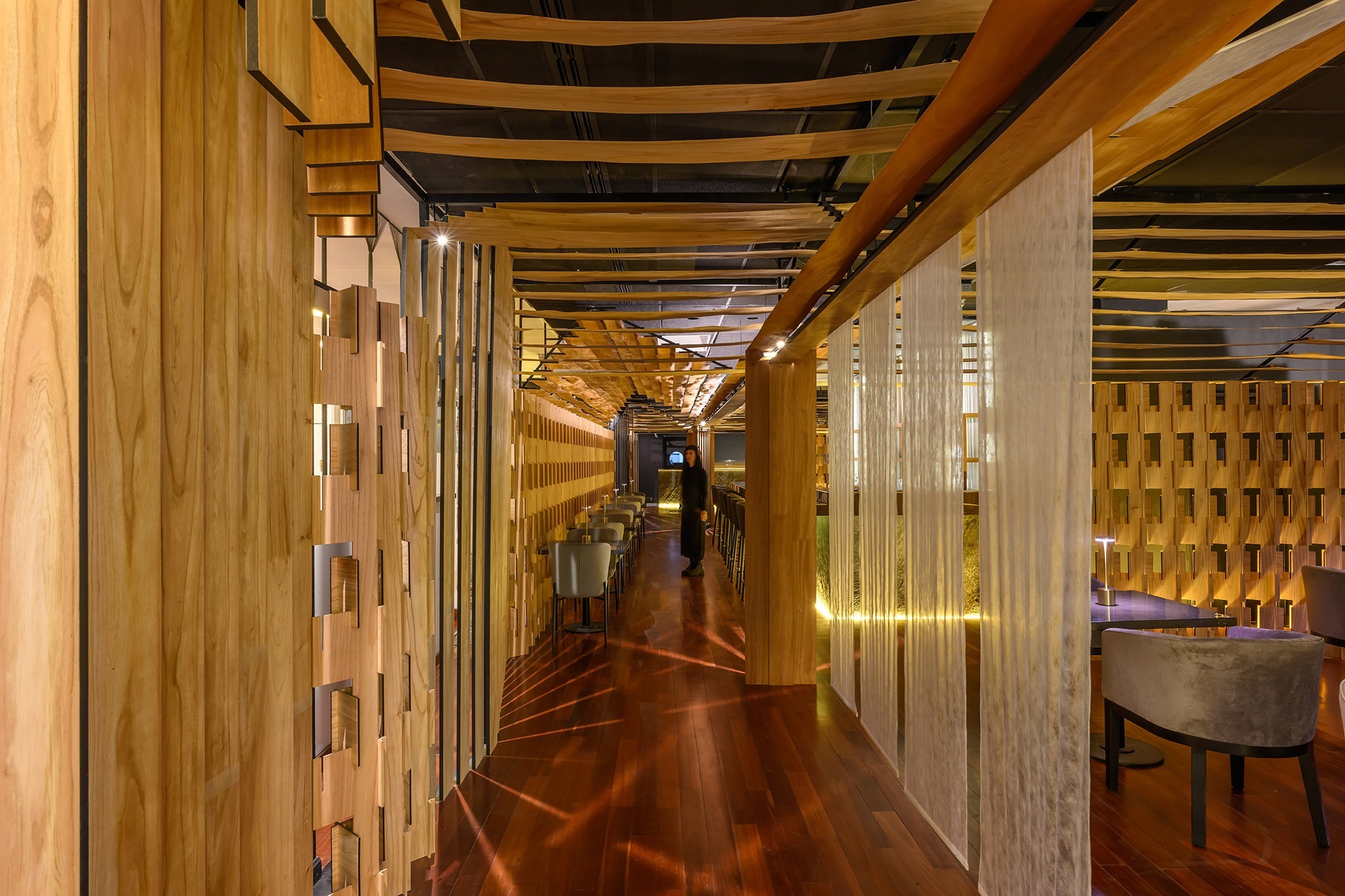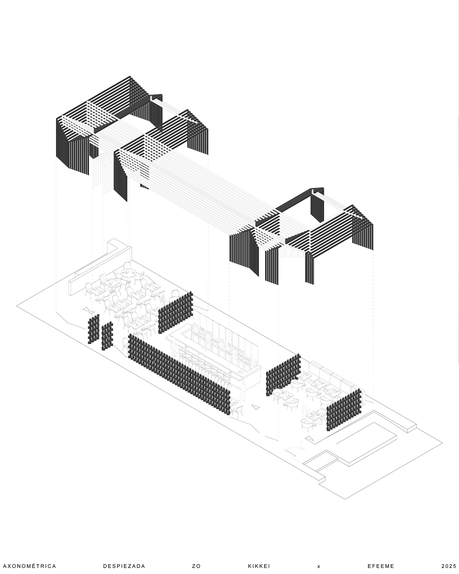 La gastronomía nikkei, resultado de la fusión entre la cocina japonesa y la peruana, combina la precisión técnica y sutileza del corte japonés con la intensidad y riqueza sensorial de los sabores peruanos. Este SINCRETISMO CULTURAL constituye el eje conceptual del proyecto, convirtiéndose en su ADN formal y espacial. La madera, utilizada como material protagónico, actúa como un elemento unificador que otorga calidez, continuidad y coherencia narrativa a la propuesta arquitectónica.