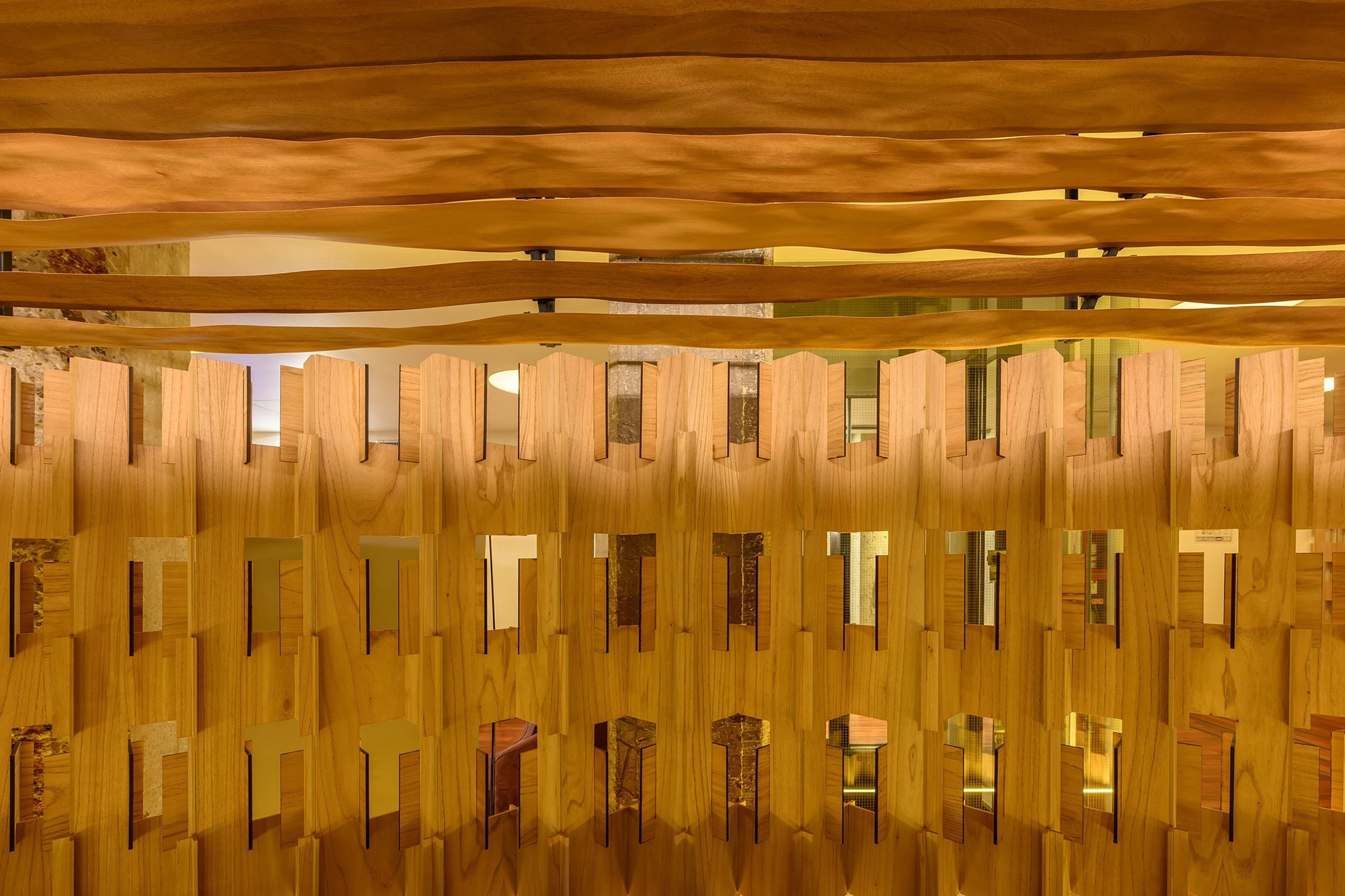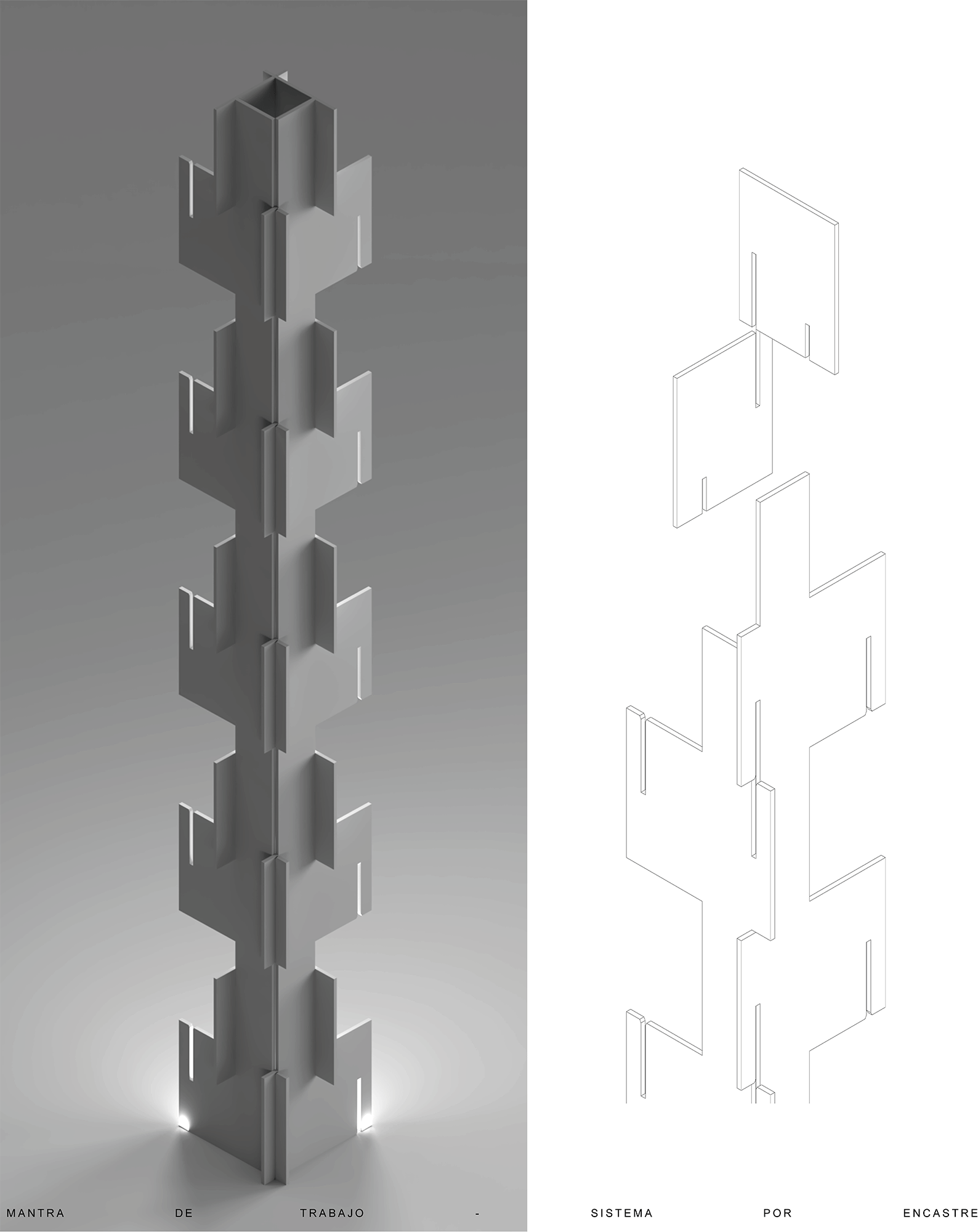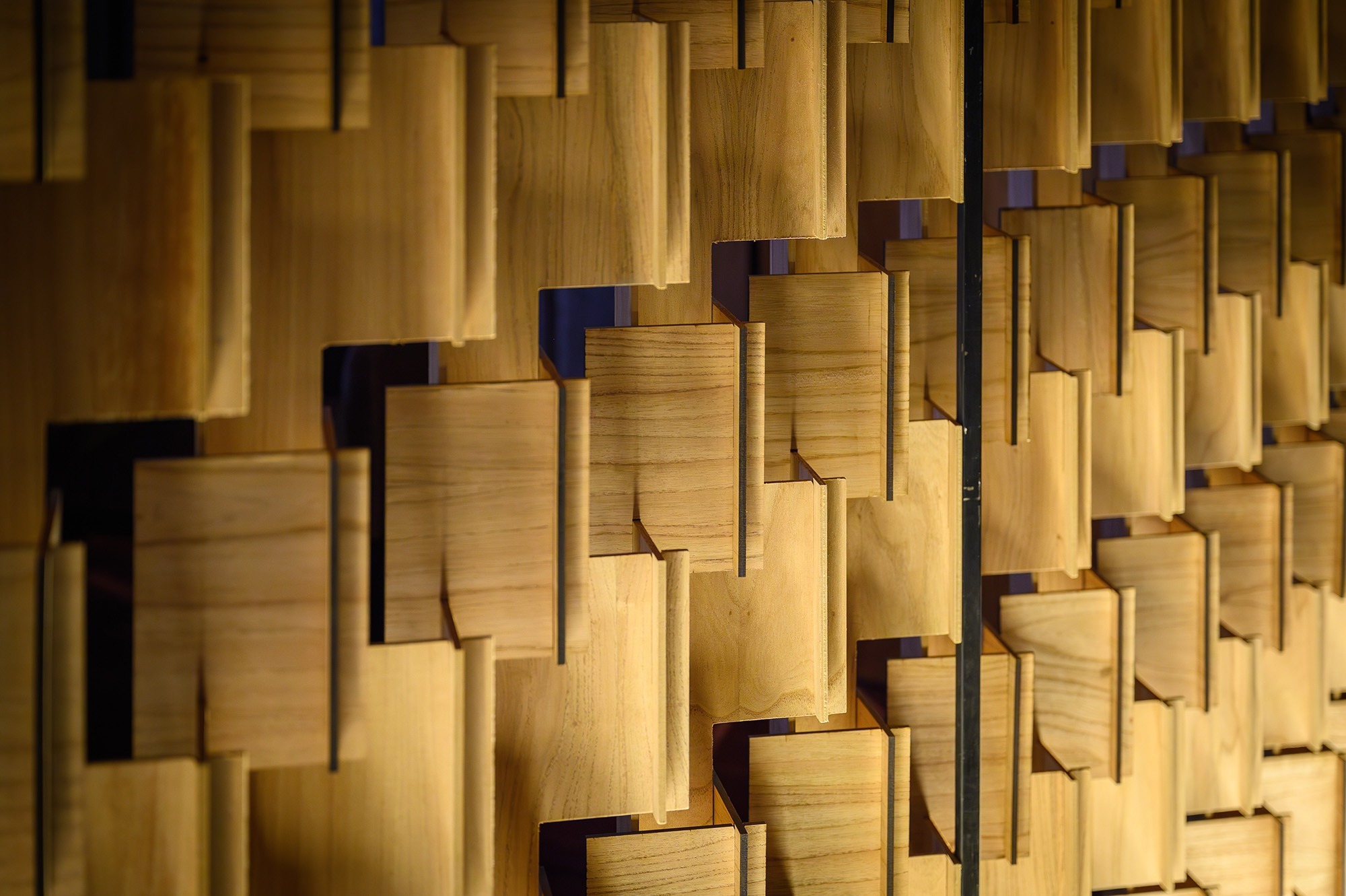 El proyecto se concibe a partir de la experimentación con un único material expresivo en dos formatos comerciales distintos: enchapado de madera (chapazil) y MDF. La repetición de las tramas en distintas escalas pero con una misma materialidad refuerza la idea de permeabilidad, permitiendo la interacción entre luz, visuales y límites espaciales difusos.