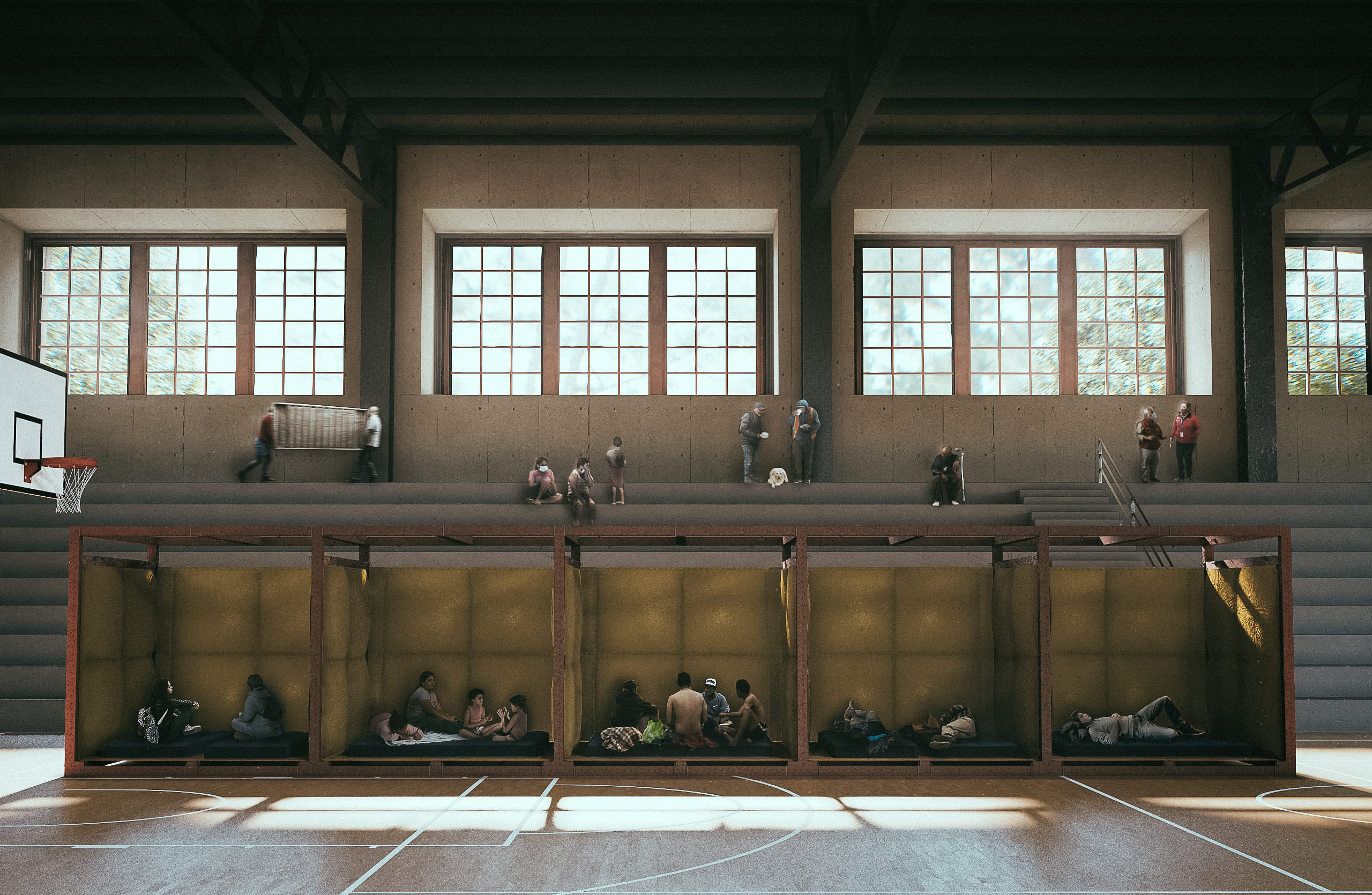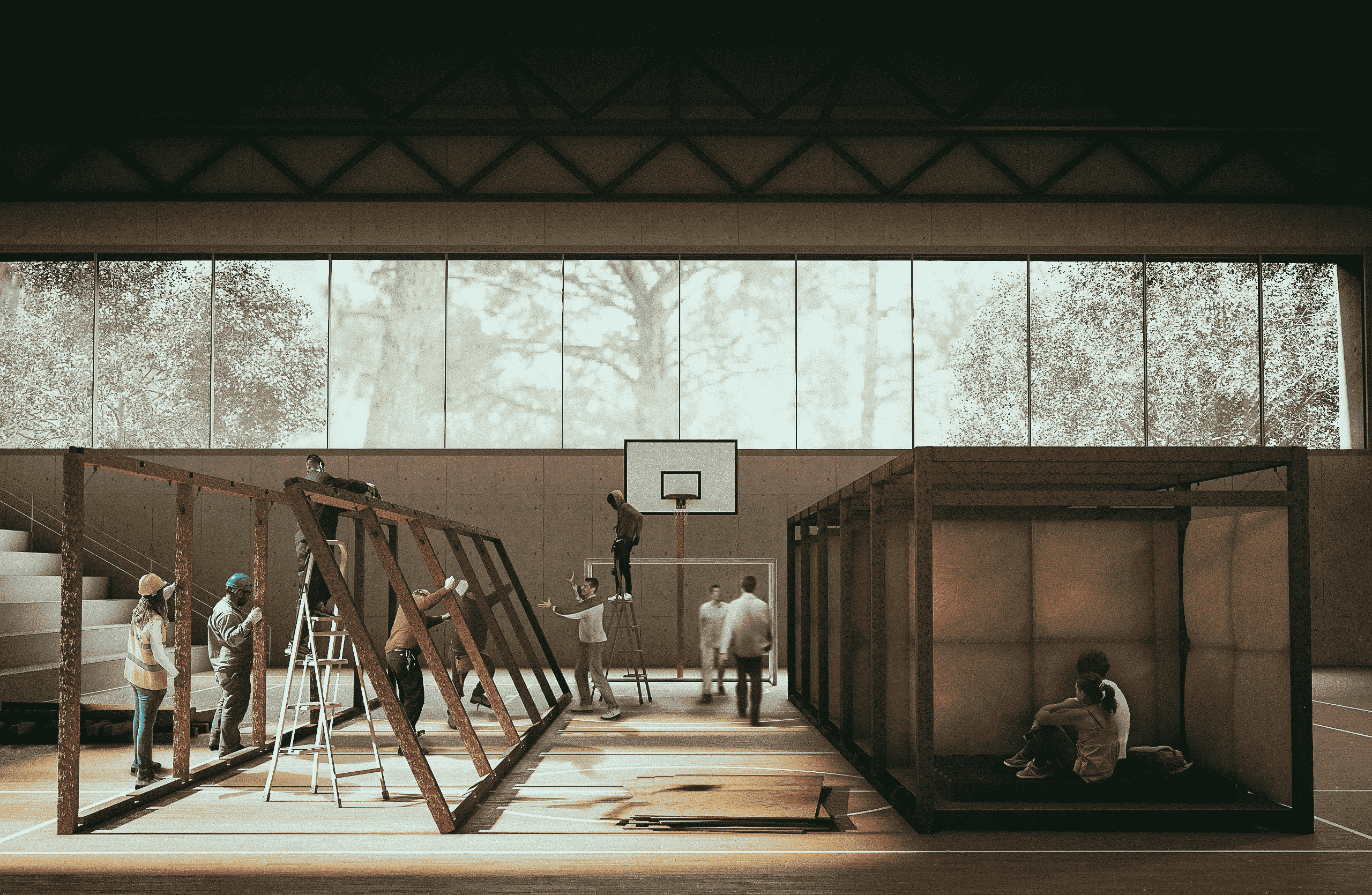 La propuesta se emplaza en una multicancha techada de 15 x 30 metros, que define los límites y condiciona el diseño. Los módulos se organizan para asegurar privacidad, recorridos amplios y evitar aglomeraciones. El gimnasio, al ser un espacio cerrado, garantiza buena climatización y cuenta con instalaciones sanitarias. También se consideran otras posibles ubicaciones, como sedes vecinales o sociales, por sus condiciones similares. El diseño se basa en una grilla adaptada al espacio, compartimentando en módulos que permiten crear transiciones, zonas comunes y espacios de encuentro. Estos vacíos entre módulos no son residuales, sino activos: articulan el conjunto, fomentan la convivencia y permiten la entrada de luz y aire. Así, el albergue trasciende su función básica, proponiendo una tipología flexible y comunitaria, que valora tanto la vida en conjunto como la individualidad.