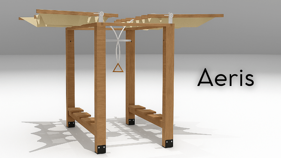 Aeris propone una solución formal basada en una estructura de madera , que desde su superficie emergen alas ligeras que proyectan sombra. Su lenguaje visual transmite ligereza, vuelo y algo acogedor, combinando una estética poética con una construcción racional y eficiente. El diseño considera un sistema modular y prefabricado, que permite facilitar su producción, traslado e instalación en espacios públicos sin grandes intervenciones. La selección de madera estructural de pino radiata permite aprovechar su flexibilidad, durabilidad en exteriores y disponibilidad local. Las uniones y anclajes metálicos fueron pensados para garantizar la estabilidad estructural sin afectar la expresión formal del proyecto. El sistema es adaptable según el entorno y puede ser replicado o escalado con variaciones mínimas. En conjunto, la propuesta articula una forma reconocible, expresiva y eficiente, que equilibra manufactura técnica, valor simbólico y claridad constructiva.