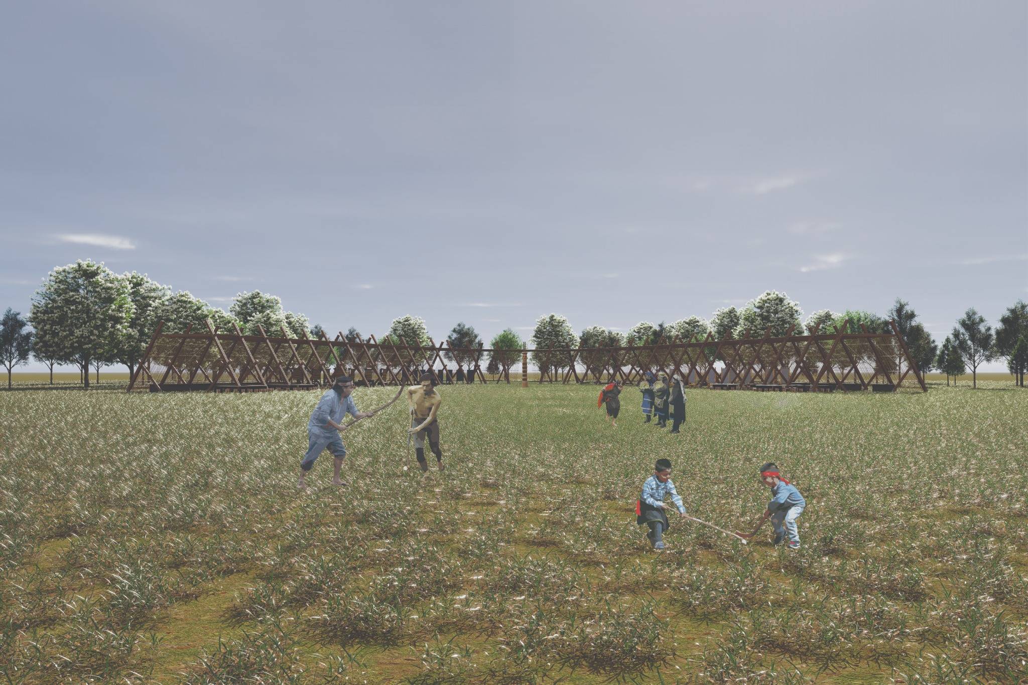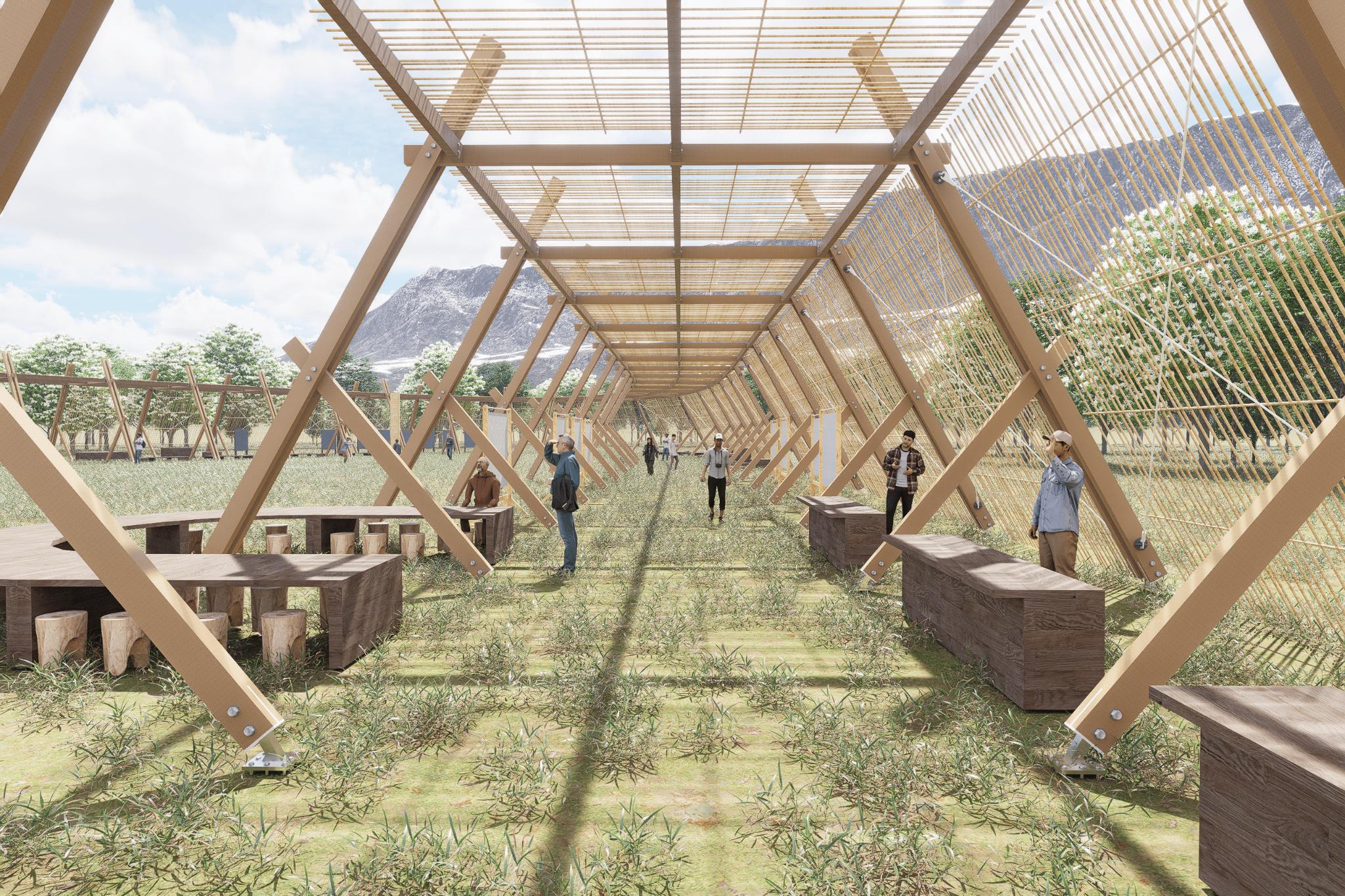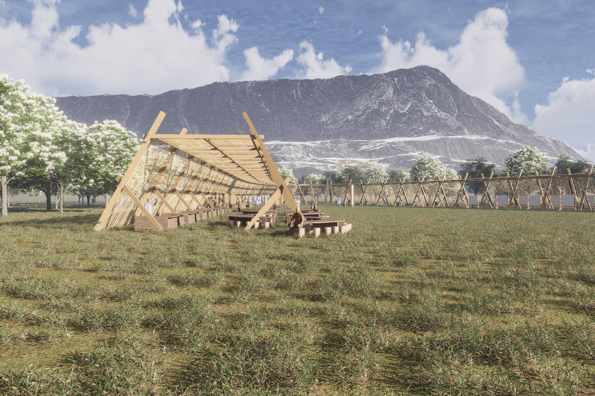 Este se estructura a partir de dos ejes paralelos diagonales que delimitan un espacio central contenido, donde se ubica el Rewe. Este gesto en marca el rito y articula zonas destinadas a exposición, gastronomía, la reunión y la venta de productos mapuches, generando una experiencia espacial que acoge proyecta esta práctica ancestral en el paisaje urbano, fortaleciendo la identidad y el vínculo con la naturaleza.