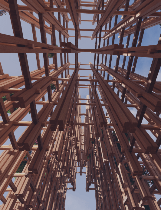 Inspirado en el Caleuche y la iglesia, su forma triangular busca mantener la estabilidad, emergiendo la estructura desde una grilla estructural determinada por las cuadernas de los botes que se recuperan como base, elevándose en una repetición modular. El sistema constructivo recoge la carpintería de ribera, utilizando ensambles que permiten el armado y desmontaje sin dañar los elementos. El proyecto se plantea a partir de un módulo compuesto de 4 pilares de 65 x 65 mm de madera nativa de ciprés cepillada arriostrado con 4 piezas horizontales, dando un módulo espacial de 1,0 x 0,6 x 0,74 mts. El proyecto combina saberes tradicionales, reutilización de materiales y tecnología local. El uso de tarugos y un catastro de piezas permite modularidad, eficiencia en el montaje y facilidad de reparación. La base flotante se construye a partir de dos botes madereros junto a vigas compuestas curvadas en su superficie forman un catamarán.