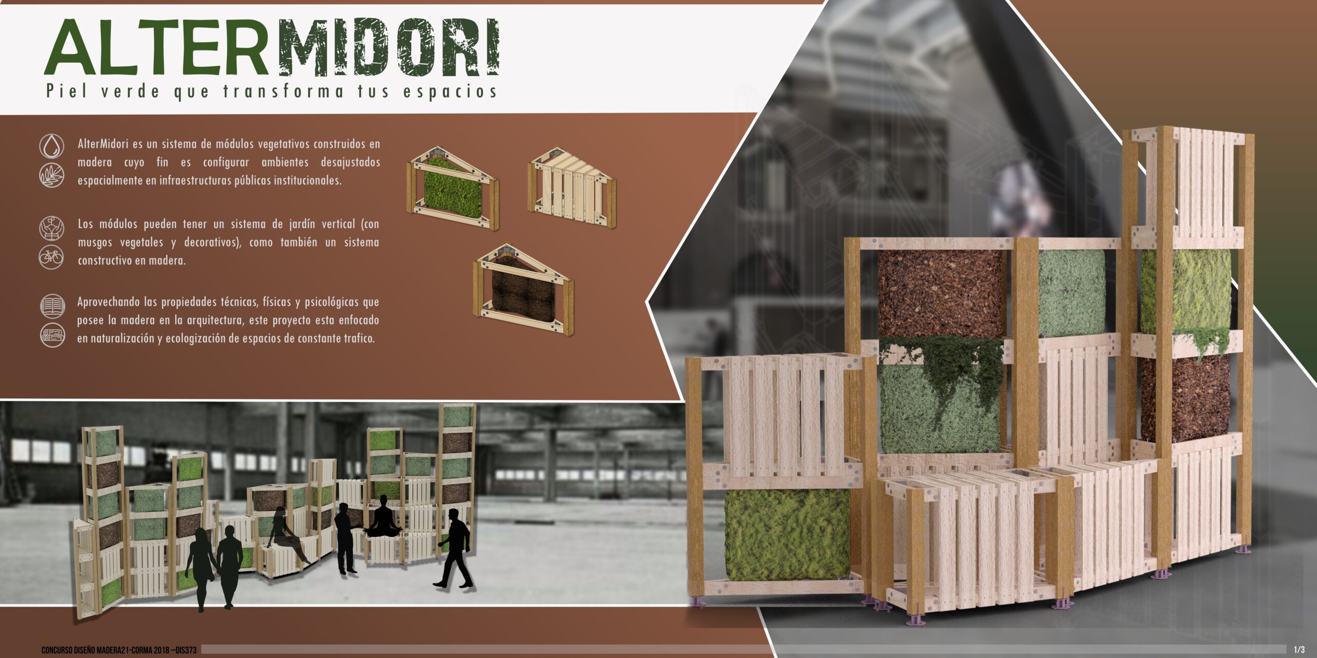 AlterMidori es un sistema de módulos vegetativos construidos en madera cuyo fin es configurar ambientes desajustados espacialmente en infraestructuras públicas institucionales. Aprovechando las propiedades técnicas, físicas y psicológicas que posee la madera en el diseño, este proyecto esta enfocado en naturalización y ecologización de espacios publicos de constante trafico. Los módulos pueden tener un sistema de jardín vertical (con musgos vegetales y decorativos), como también un sistema constructivo en madera.