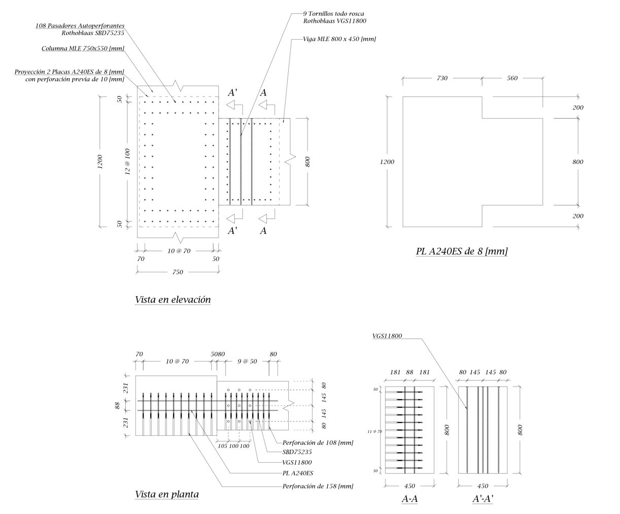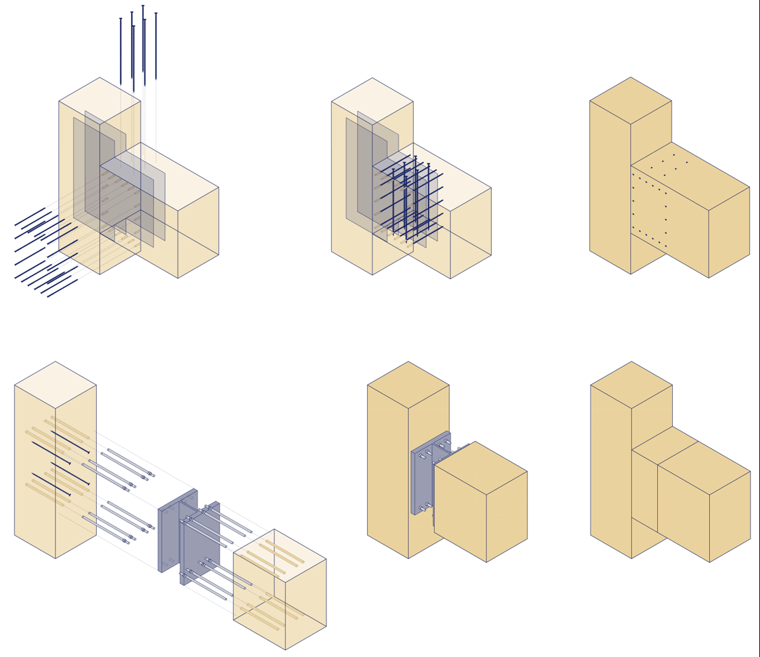 Self Drilling Dowels, similar a la tradicional perno-placa, reemplaza pernos por pasadores autoperforantes (SDD), capaces de perforar acero y madera. De esta forma, se evitan problemas con la rigidez inicial por sobre-perforación en agujeros y se induce un modo de falla dúctil por la esbeltez del conector. Adicionalmente, para evitar una falla frágil por