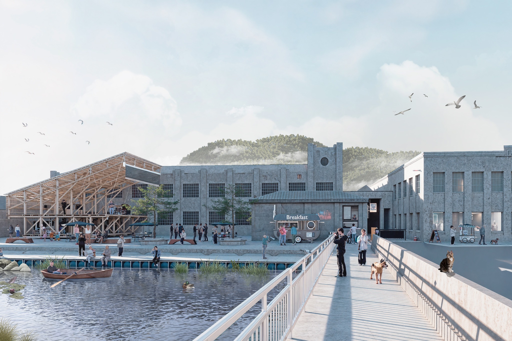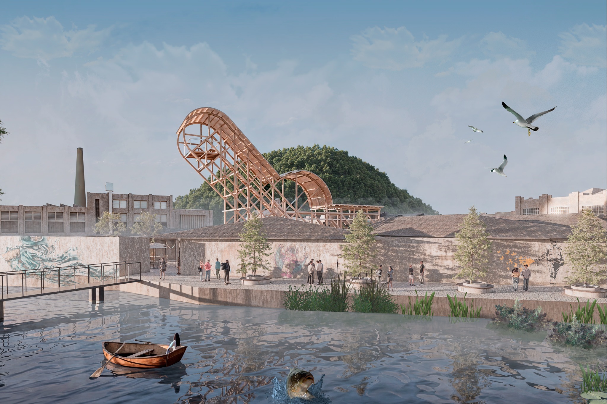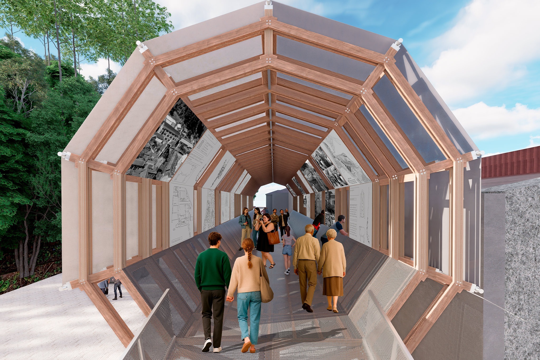 El proyecto reconoce el carácter peatonal de los paseos públicos de Tomé y propone uno nuevo que, en lugar de rodear la fábrica, la atraviesa. Este recorrido se construye con adoquines locales y conecta directamente el barrio Bellavista con la fábrica, integrándolo a la ciudad y activando su interior como espacio público a través de múltiples accesos. Estos puntos de entrada y salida permiten distintos recorridos, generando una experiencia única para cada usuario. Los Artefactos que componen el circuito se adaptan a las características espaciales de la fábrica y ofrecen distintos programas: el Anfiteatro, emplazado en el borde del río, invita a la comunidad con actividades culturales y espectáculos; la Muestra histórica introduce al visitante en el pasado textil de la fábrica y la ciudad; la Cafetería mirador ofrece un punto de descanso con vistas hacia el barrio Bellavista; y la Mediateca propone un espacio de permanencia flexible, compuesto por módulos que permiten usos diversos como lectura, juegos, talleres o zonas de descanso.