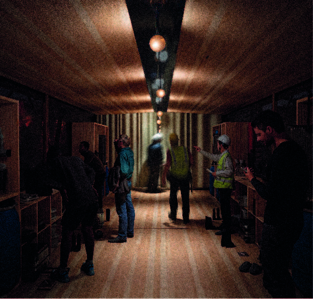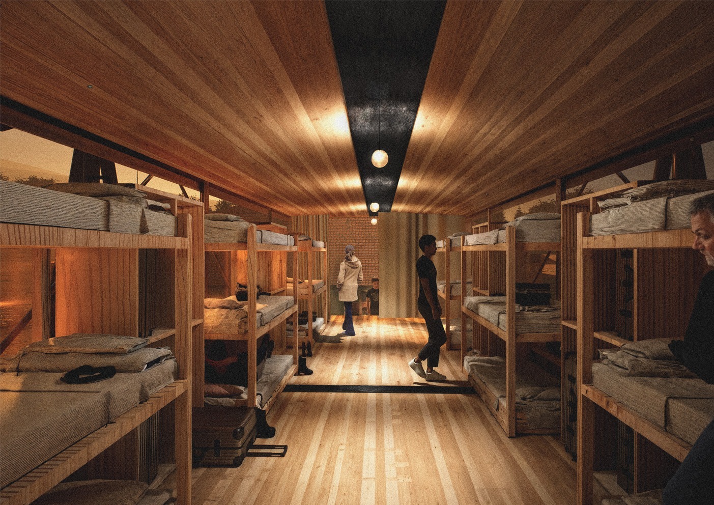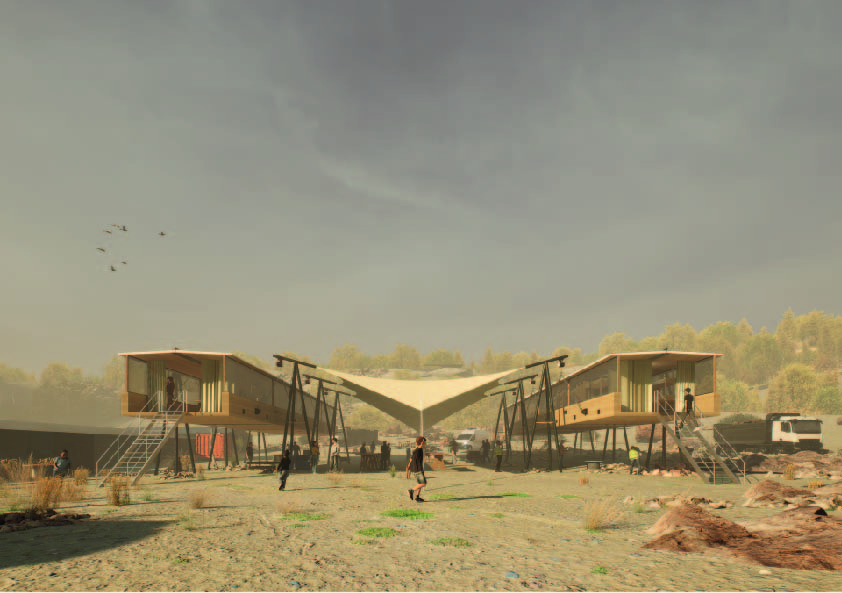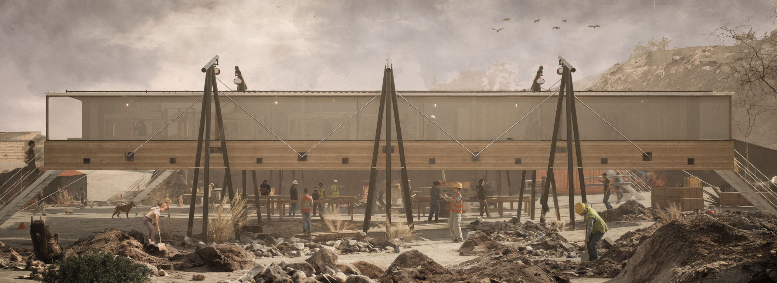 La arquitectura se desarrolla a partir de componentes de madera prefabricada, principalmente losas de CLT y vigas de madera laminada, que permiten estabilidad estructural con bajo peso. Estas piezas se ensamblan en seco y se levantan mediante tecles colgantes, sin necesidad de grúas ni maquinaria pesada. La madera, por su disponibilidad nacional y trabajabilidad en obra, se convierte en el material ideal para emergencias. Además, se incorpora una cubierta textil tensada que protege del sol y la lluvia ligera, aportando sombra y confort sin agregar complejidad constructiva. El sistema estructural suspendido y modular permite una arquitectura ligera, eficiente y respetuosa con el terreno.