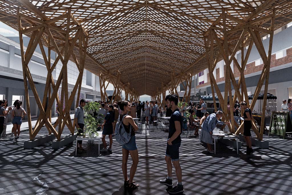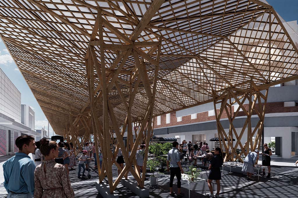 Frente a esta problemática, la propuesta "Bóveda de sombra urbana" se plantea como una infraestructura climática de bajo impacto. Se trata de una intervención ligera, reversible y no invasiva que, inspirada en la lógica del dosel arbóreo, reinterpreta la sombra como un elemento estructural, espacial y social. Más que una estructura convencional, la propuesta se concibe como un tejido estructural en madera, que actúa como una bóveda bioclimática suspendida, capaz de regular la radiación solar y redefinir la experiencia del espacio público.