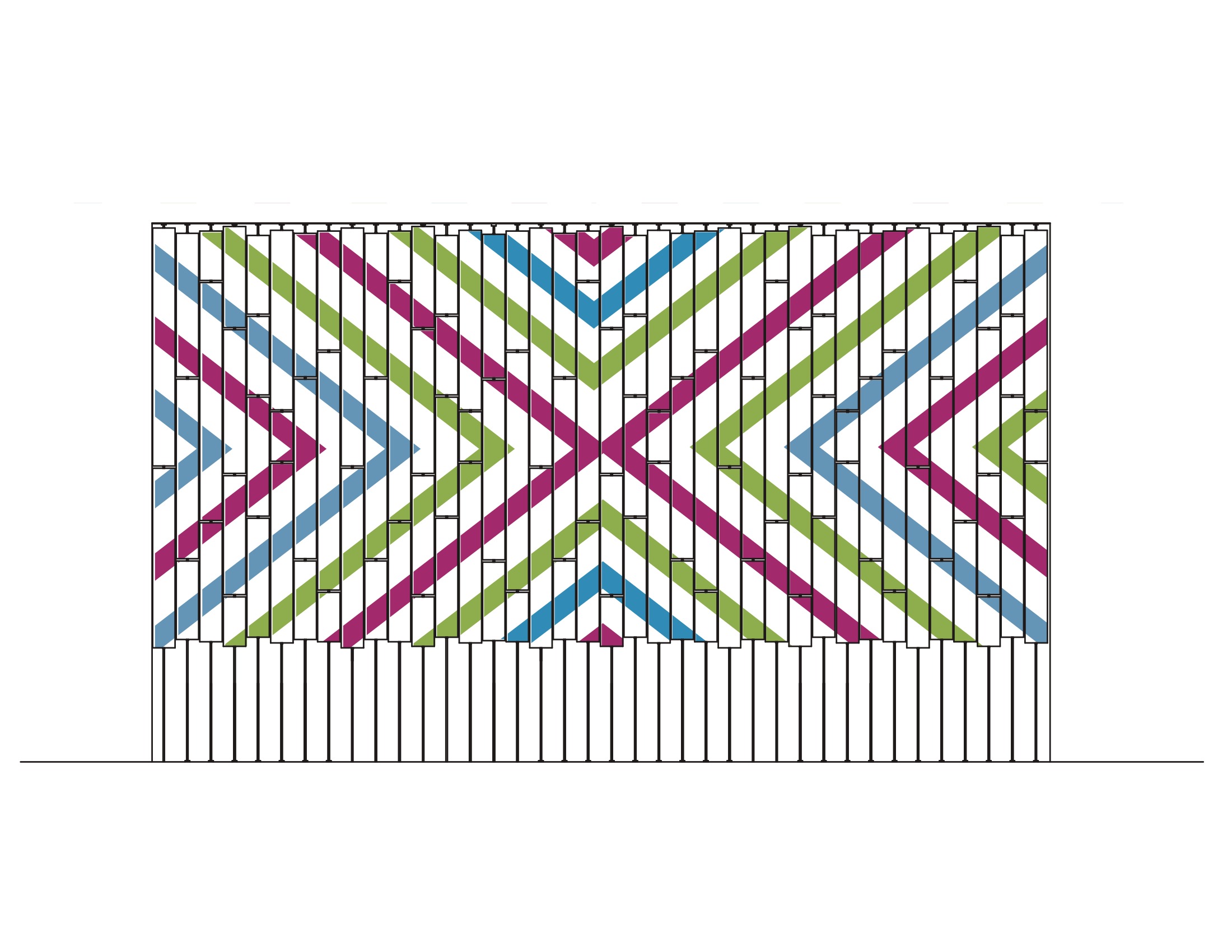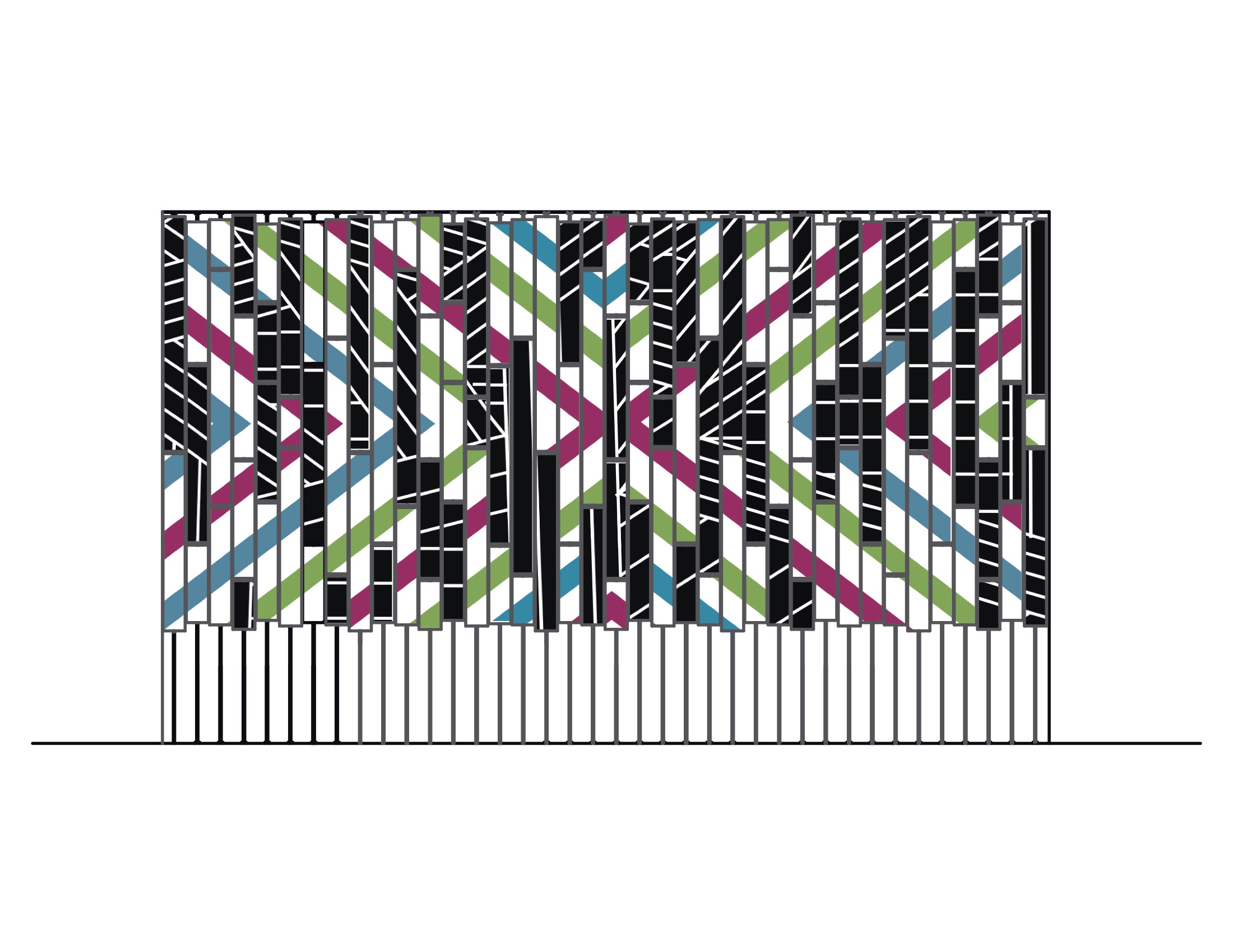 Brooklyn Wall está conformado de bloques de madera cortados en siete distintos tamaños, que tendrán un canal de 4mm de profundidad y 8 mm de ancho en el centro de una de sus caras desde la parte superior hasta la inferior, luego se encolaran dos bloques de la misma medida con las caras perforadas enfrentadas, cada uno de estos nuevos módulos será atravesado por un fierro con hilo, se apliarán y con tuercas se separarán, que llamaremos verticales. Una vez creado cada vertical, se ensamblarán en un marco con perforaciones que afirmaran a cada uno de estos y permitirá que cada bloque que confroman los verticales, gire en su eje. Cada bloque contara con un grafitti hecho en serigrafía; en una de las caras habrá un diseño en blanco y negro y por el otro habrá uno de colores, logrando que al girar los bloques de manera independiente se generen pixeles de la mezcla de ambos grafittis