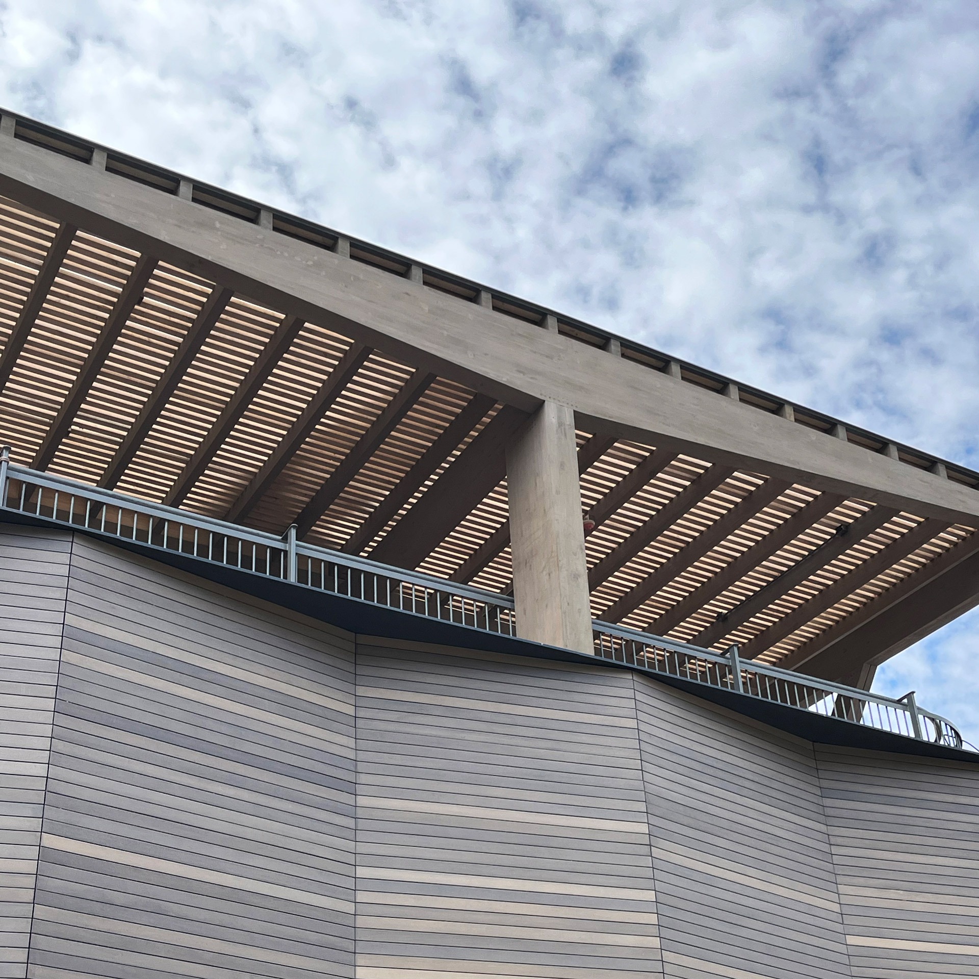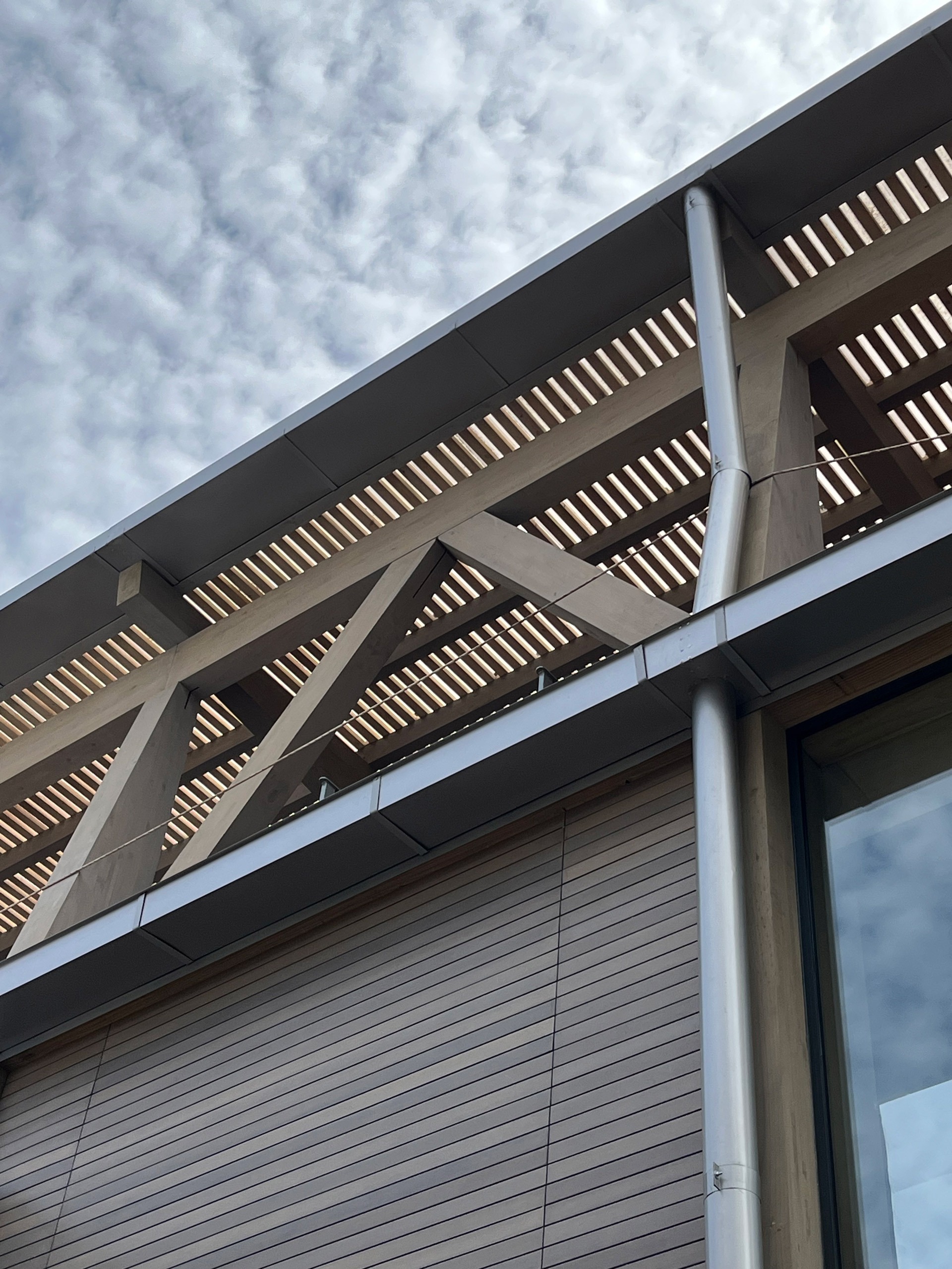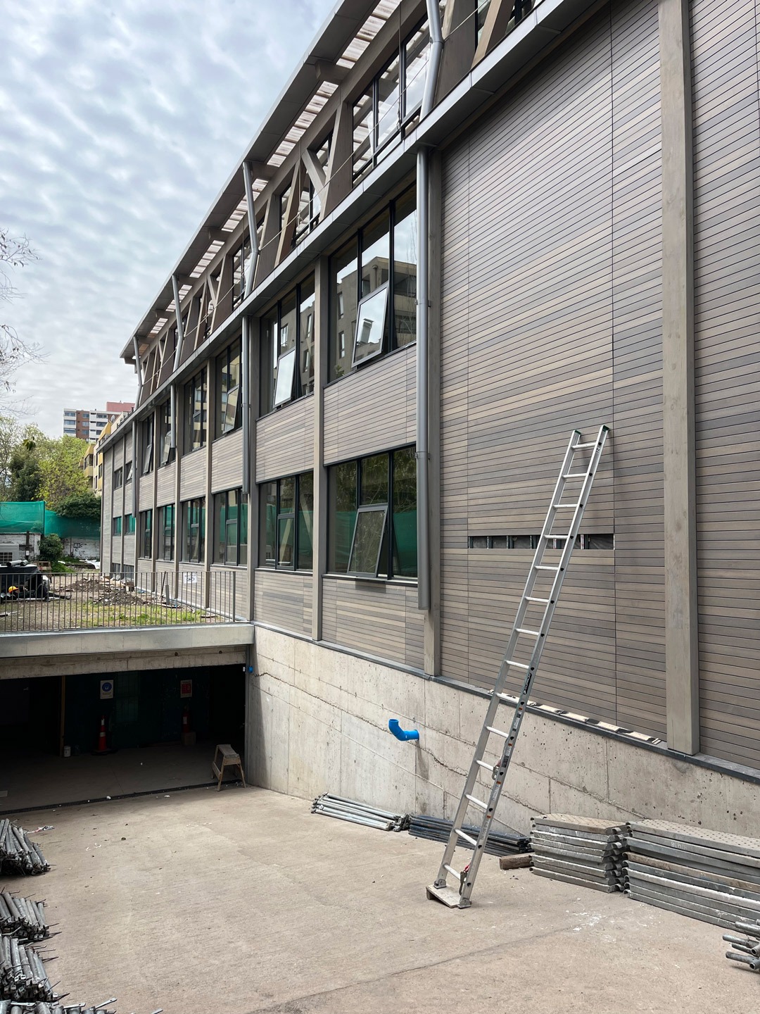 La estructura combina un zócalo subterráneo de hormigón con un volumen principal de madera: pilares y vigas laminadas, y losas CLT a la vista. La fachada ventilada de madera acetilada asegura durabilidad frente a humedad y agentes bióticos, mientras que la pintura Cutek Extreme protege la madera estructural laminada, preserva su tono y retrasa el desgaste. El diseño aprovecha las propiedades térmicas de la madera para mejorar el confort y reducir el consumo energético. La tornillería especializada Rothoblaas, Simpson y Mamut aportan uniones precisas, alto desempeño sísmico y un acabado limpio. El sistema constructivo seco favorece la mantención y el eventual desmontaje.