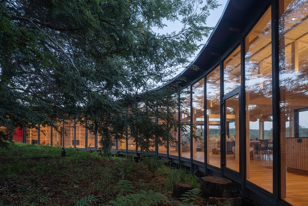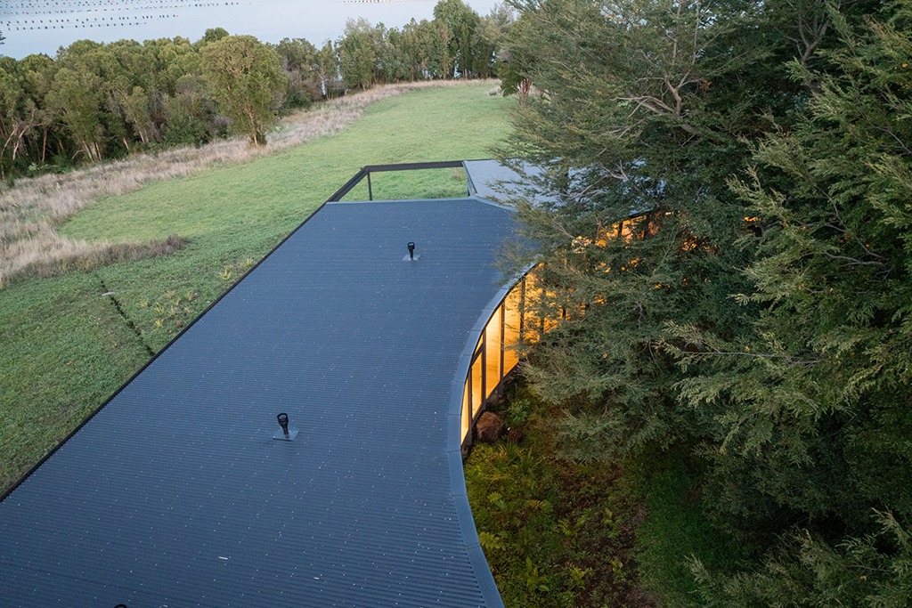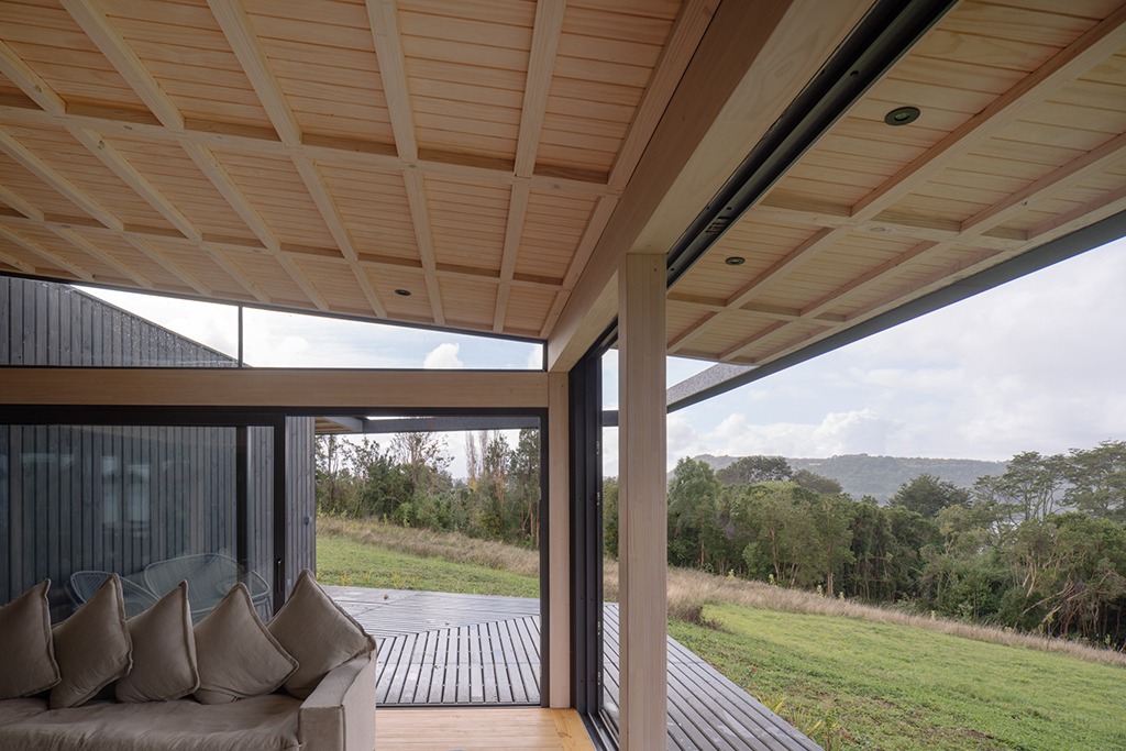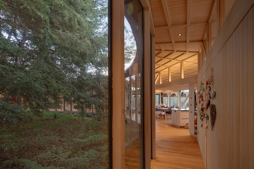 Emplazada en una suave ladera, dentro de un claro que bordea el mar, la casa se construye rodeando un conjunto de coihues existentes, abriéndose radialmente al sol y las vistas lejanas.