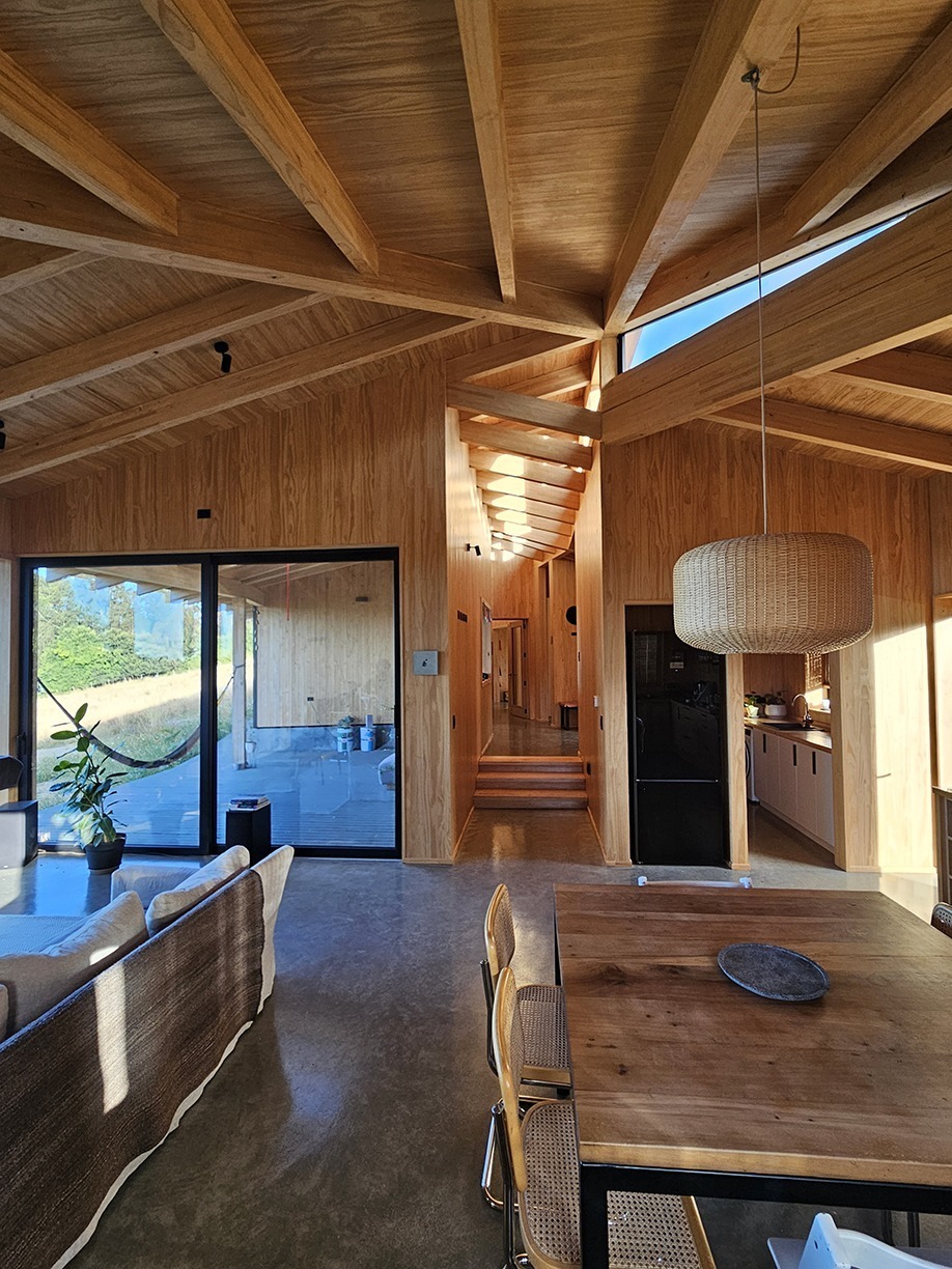 Desde el diseño hasta la ejecución, cada decisión responde a una lógica proyectual que integra el paisaje, la materialidad y el habitar cotidiano. La estructura en madera laminada, junto con sistemas de prefabricación y una envolvente térmica de alto rendimiento, permite demostrar que es posible alcanzar estándares contemporáneos de sustentabilidad y confort, sin sacrificar calidad espacial ni expresividad arquitectónica. Más que una respuesta funcional, la vivienda propone una forma de habitar consciente, en diálogo con el lugar y con una arquitectura que apuesta por lo esencial. Su contribución al desarrollo de la arquitectura en madera en el sur de Chile radica en la articulación coherente de técnica, material y paisaje como elementos indisociables de una arquitectura pertinente y duradera.