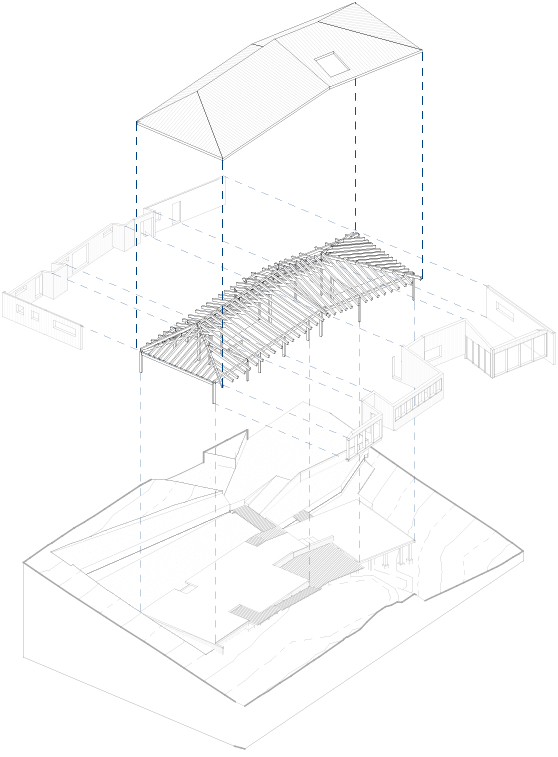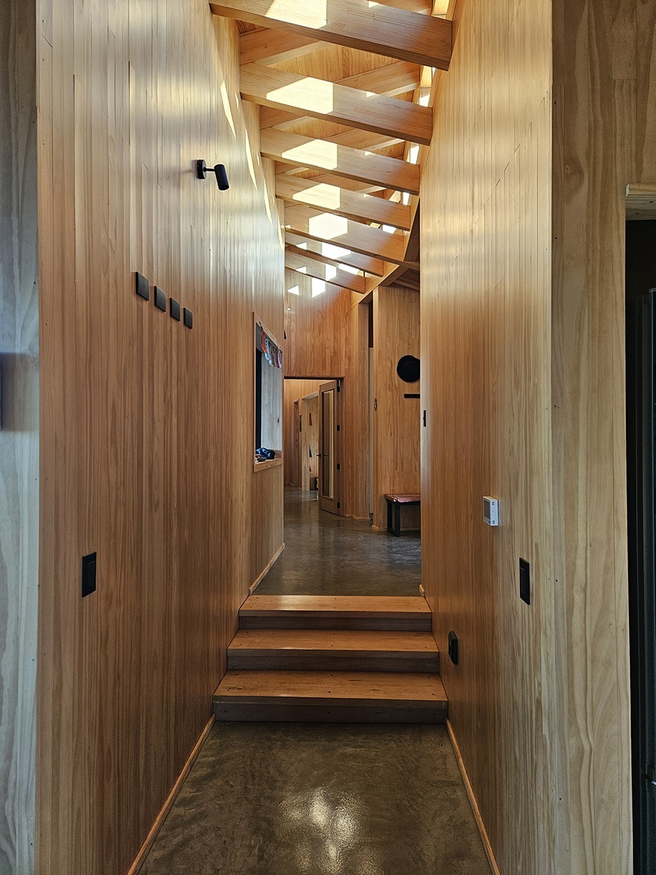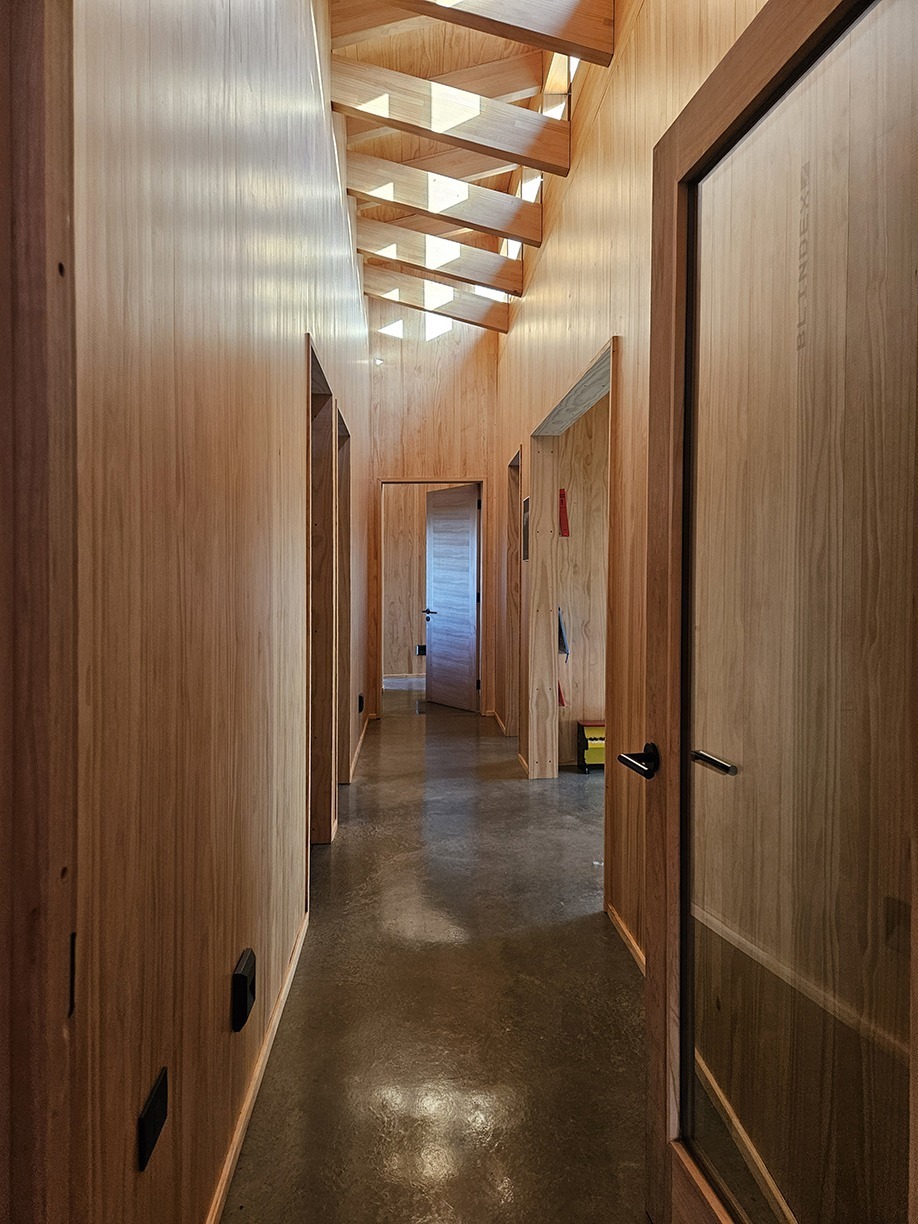 El encargo requería una solución eficiente en términos energéticos y constructivos. Frente a ello, se optó por la madera como material estructural y expresivo, valorando tanto su comportamiento térmico como su potencial para sistemas de prefabricación. La estructura principal fue mecanizada en madera laminada industrializada, provista por la empresa Timber, lo que permitió un montaje preciso, racional y de tiempos controlados. Sobre esta estructura se dispuso una envolvente de paneles SIP, que recubren el volumen de manera continua, reduciendo al mínimo los puentes térmicos y asegurando un alto estándar de eficiencia energética. Esta lógica constructiva permitió compatibilizar precisión técnica, habitabilidad y economía de medios, sin renunciar a una propuesta formal coherente y ajustada a su entorno.
