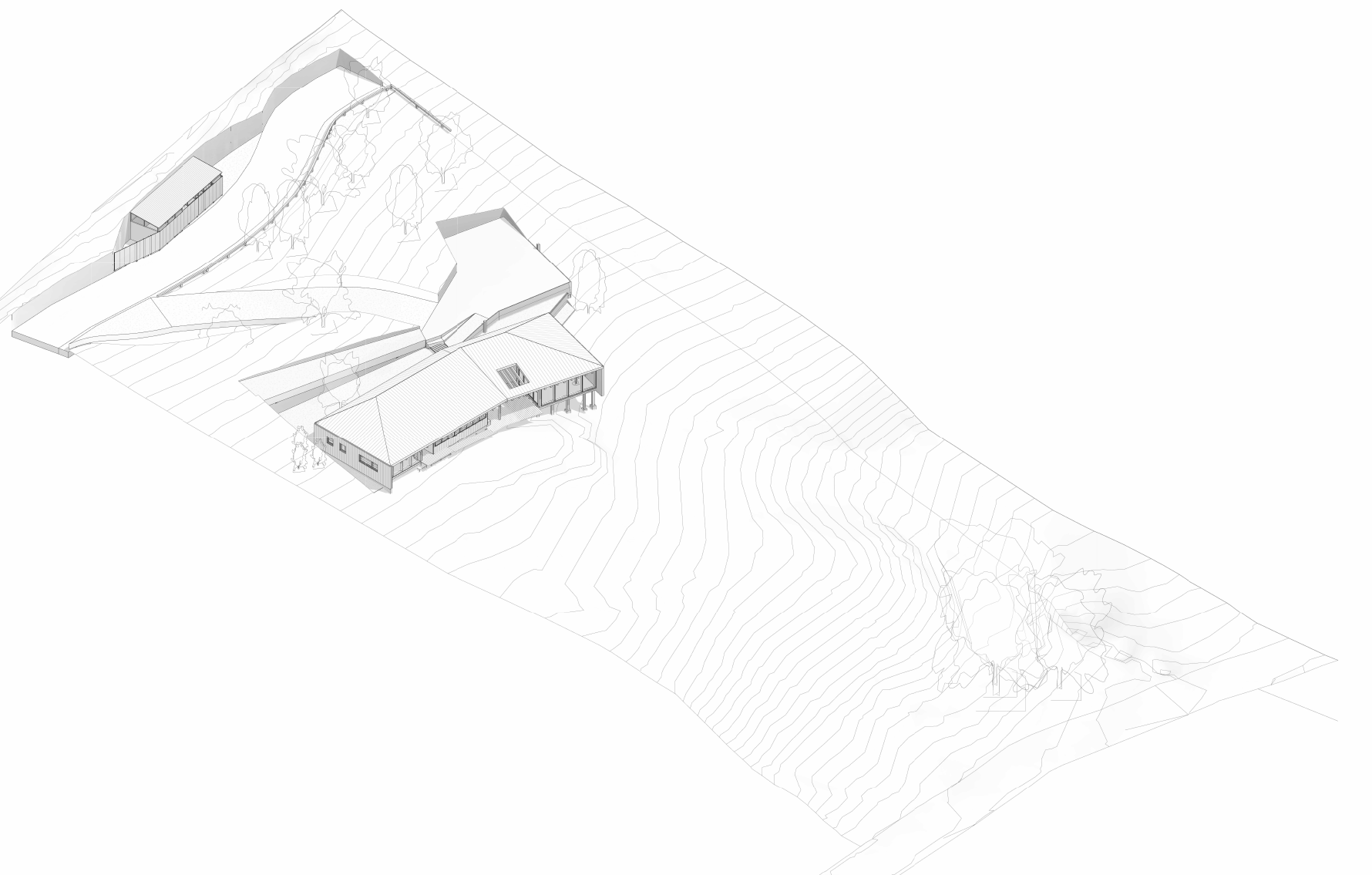 Casa CC se emplaza en la ladera sur de una colina en las afueras de Frutillar, con vista norte hacia el lago Llanquihue. El proyecto se organiza en torno a este paisaje, disponiendo los recintos principales estar, comedor y dormitorios se abren hacia el norte, mientras que los espacios de servicio se resguardan al sur. Una circulación longitudinal articula el programa, iluminada cenitalmente mediante una lucarna orientada al sur que introduce una luz difusa y constante al interior. La planta se adapta a la topografía mediante un quiebre en su trazado, el cual no solo permite acompañar el relieve natural, sino también establecer un quiebre que configura el acceso que articula el tránsito entre lo público y lo privado, a través de un patio cubierto que incorpora aire, luz y pausa al espacio.