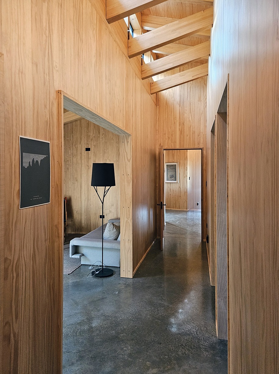La cubierta se concibe como un plano continuo que no solo protege, sino que envuelve parcialmente las fachadas oriente y poniente, reforzando la unidad del volumen. Este manto se reviste con hojalatería microondulada, provista por la empresa Arratia, resolviendo impermeabilización, durabilidad y expresión formal de manera unificada. La solución térmica se complementa con la envolvente SIP, generando un comportamiento térmico estable a lo largo del año. La vivienda se asienta sobre dos sistemas de fundación diferenciados: radier corrido en la zona de dormitorios y losa elevada sobre pilotes en el área pública. Esta decisión permite un ajuste preciso a las condiciones topográficas, evitando movimientos de tierra innecesarios y respetando la pendiente natural del terreno. Los pavimentos de radier afinado y vitrificado aportan robustez y contraste con la calidez de los interiores en madera natural.
