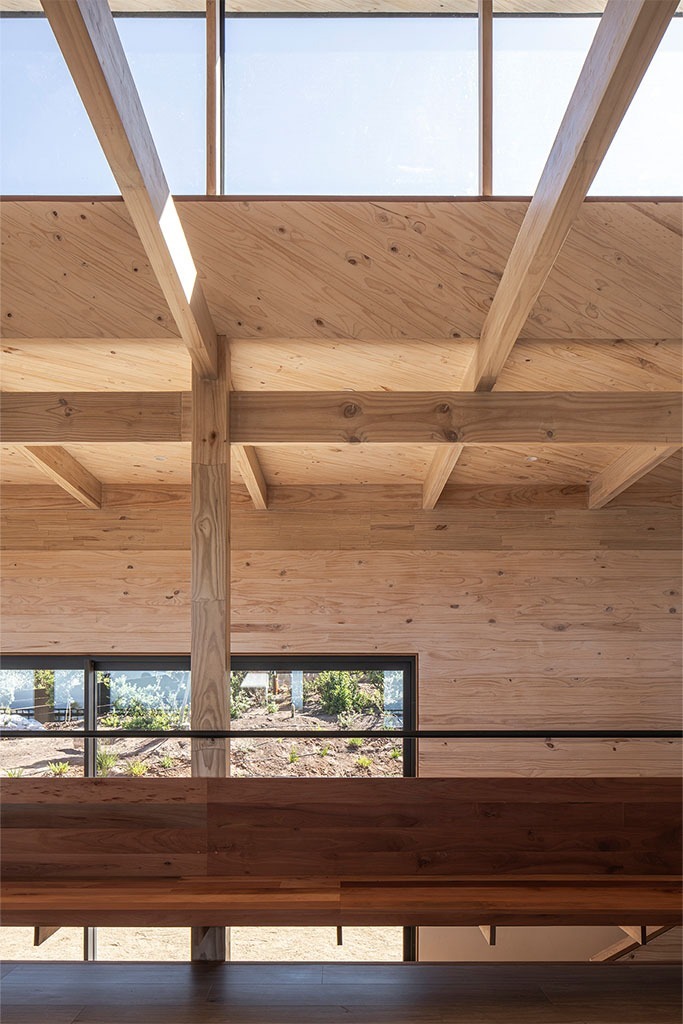 Cubierta y fachada ventilada. Para un buen desempeño térmico, considerando el clima y exposición solar de la zona central de Chile, se diseñó una fachada y una cubierta ventilada que evitan el calentamiento de la envolvente y mantiene fresco el interior. La forma de la cercha fue diseñada para provocar una aceleración del aire que es captado en el punto más bajo y sale con velocidad sobre la lucarna superior, enfriando la cubierta. Distintos usos – diferentes maderas. Para un mejor desempeño de la madera en el tiempo, se utilizaron distintos tipos de madera según el uso y requerimiento de cada elemento: eucaliptus en el piso para resistir con una madera suficientemente densa el roce propio del suelo; pino en la envolvente en general por economía y estabilidad de sus componentes y Raulí en los pasamanos y puntos de tacto y contacto con el cuerpo, por la densidad adecuada para el roce del cuerpo y contraste cromático con el pino.