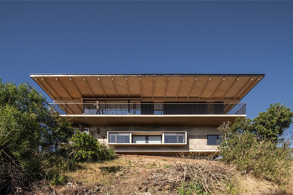 La casa se asienta en el cerro estableciendo un orden horizontal de tres estratos: zócalo, cuerpo intermedio y cubierta. El zócalo de hormigón que contiene el espacio de los dormitorios define un primer horizonte cercano al suelo, a la altura de las copas de los árboles que crecen en el fondo del terreno. Sobre este zócalo se levanta un entramado liviano de madera, que envuelve los espacios comunes de la casa – hall de acceso, living, comedor y cocina – definiendo un segundo horizonte sobre las copas de los árboles, con las vistas despejadas hacia el mar y los cerros. En un nivel intermedio se ubica la galería de los niños con acceso directo al patio que queda contenido entre la casa y el cerro, resguardado del viento. Un techo de estructura de madera laminada y grandes aleros corona la casa, protegiéndola del sol y de la lluvia.