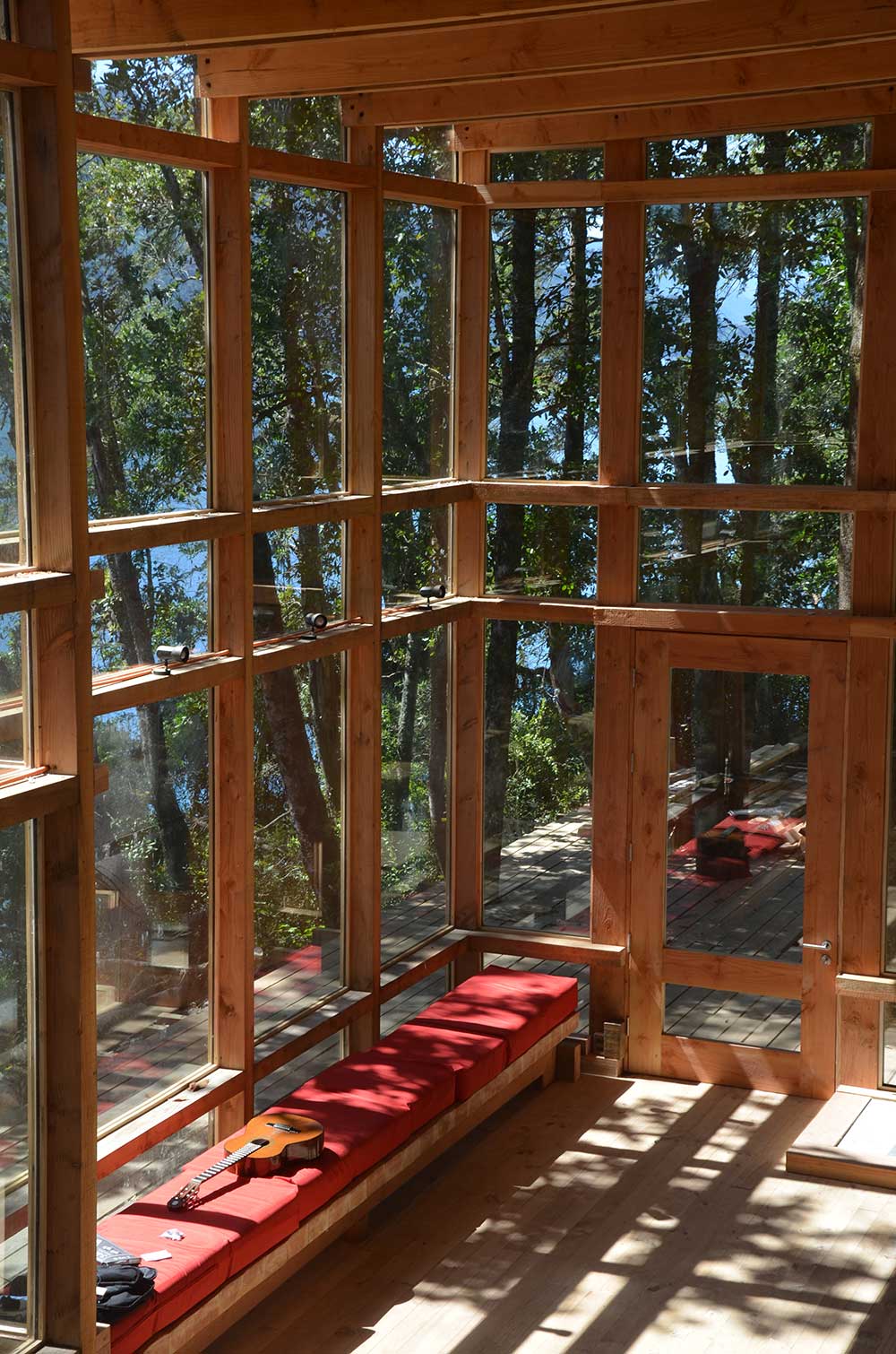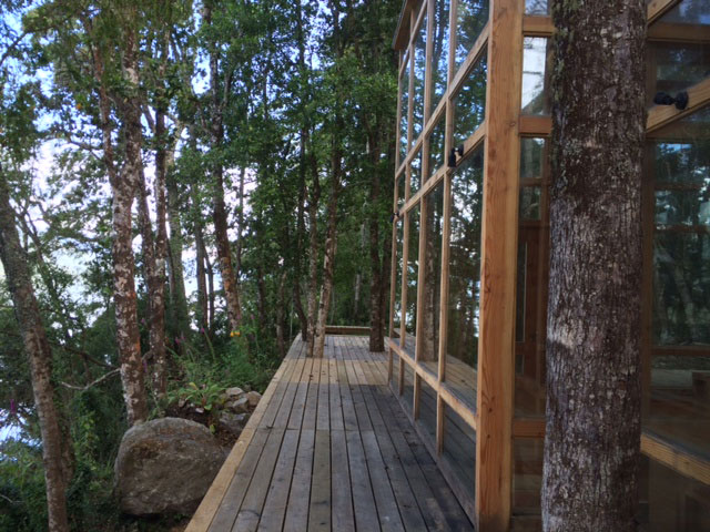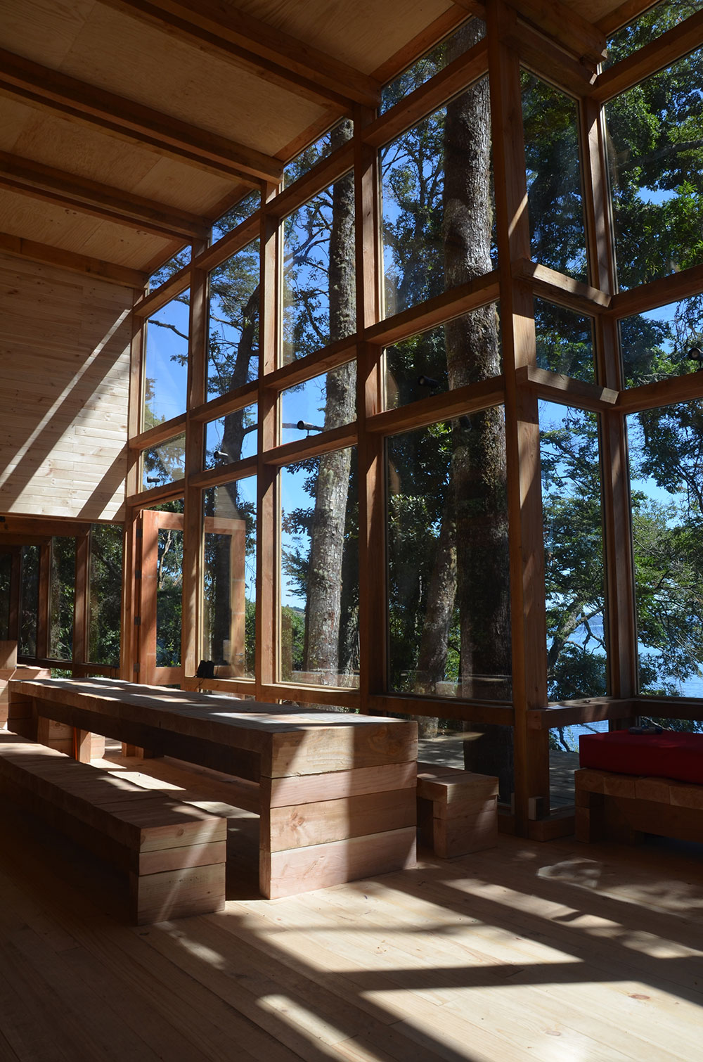 La terraza continúa hacia el lago en un desnivel construyendo un segundo volumen donde la idea era construir un espacio exterior protegido, que permitiera estar en el bosque sin perder las vistas tanto hacia el lago, el bosque y hacia el cielo a través de las ramas de los árboles, lo que determina su altura.