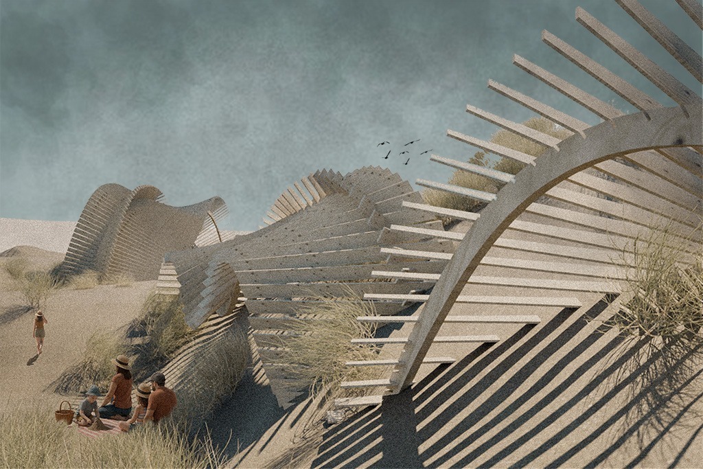 La madera es el único material del proyecto, elegida por su biodegradabilidad, resistencia y comportamiento natural frente a la humedad. Las costillas de CLT estructuran la intervención, mientras que listones de madera de tapa por su delgadez y porosidad se ensamblan sin fijaciones externas, aprovechando la dilatación de la madera para ajustar las uniones. Esta porosidad no solo permite flexibilidad estructural, sino que también colabora activamente en la captación y desaceleración de arena transportada por el viento. El sistema constructivo, simple y preciso, permite levantar una estructura limpia, adaptable y fácilmente desmontable o transformable. La arquitectura nace desde el material y su comportamiento en el entorno, más que desde una estética impuesta. En su relación con el clima y el terreno, la madera permite que la estructura envejezca con dignidad, se funda naturalmente con el paisaje y contribuya al proceso de formación dunaria.
