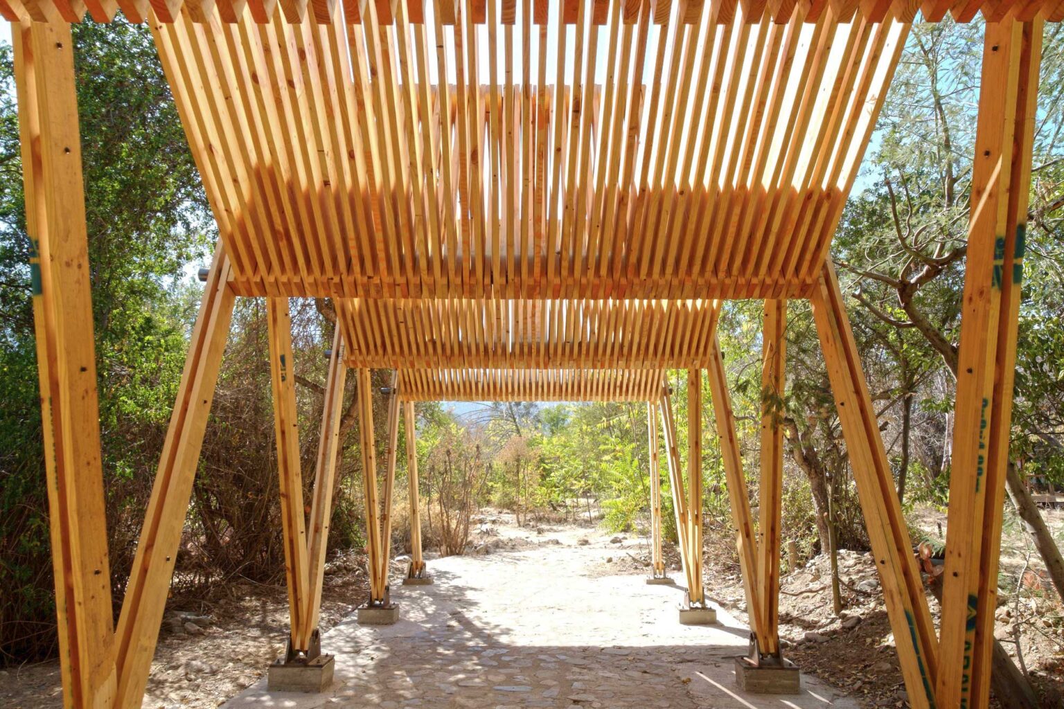 La necesidad de construcción con mano de obra de la propia familia o de la comunidad, implica la facilidad de ejecución del proyecto. Toda la propuesta se realiza con el mismo listón estándar de madera de pino cepillado seco de sección 2×8” de Arauco; estos se disponen a modo de tejido como un gran telar que se sostiene a compresión mediante la presión de un tubo de acero de 9 cm de diámetro que los atraviesa a la vez que formaliza la articulación entre piezas. La longitud del listón es de 4,5 m para los apoyos, y de 1/3 más 2/3 de 4,5 m para la cubrición.