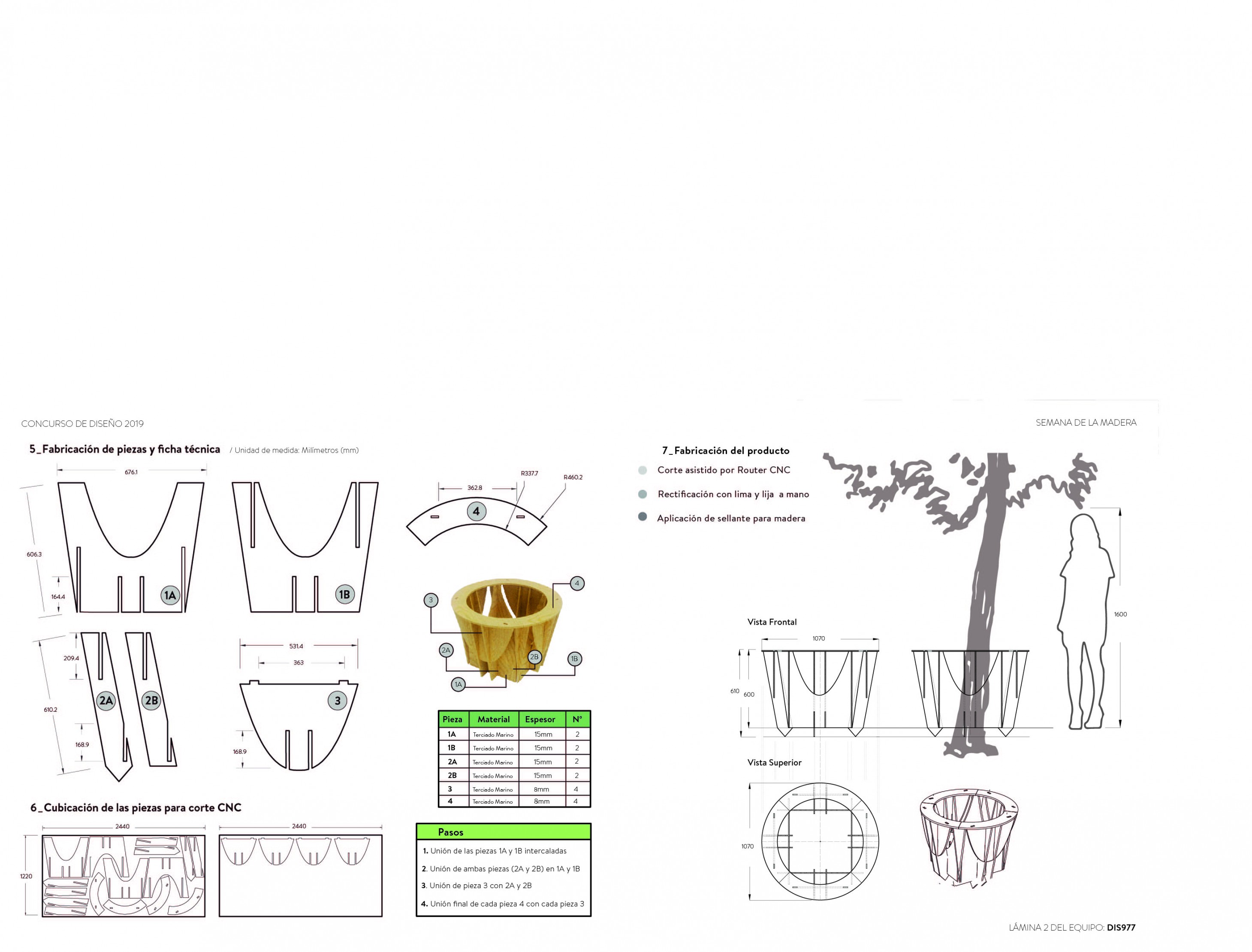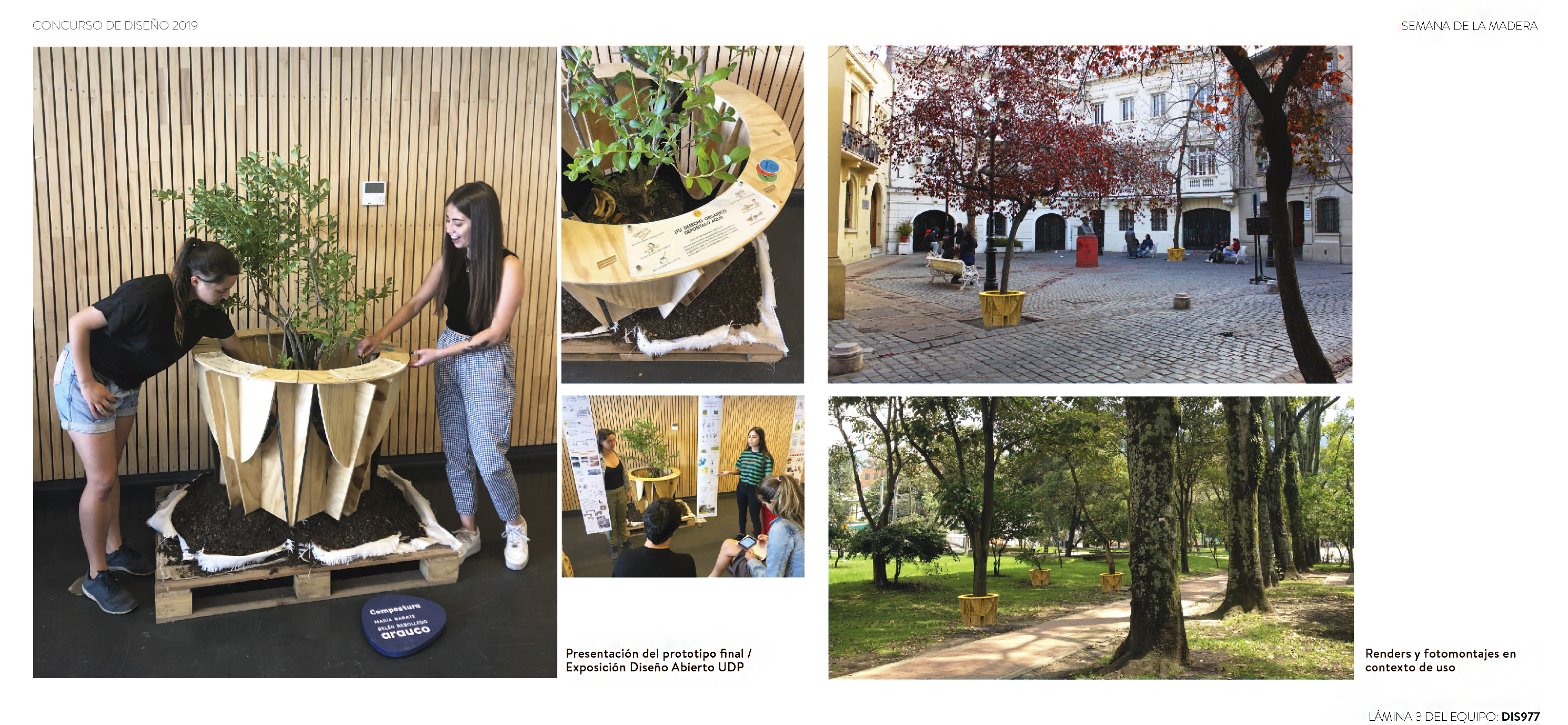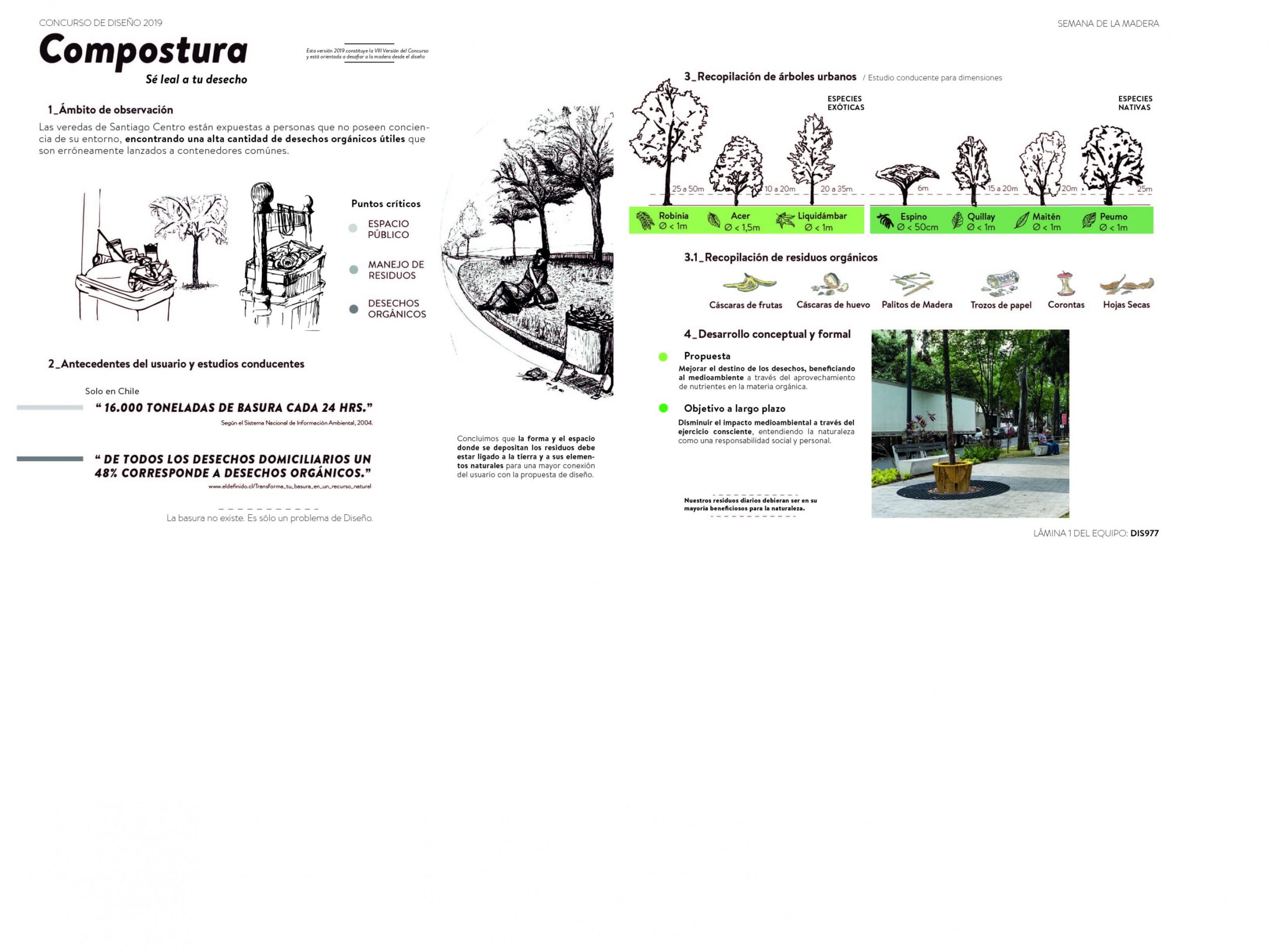 Entendiendo el alarmante escenario chileno en cuanto a producción y manejo de residuos, y observando las calles y basureros de Santiago Centro, nos sorprendió encontrar una alta cantidad de desechos orgánicos. Fue una observación que pareció mínima al principio, pero que luego le otorgó todo el sentido a nuestra propuesta. Notamos que, dentro de las áreas terrosas, en especial alrededor de árboles, se encontraban muchas veces, 1: Colillas de cigarrillos, 2: Cáscaras de plátano y 3: Corontas de manzanas; la primera nos sorprendió mucho como desecho, pero nos pareció una clara evidencia del mal hábito y la poca conciencia del consumidor de tabaco; sin embargo, las segundas nos hicieron reflexionar un poco más allá. Resulta que mucha gente asocia generalmente los residuos de fruta como “buenos para la tierra” por lo cual para algunos transeúntes era bastante lógico y común desecharlos donde encontrasen tierra, es decir alrededor de los árboles. Aquí fue donde encontramos nuestro potencial de diseño. Recopilamos dimensiones de troncos en árboles urbanos de Santiago y aprovechamos este espacio de tierra, que por lo general se encuentra rodeando a cada especie, para generar un contenedor de desecho orgánico, o comúnmente conocido como Compostera, y así invitar al transeúnte a depositar su desecho orgánico junto al árbol, entregando información "personal" acerca de cada especie y de los tipos de desechos orgánicos compatibles. ¿Por qué el énfasis en el desecho orgánico? Porque son los desechos que la naturaleza puede manejar a corto plazo y sin mucho trabajo extra; Porque son producto de nuestro consumo diario, pero debido a nuestro desconocimiento los desechamos en lugares donde más que ser un aporte terminan perjudicando el manejo de residuos, y finalmente con las nuevas tendencias que se masificarán en los próximos años como el Zero Waste, estos serán casi los únicos tipos de desechos que debiéramos generar. Hay que recordar que casi no queda tiempo para que logremos revertir el inminente colapso ambiental que hemos generado en los últimos 100 años. Hoy más que nunca debiéramos discutir y solucionar la forma en la que estamos produciendo, consumiendo y desechando cada día elementos que debieran, luego de cumplir sus ciclos de uso, retornar al lugar del que vinieron, la tierra. Esta “Compostera urbana” funciona por encaje de 6 piezas diferentes; todas fueron fabricadas a partir de una placa y media de madera, cortadas por una máquina Router CNC y posteriormente impermeabilizadas. El total de las piezas fueron pensadas para ensamblarse sin necesidad de pegamento o tornillos, haciendo más sustentable su producción e instalación. Esperamos que este diseño transforme el espacio público en un lugar más habitable, al tomar una postura consciente y colectiva