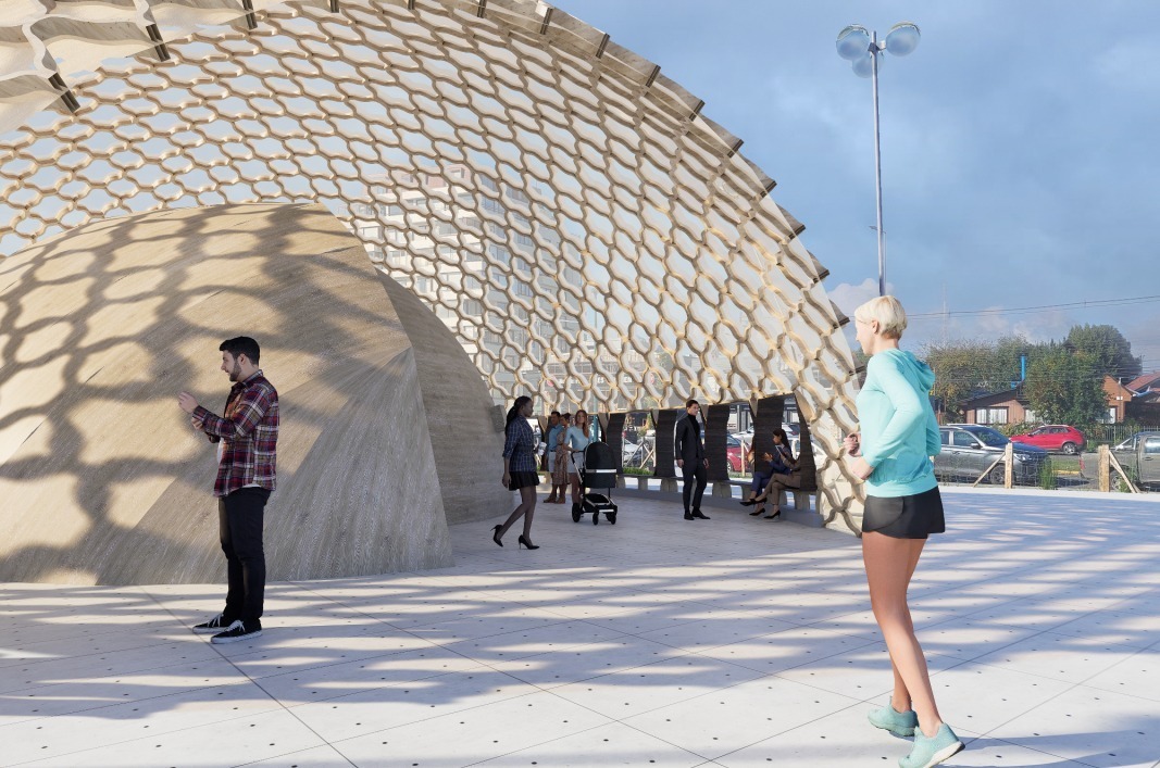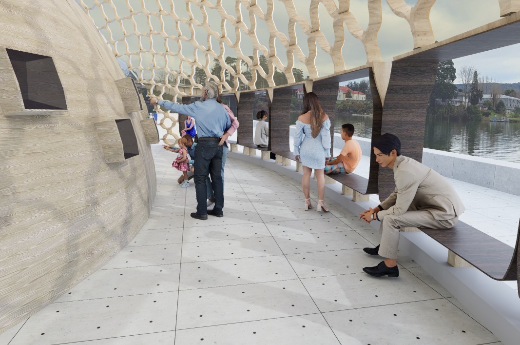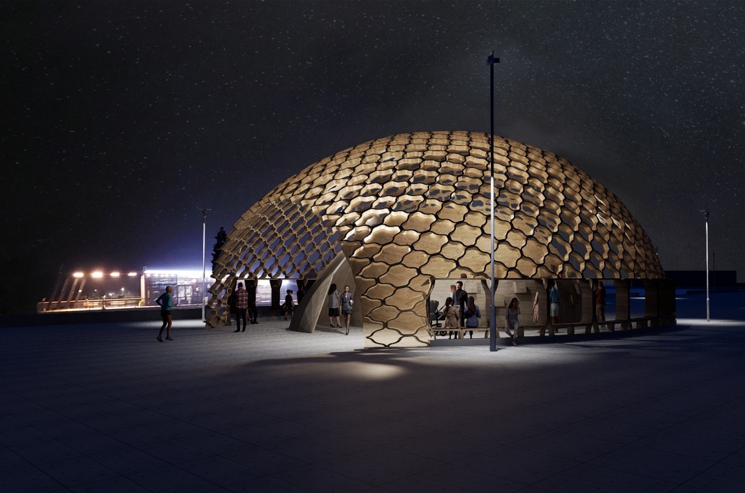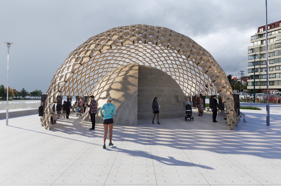 La propuesta reinterpreta la madera desde una lógica contemporánea, superando sus usos tradicionales para posicionarla como protagonista estructural, espacial y sensorial. Se utiliza madera laminada precurvada, trabajada mediante curvado a vapor y mecanizado CNC, permitiendo libertad formal, precisión técnica y eficiencia en el montaje. La estructura curva, de desarrollo orgánico, define un espacio fluido y ligero, capaz de cubrir amplias luces con bajo peso estructural. Se incorpora además madera translúcida en la envolvente exterior, explorando sus cualidades físicas para generar atmósferas cambiantes según la incidencia de la luz natural. Esta doble piel aporta control térmico pasivo, protege del clima y potencia la experiencia inmersiva sin depender de dispositivos tecnológicos. La madera, en sus distintas expresiones, contribuye a construir una experiencia espacial sensible, donde las variaciones de luz, sombra y temperatura permiten una percepción envolvente del espacio. Su origen renovable y su bajo impacto ambiental consolidan su pertinencia en una arquitectura efímera, sustentable y replicable.