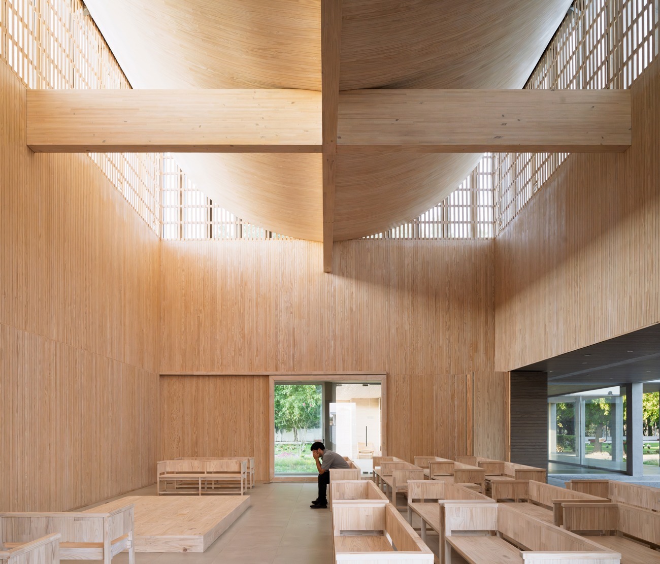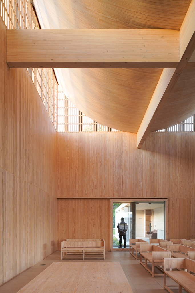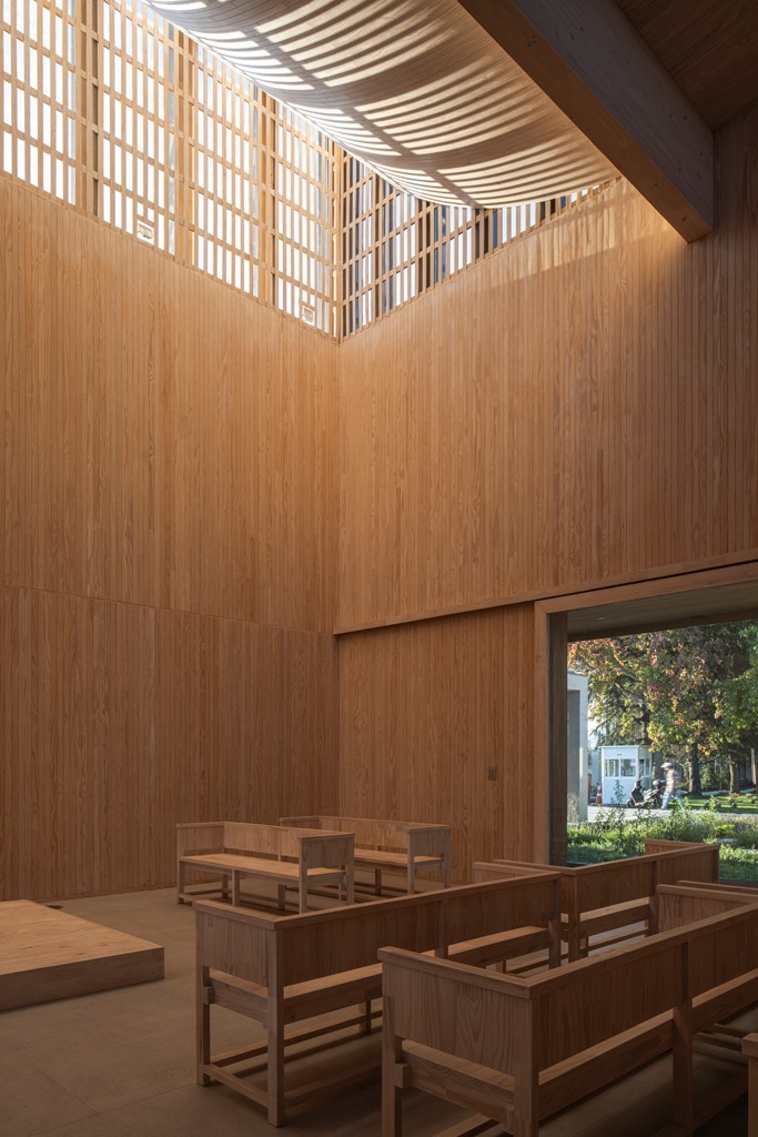 La condición material, se plantea como uno de los temas centrales del proyecto el que lo determina y posibilita, en donde su espacio primordial de tres alturas y principal del edificio, se construye completamente en madera, estructurándose con pilares y vigas laminadas en su perímetro, mientras una gran cruz superior (también laminada) rigidiza esta gran caja y sostiene su cúpula invertida, la que busca que la luz sin importar la hora entre al proyecto, filtrándose y tamizándose por la parte alta para así construir un interior tenue, de introspección y oración que además, varía esta condición lumínica a lo largo del día con diferentes intensidades y reflejos. De esta forma se construye un volumen mono material que posee la opción de abrirse a su patio duro a través de grandes puertas plegables, las que permiten así ampliar su capacidad y realizar ceremonias al aire libre El proyecto buscó ser eficiente en su construcción a través de un sistema de montaje en base a piezas prefabricadas de madera, las que fueron montadas partiendo por el volumen central al utilizar un esqueleto estructural de pilares y vigas de madera laminada con sistemas mecanizados y uniones de encajes entre si, para luego montar los volúmenes de sus extremos(demorando una semana en montarse la estructura principal del proyecto).