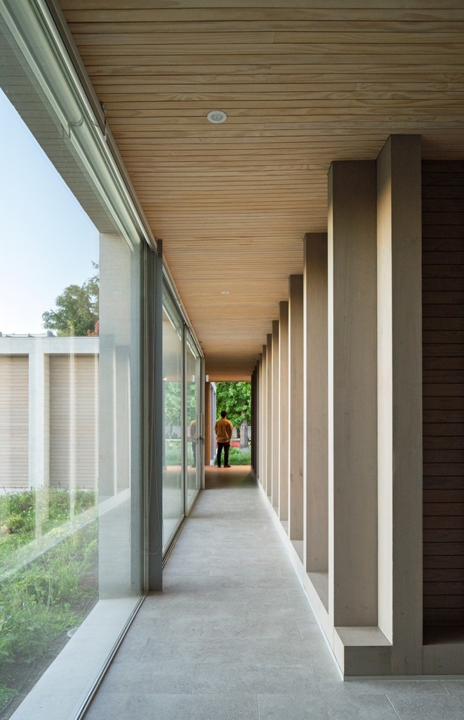De este modo, el proyecto da cuenta de cómo un edificio institucional puede realizar un uso integral de la madera y sacar partido de su sistema constructivo. Desde la “madera tecnologizada” empleada en la estructura principal (con herrajes que la anclan al suelo y uniones caladas), capaz de cubrir alturas de tres pisos con piezas estructurales completas y colgar una gran cubierta, hasta el uso realizado con la madera tradicional, que resuelve sus muros ventilados y aislados además de cielos y cubiertas, propiciando todo esto en total, obras secas de montaje limpio y rápido, con uniones precisas que minimizan fallas y mejoran los tiempos y por tanto costos del proyecto. Para así, el resultado final construya un proyecto que exprese en todo momento su materialidad y estructura desde el interior al exterior, buscando crear una atmosfera de luz, continuidad material, vacío y relación con el paisaje, entregando la posibilidad de utilizar un material local, ecológico y cálido.