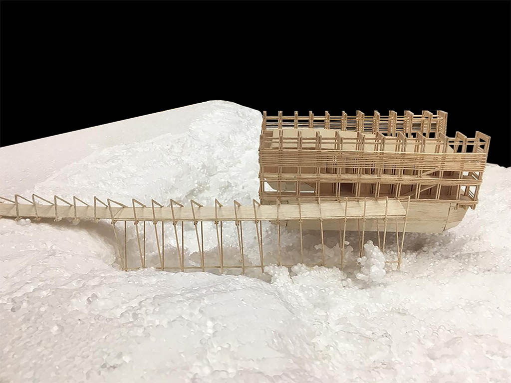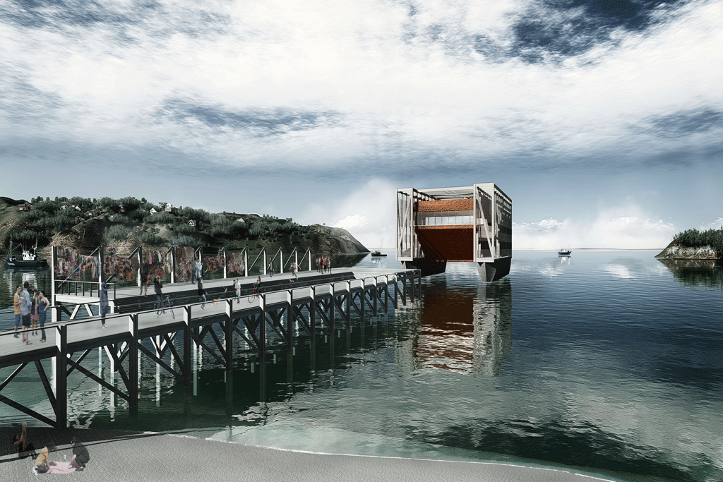 Técnicamente, reconocemos el catamarán como oportunidad arquitectónica, al tratarse de una tipología de embarcación que otorga gran estabilidad, pues sus dos naves laterales funcionan como soporte y flotadores que contienen y estructuran un gran volumen central, dando lugar al espacio del teatro. El muelle que conecta al teatro con tierra, se propone como un espacio flexible para la comunidad, proporcionando el soporte para los usos que esta crea idóneos, ya sea para el trabajo artesanal típico de la zona o para actividades recreativas, deportivas, u otras.