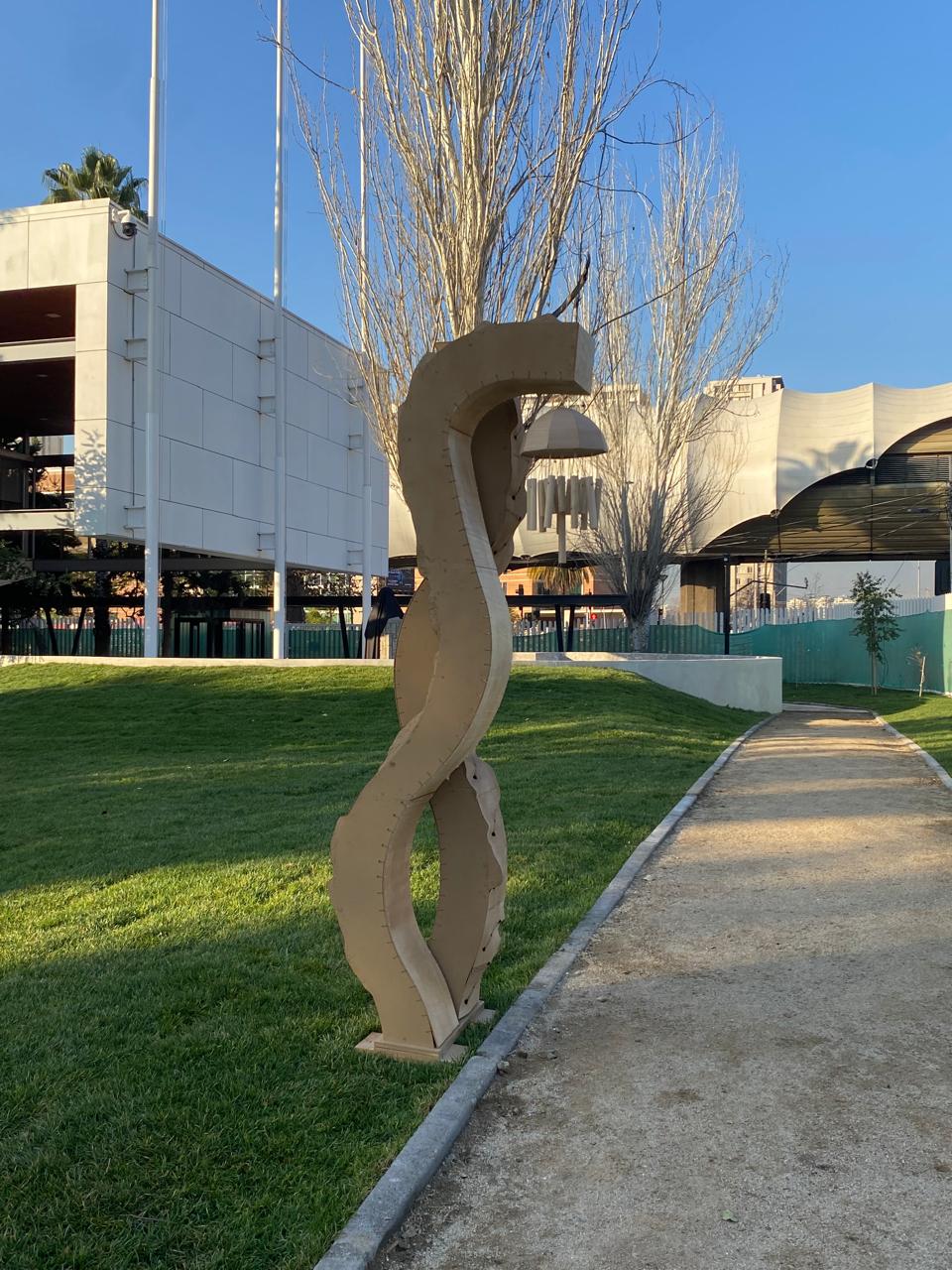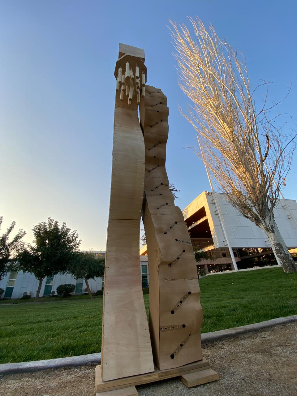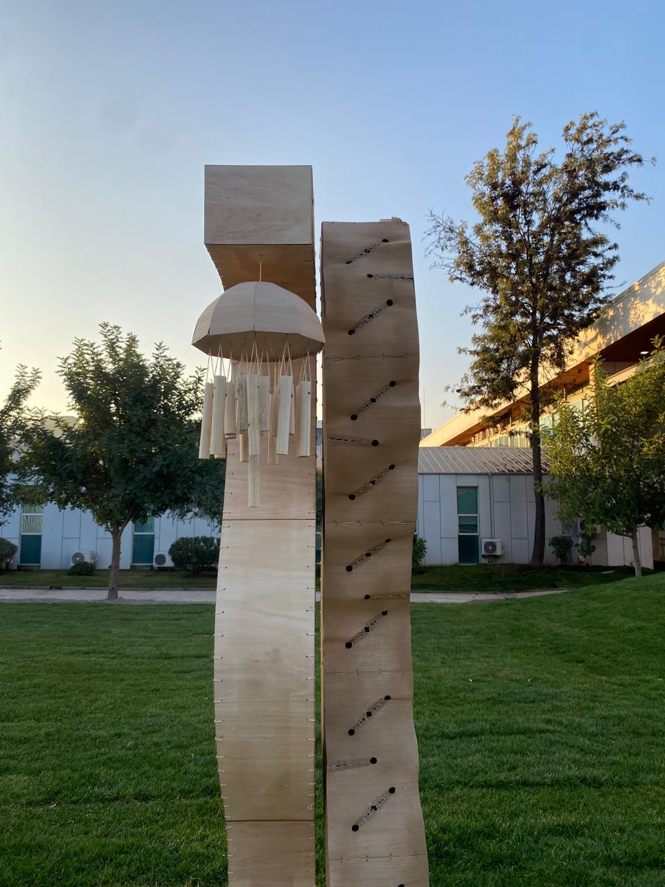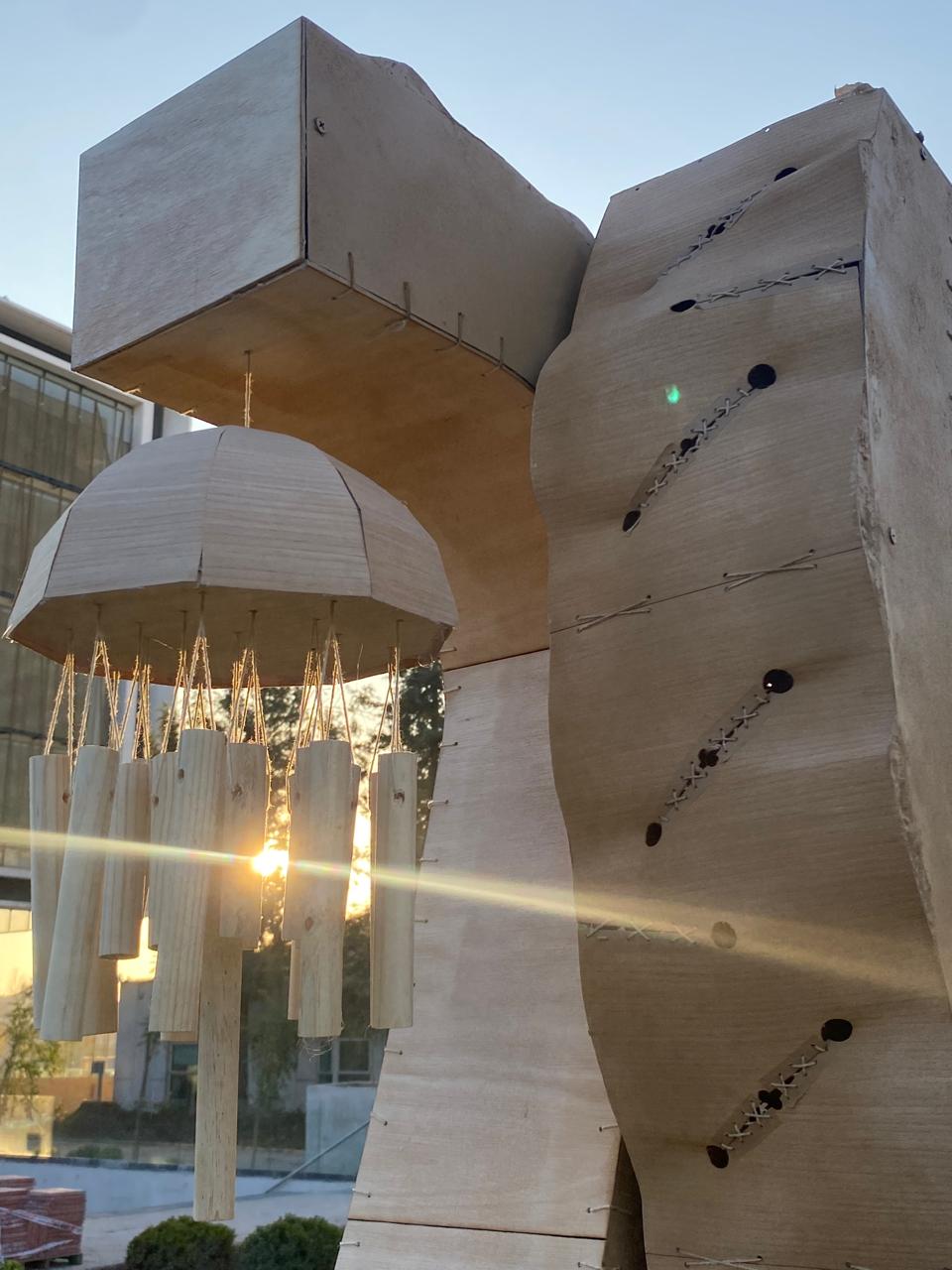 Se observa que en la actualidad existe una carencia de estructuras y productos que promuevan el descanso mental y creativo. Los espacios urbanos, al ser altamente transitados, evidencian la necesidad de generar zonas que permitan pausas y fomenten la desconexión. Con las técnicas aprendidas y reforzadas, se plantea una solución que integra curvas y ondas mediante métodos de curvado y modelado, reflejando un lenguaje formal dinámico que invita a la interacción y al descanso. La propuesta se desarrolla a partir de una estructura de MDF que se recubre en ambas caras. El recubrimiento interior se resuelve con terciado de eucaliptus curvado: uno de los postes presenta un revestimiento interior continuo. El recubrimiento exterior se realiza con una técnica de hilado en ángulo, generando una superficie texturizada y ondulada en la chapa de madera. Además, el poste con el extremo más curvo integra un objeto sonoro fabricado con chapa y varillas de madera, diseñado para producir un sonido suave y controlado, favoreciendo el descanso mental y creativo. La estructura permite generar puntos de iluminación y sonido orientados al descanso mental y creativo, contribuyendo a mitigar la falta de espacios de pausa en la ciudad. De esta forma, la madera no solo cumple una función estructural y estética, sino que también refuerza el carácter sostenible y acogedor de la intervención.